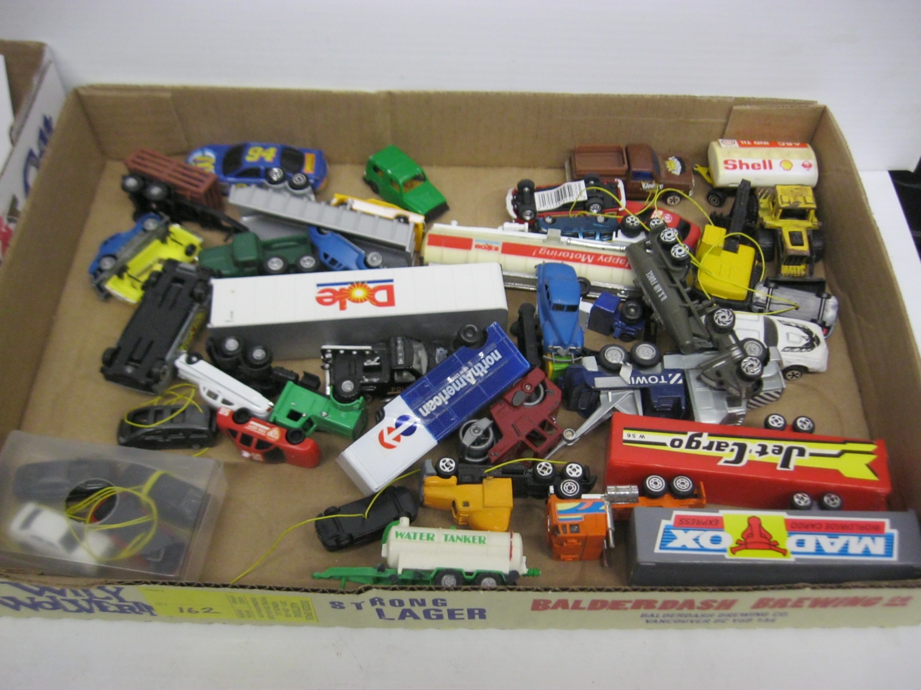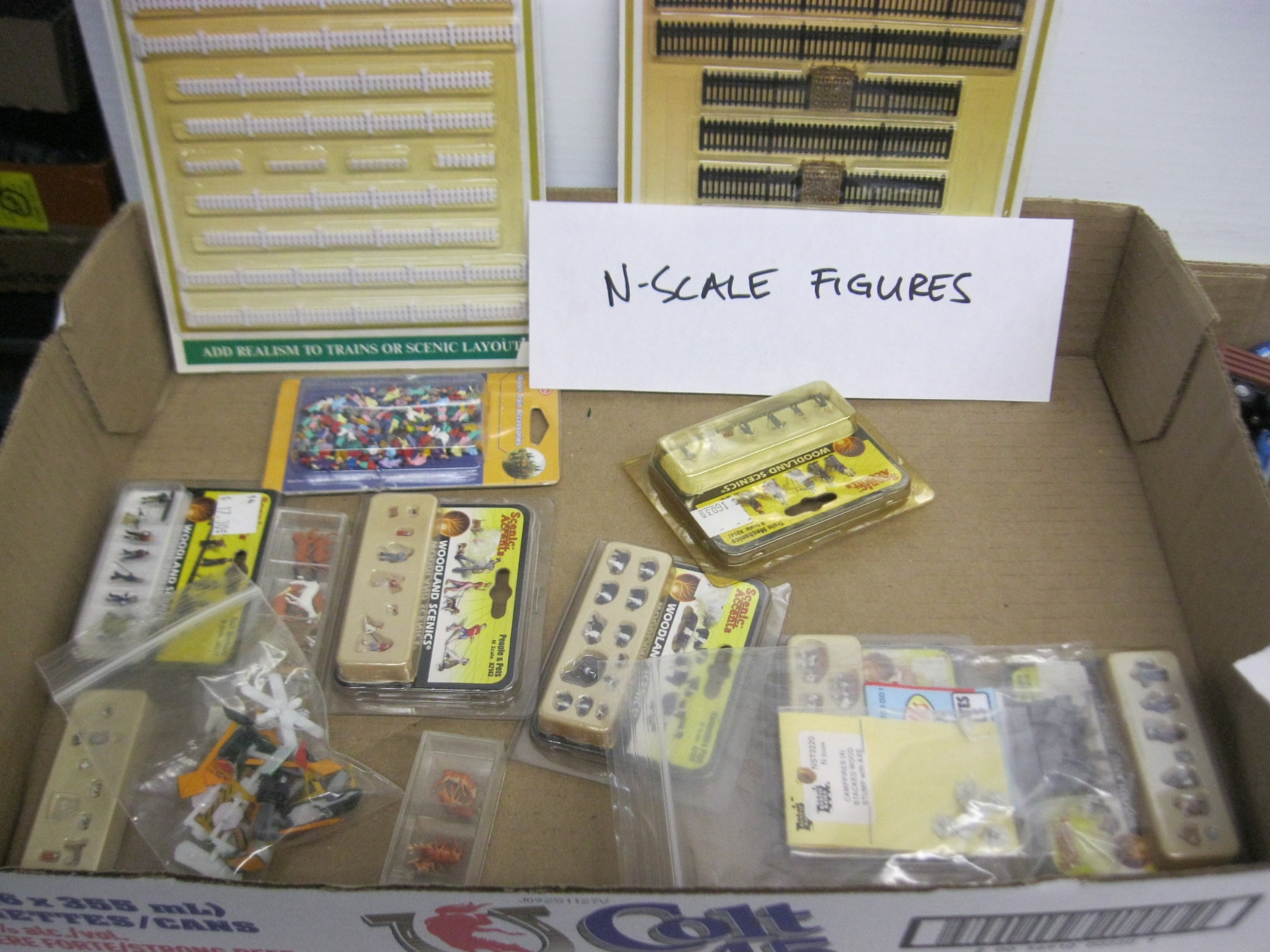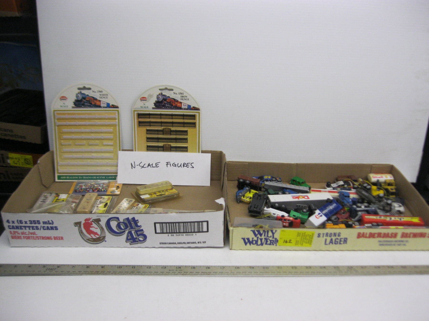 Lot 162 2 BOXES OF ASST. TRAIN FIGURINES, SM. TRUCKS, ETC.