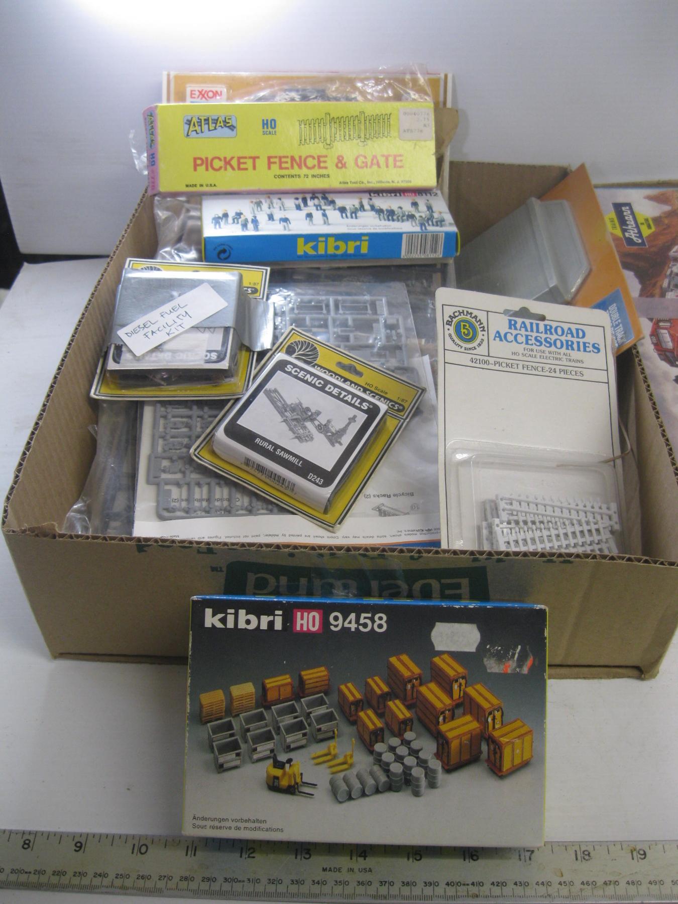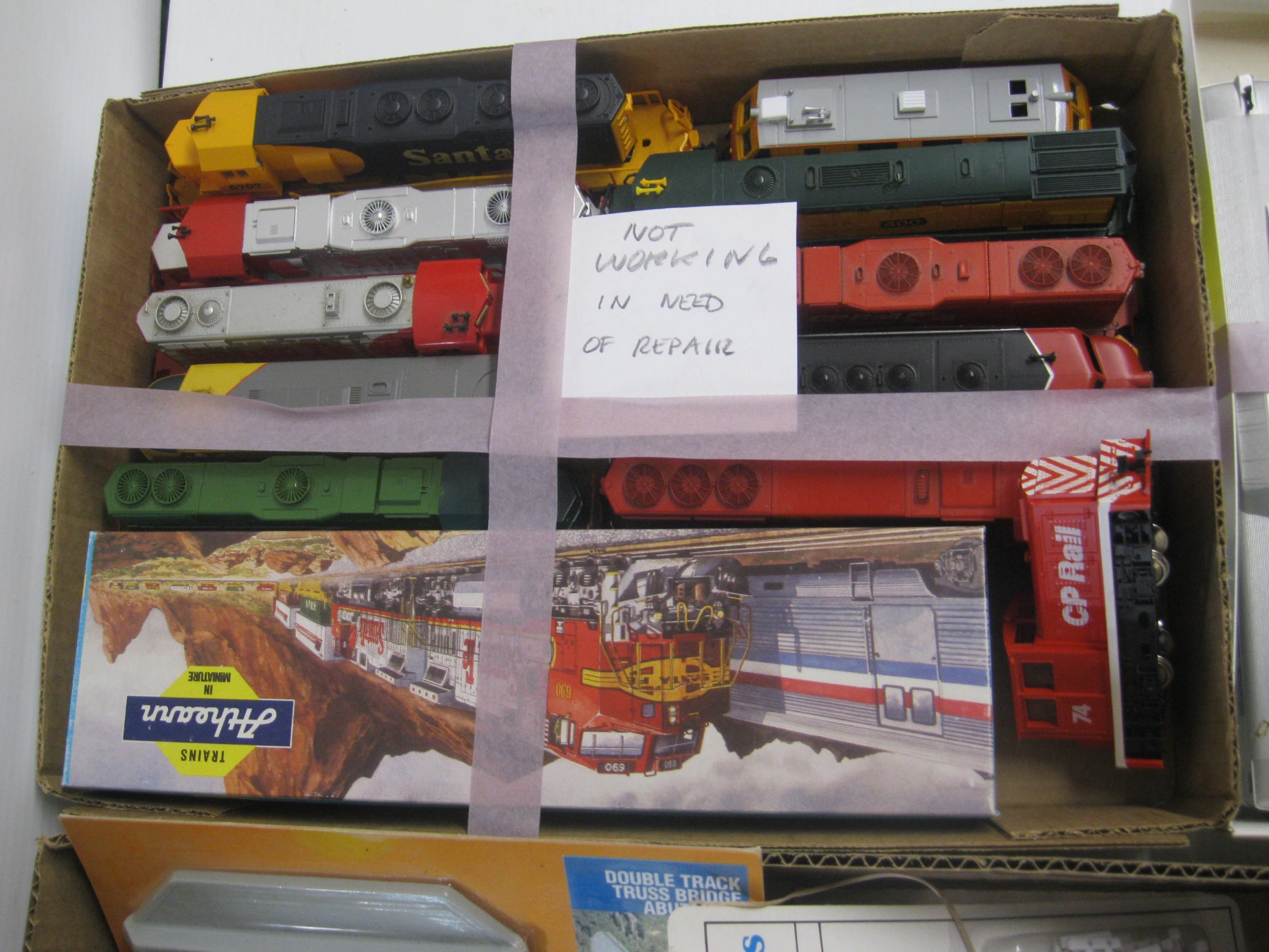 Lot 185 ASST. RAILROAD ACCESS. & BOX OF ASST. "AS IS" TRAIN CARS & ENGINES