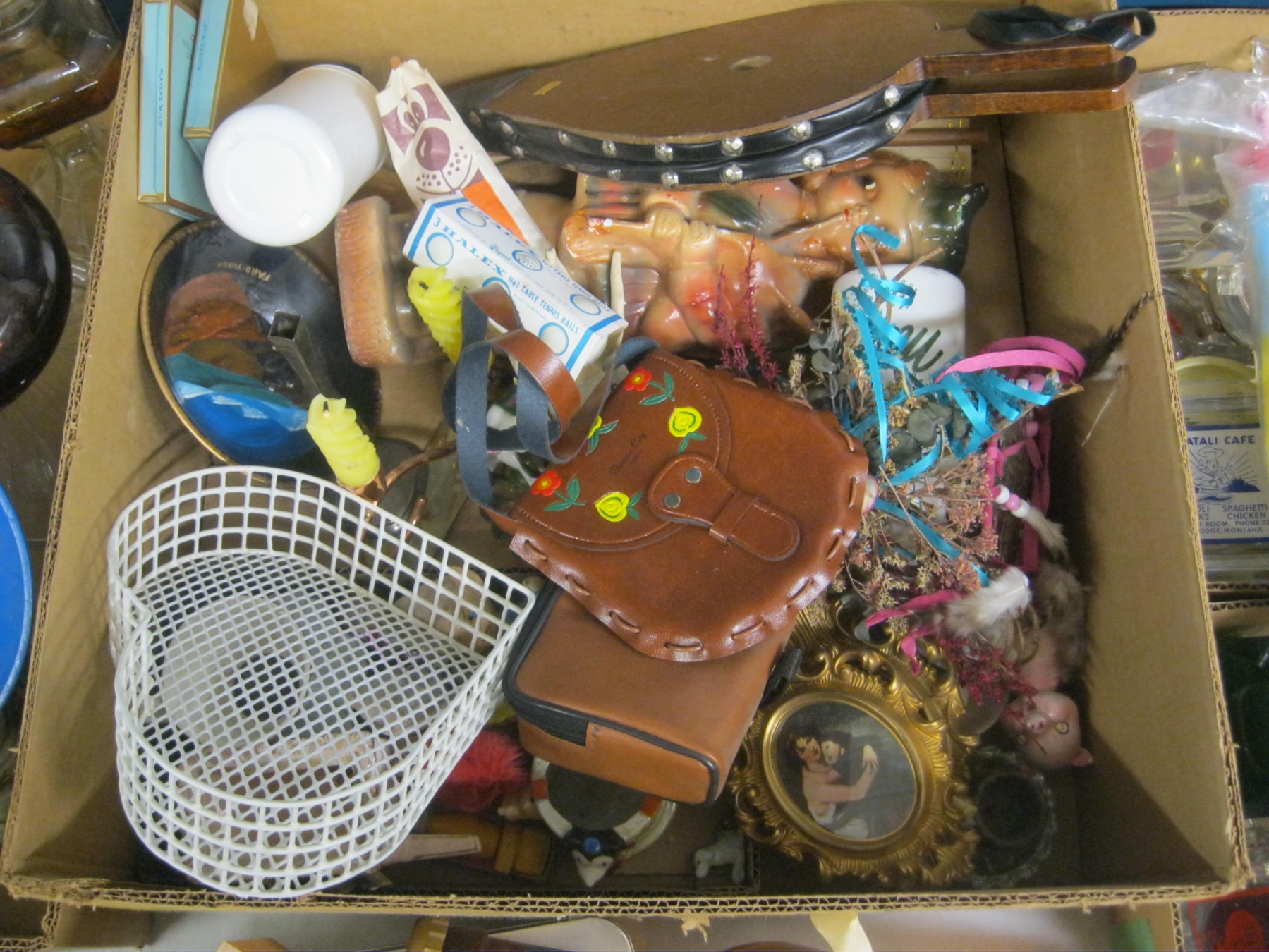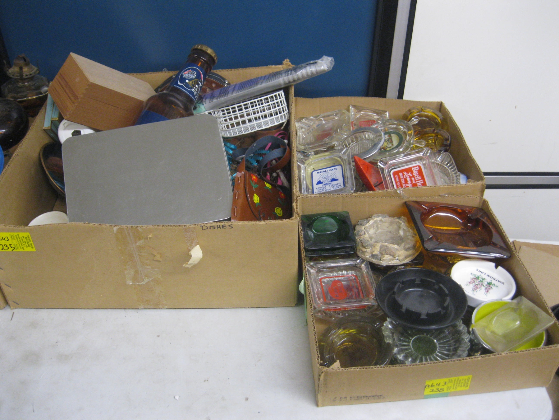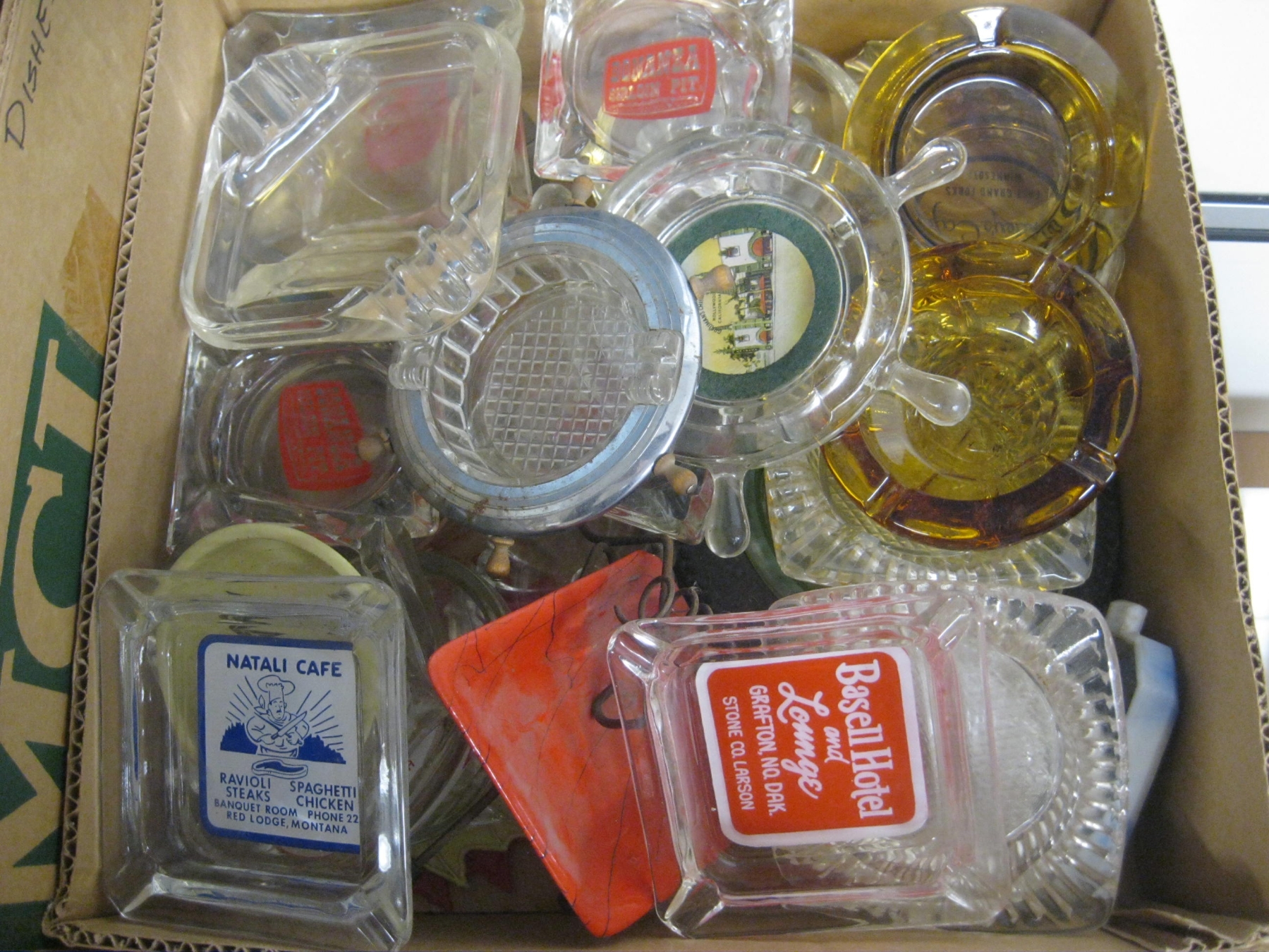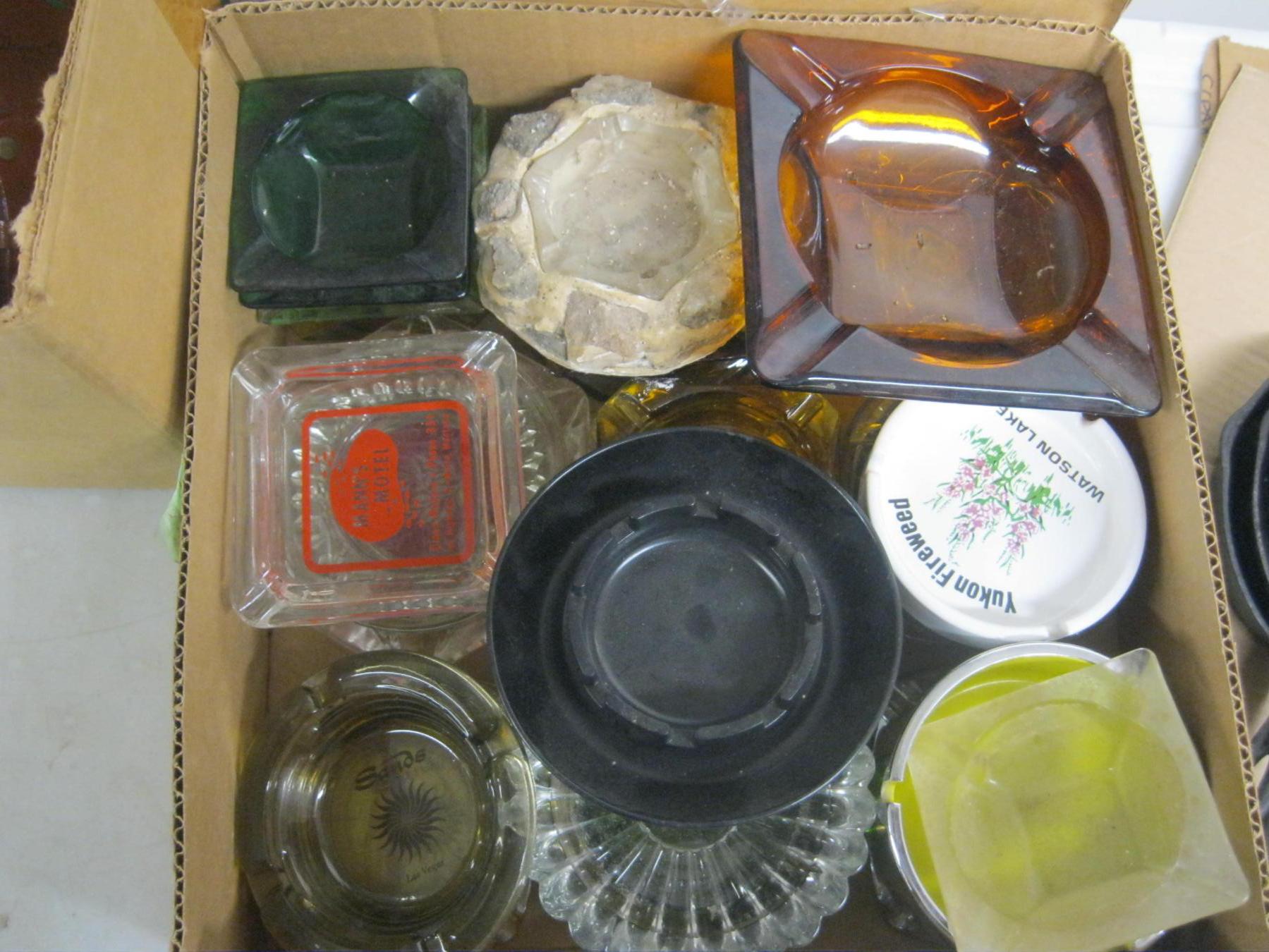 Lot 235 MISC. VINTAGE ITEMS - BELLOWS, CANDLEHOLDERS, ETC. & 2 BOXES OF COLLECTABLE ASHTRAYS