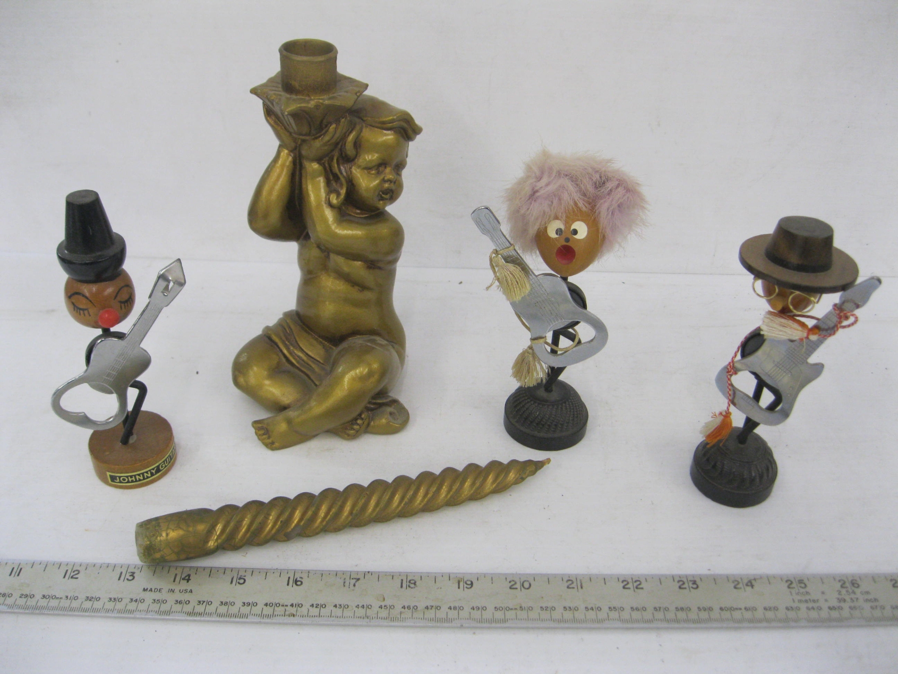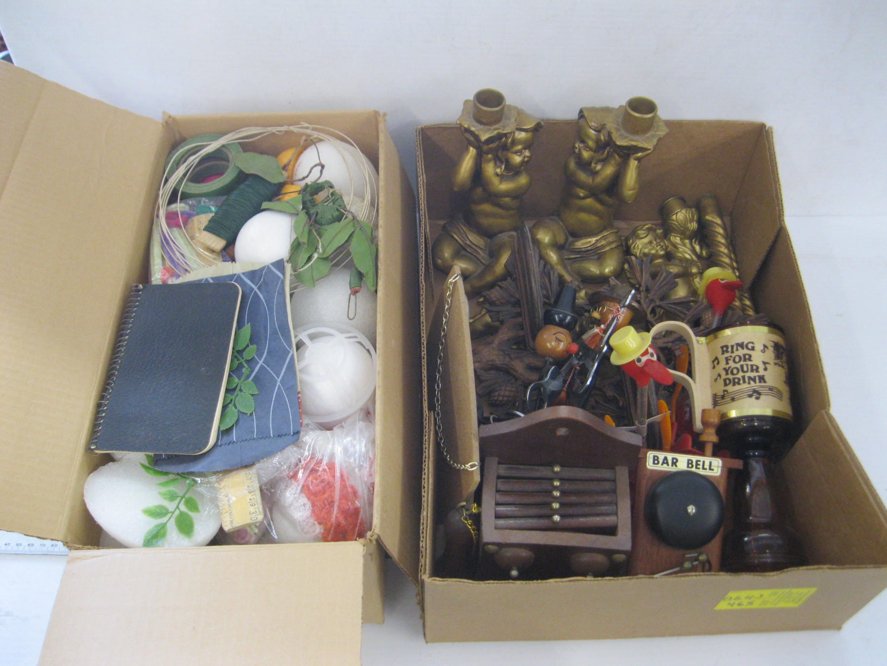 Lot 465 2 BOXES OF MISC. CRAFTING ITEMS, CHERUB CANDLEHOLDERS, VINTAGE FIGURINES, ETC.