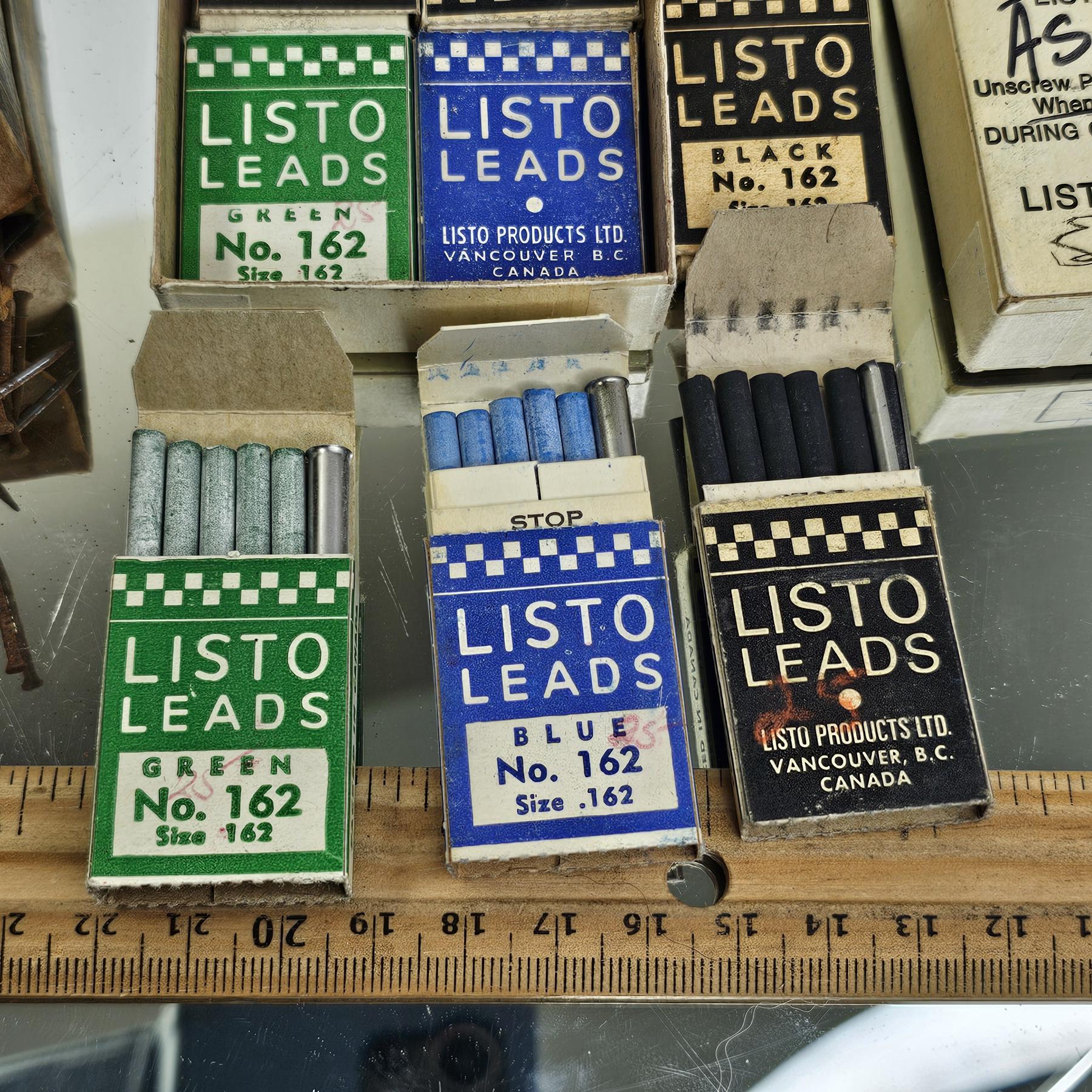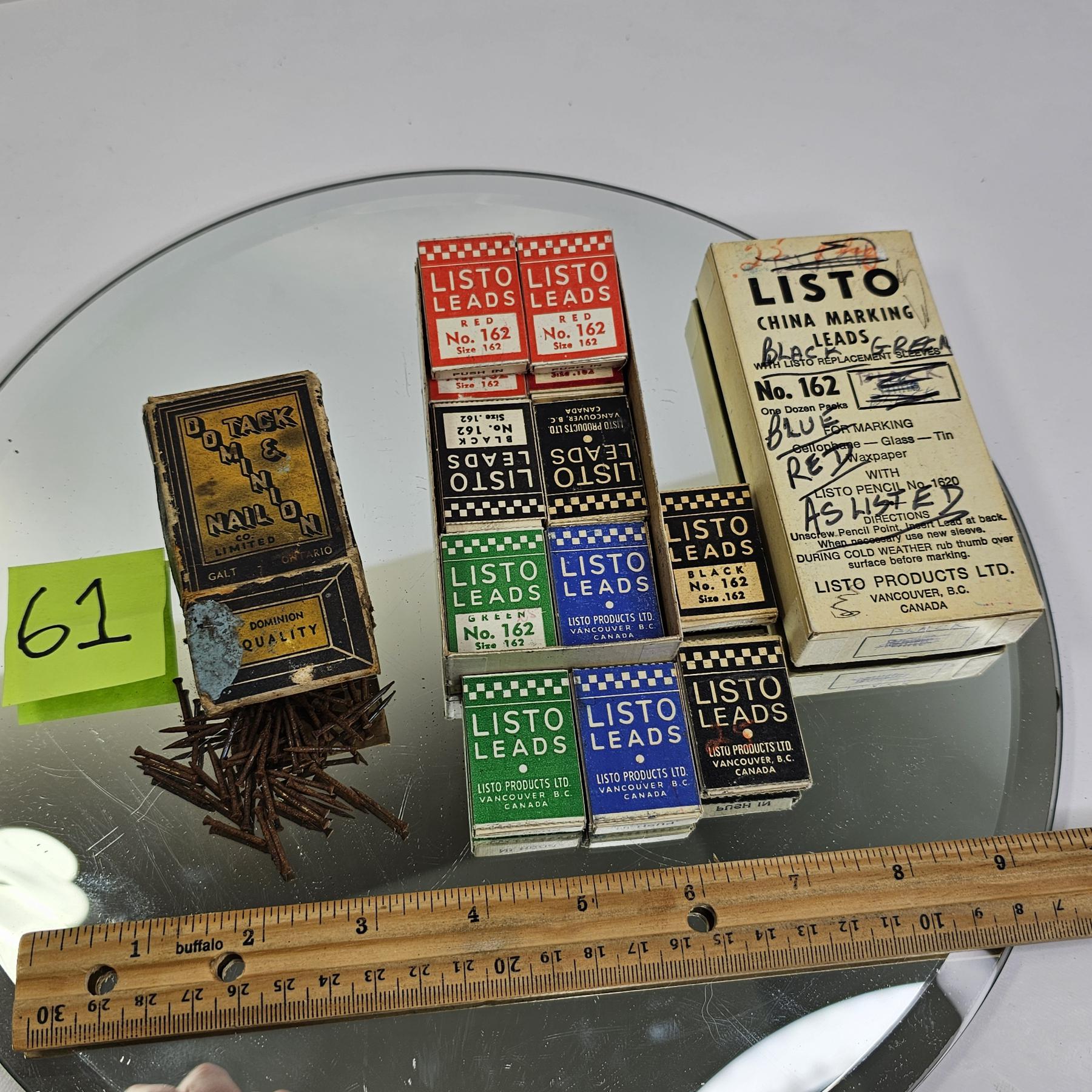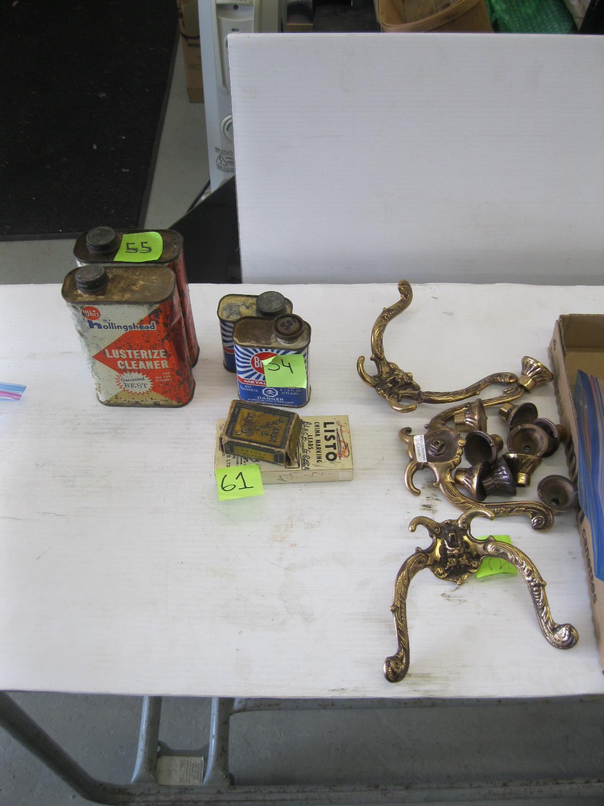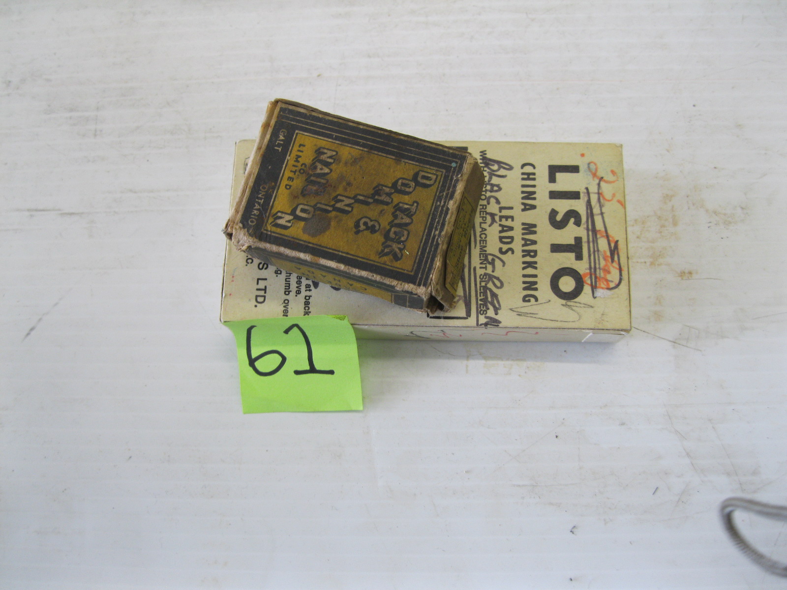 Lot 384 COAT HANGERS, VINTAGE CANS, 2 CANS LUSTERIZE, VINTAGE SHOE TACKS & CHINA MARKING LEADS