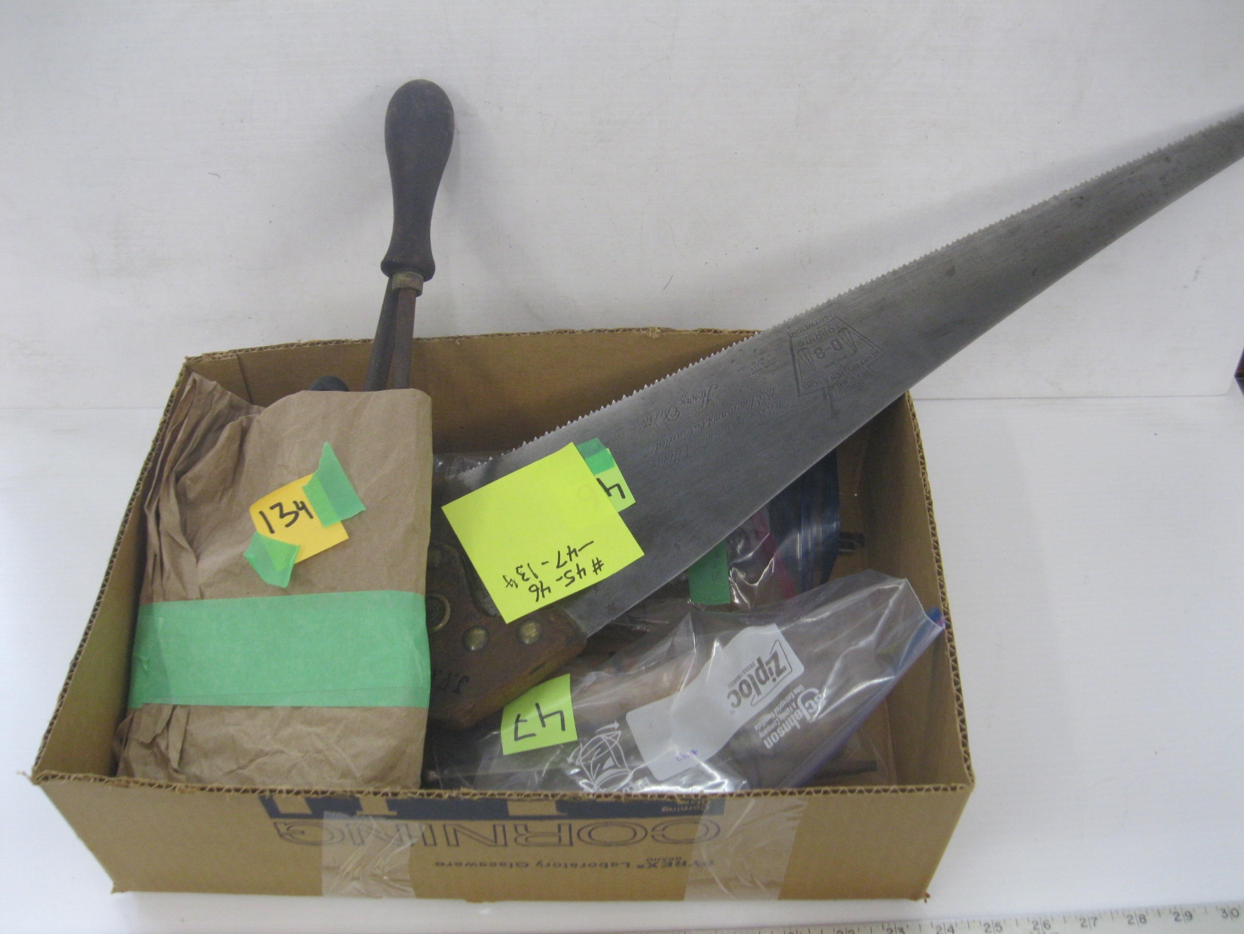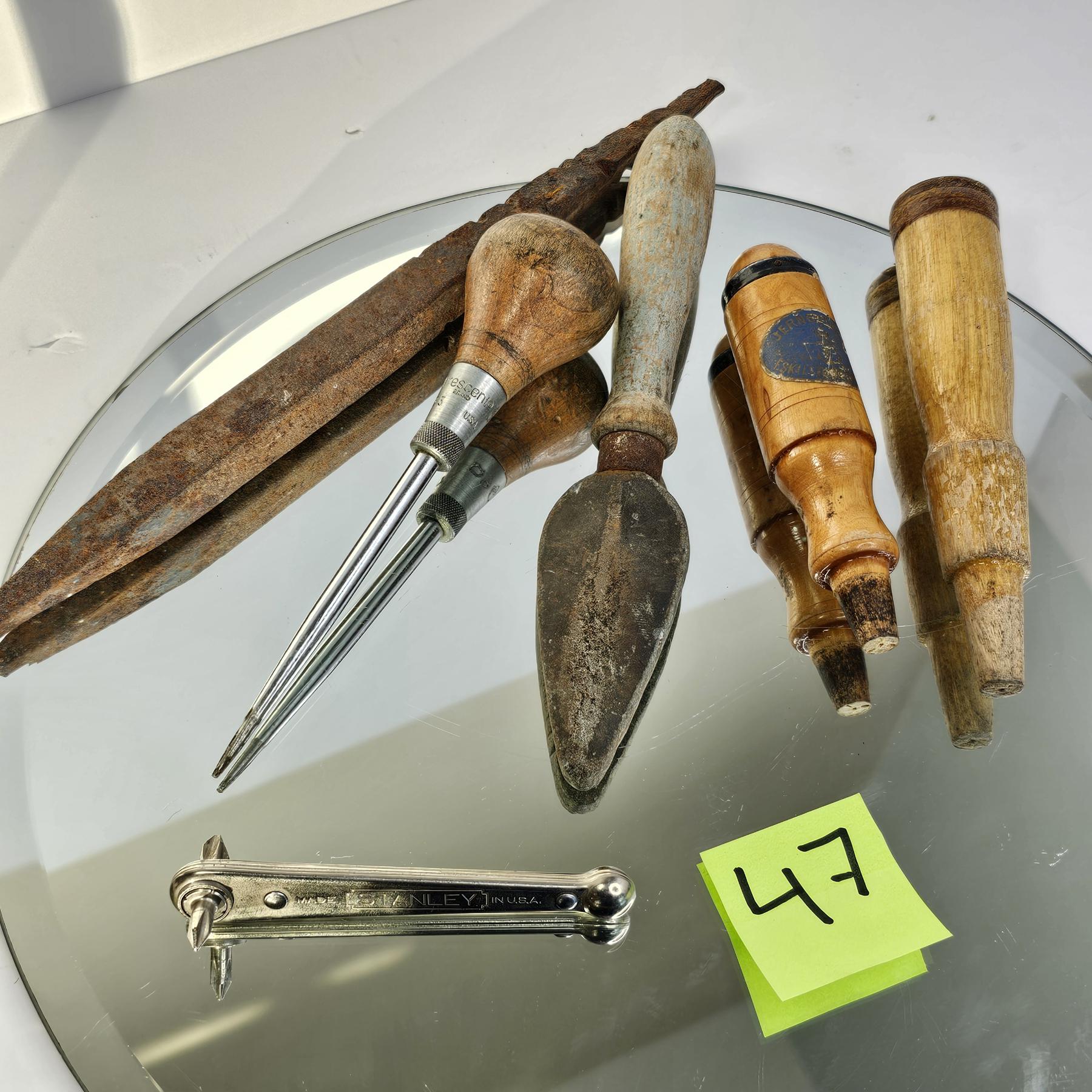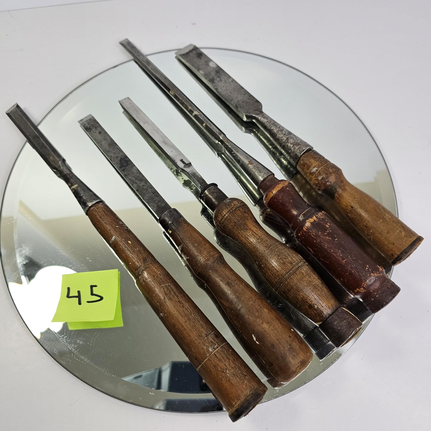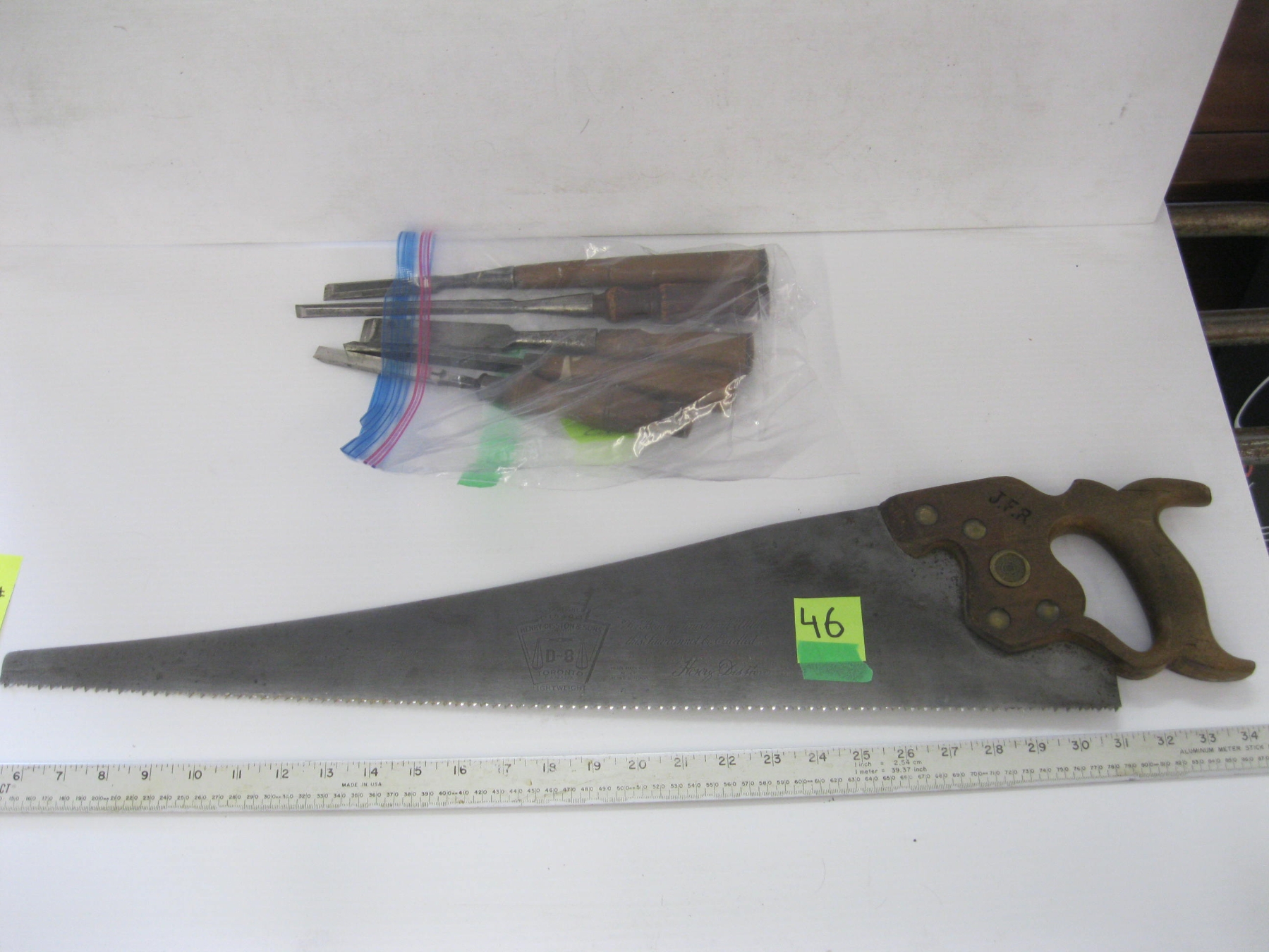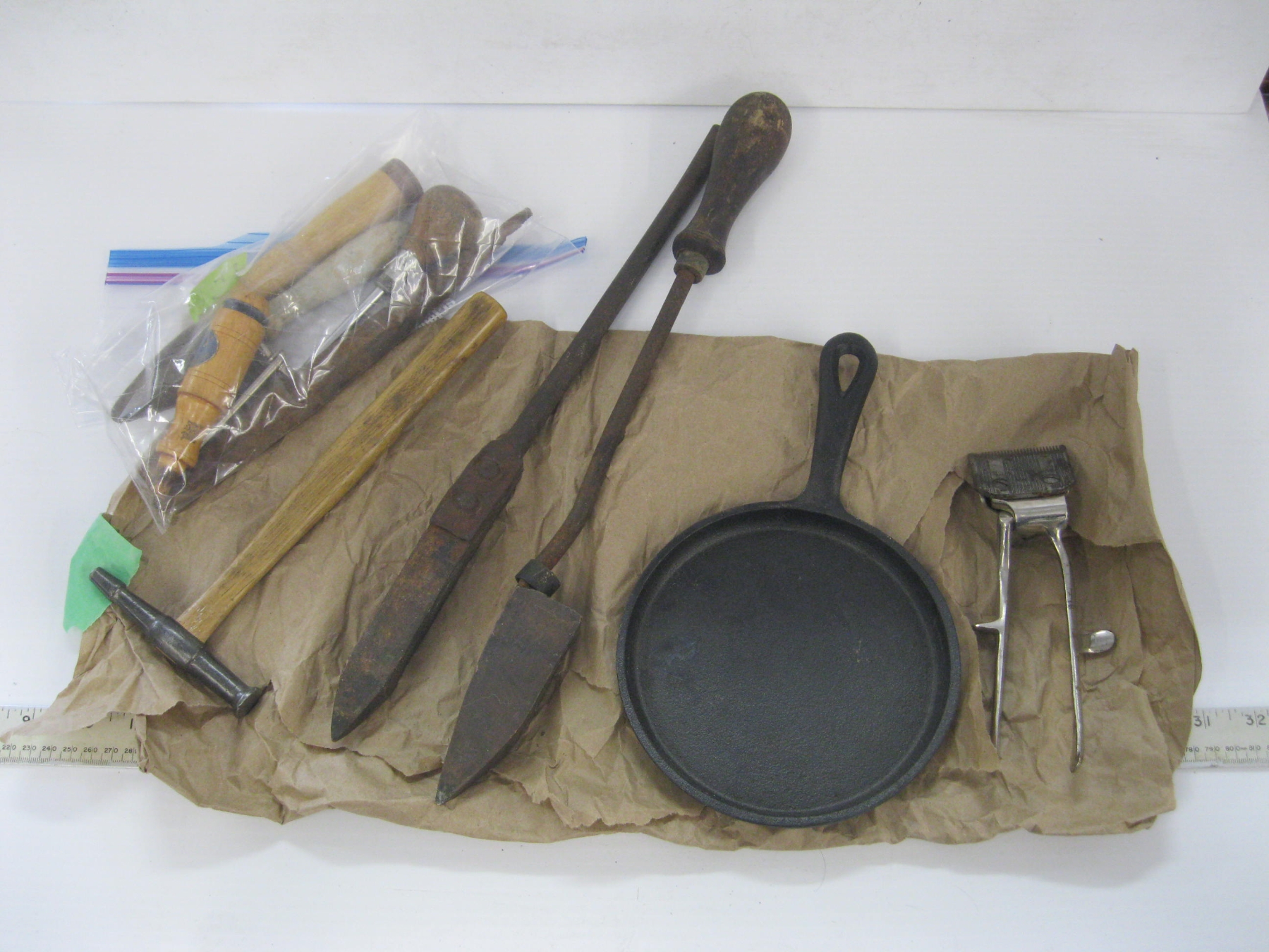 Lot 404 LG. LOT OF VINTAGE HAND TOOLS - CHISELS, HAND SAW, ETC. & A CAST IRON PAN