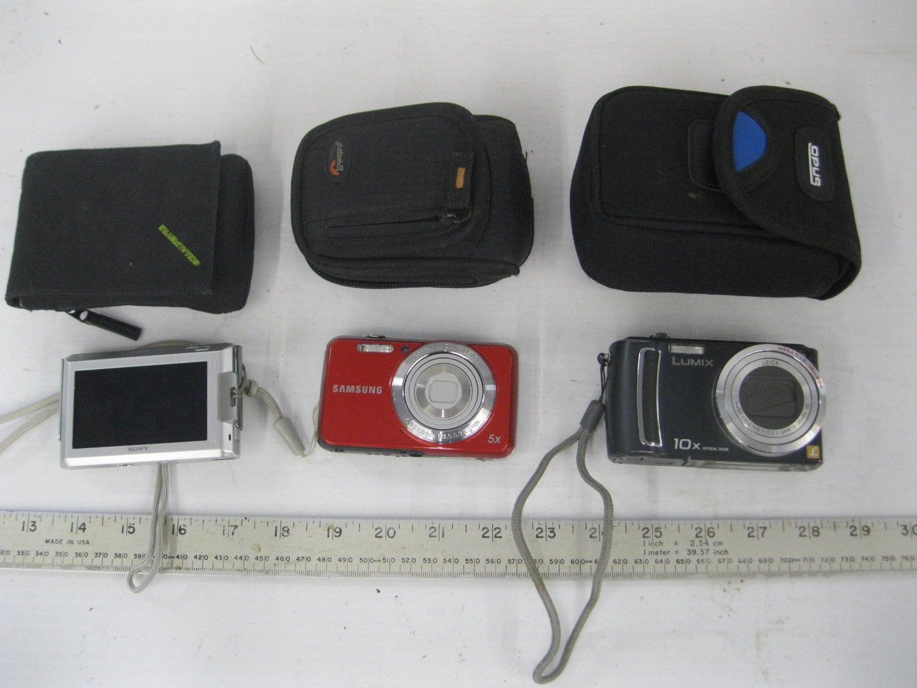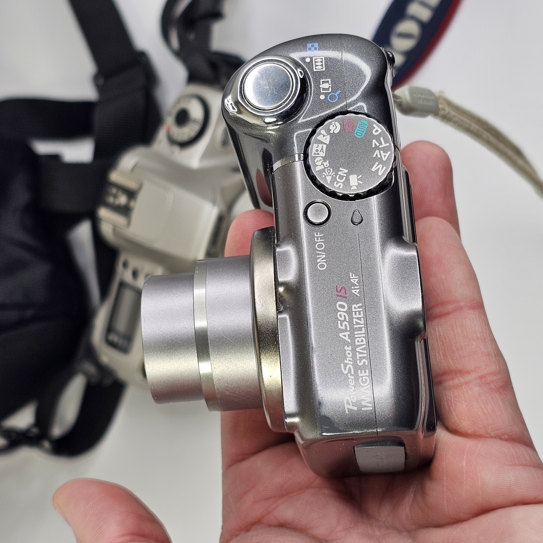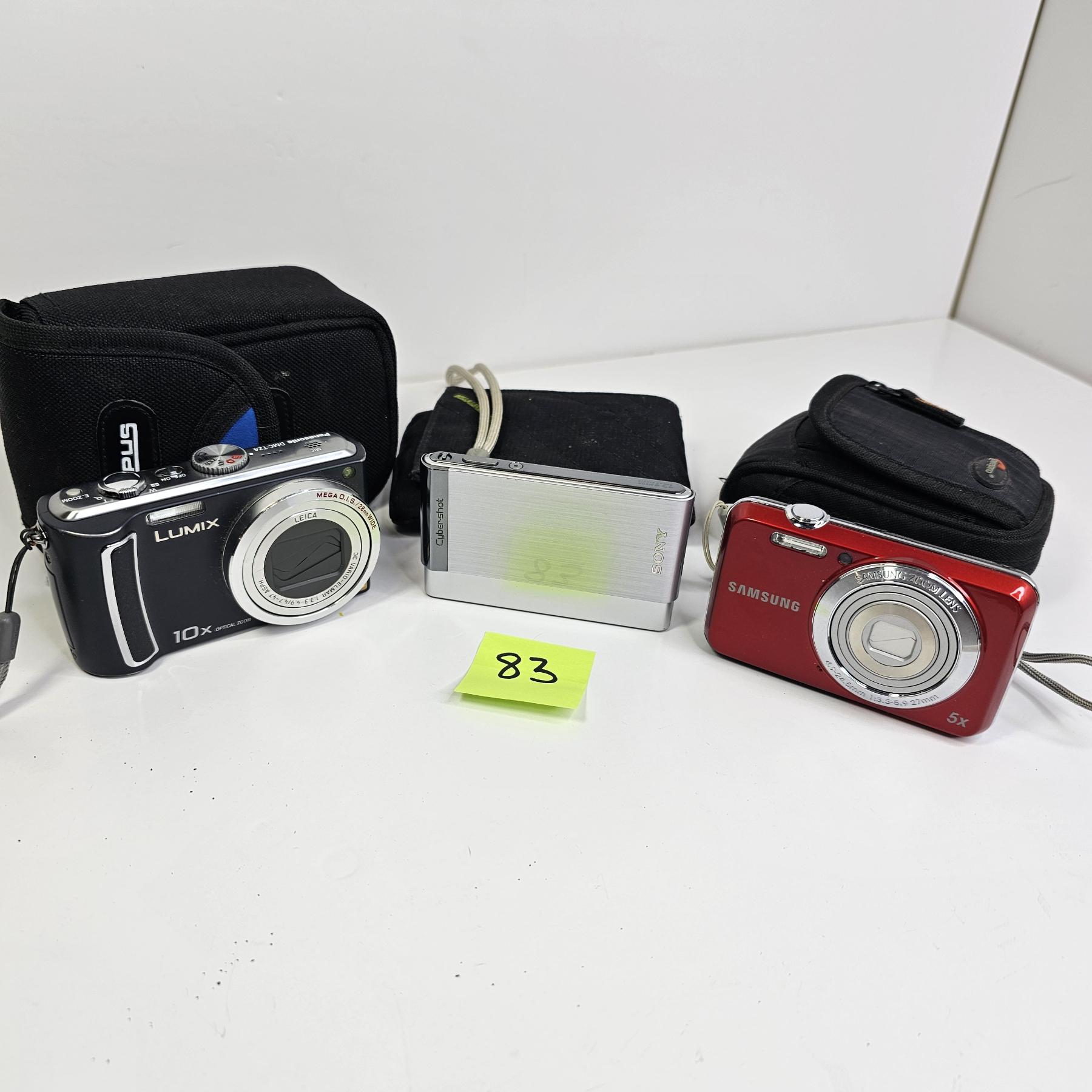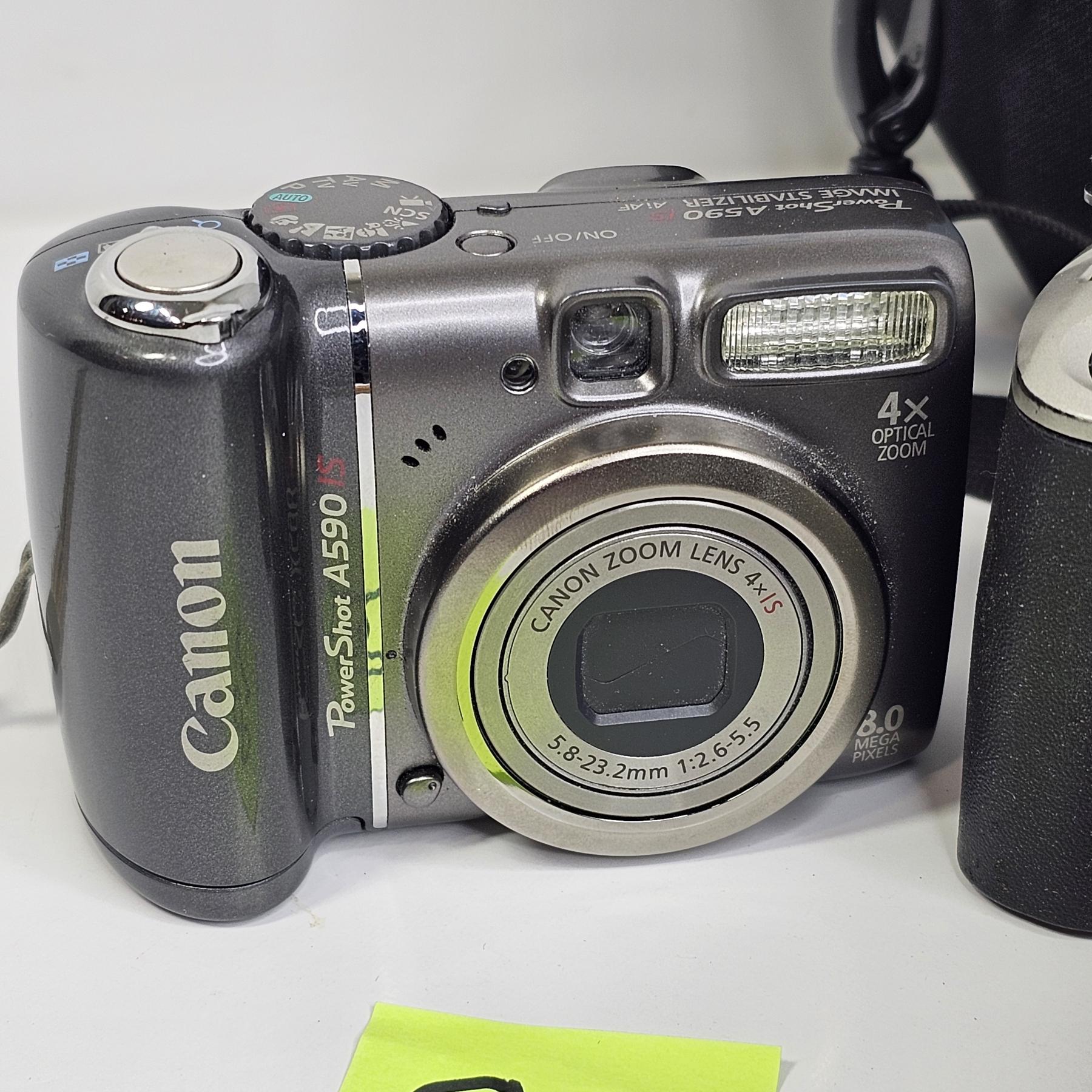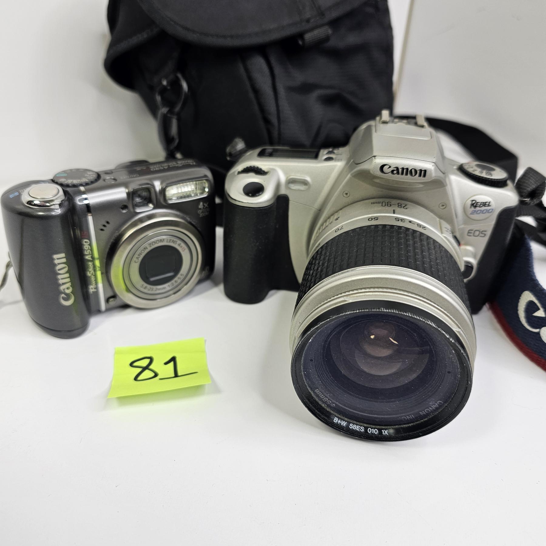 A590 W/POWERS ON, MOTOR SOUNDS LOUDER THAN OTHERS BUT ZOOM WORKS & NO BATTERIES FOR REBEL; 3 DIGITAL CAMERAS, CANNOT TEST DUE TO NO CHARGERS;2 FLASHES WHICH APPEAR TO BE IN GOOD CONDITION BUT UNTESTED