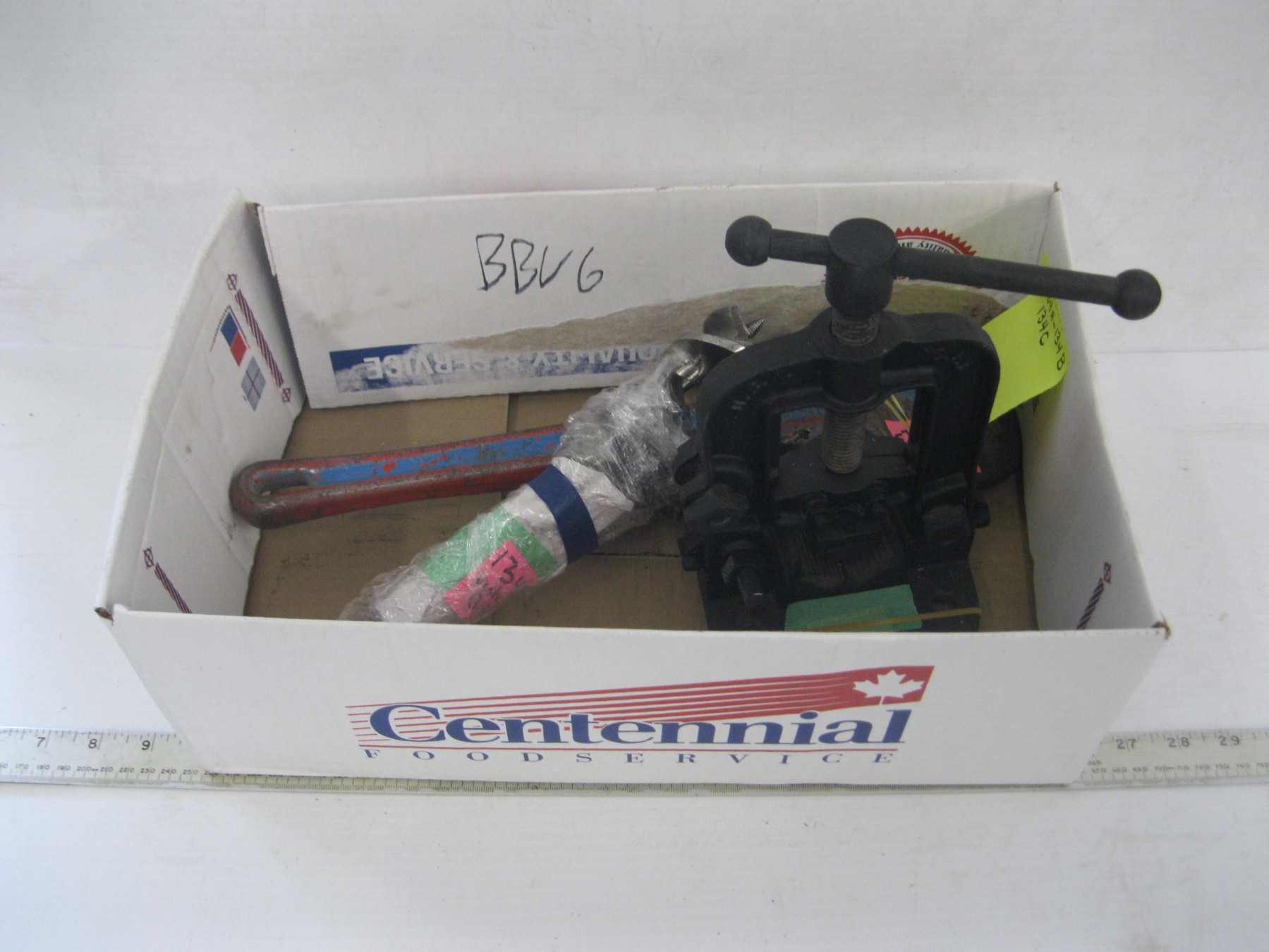 Lot 443 LITTLESTOWN HDWE PIPE CLAMP, RIGID 18" PIPE WRENCH & IRWIN VINTAGE DRILL BITS (7PCS)