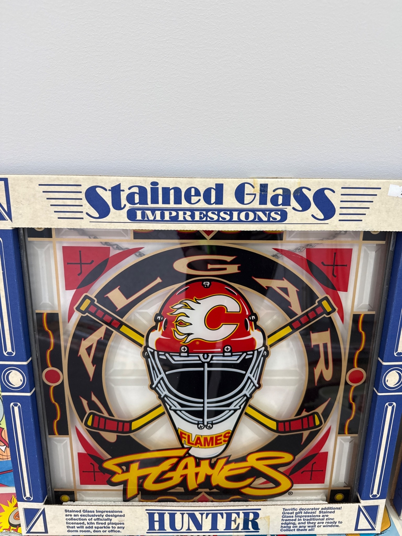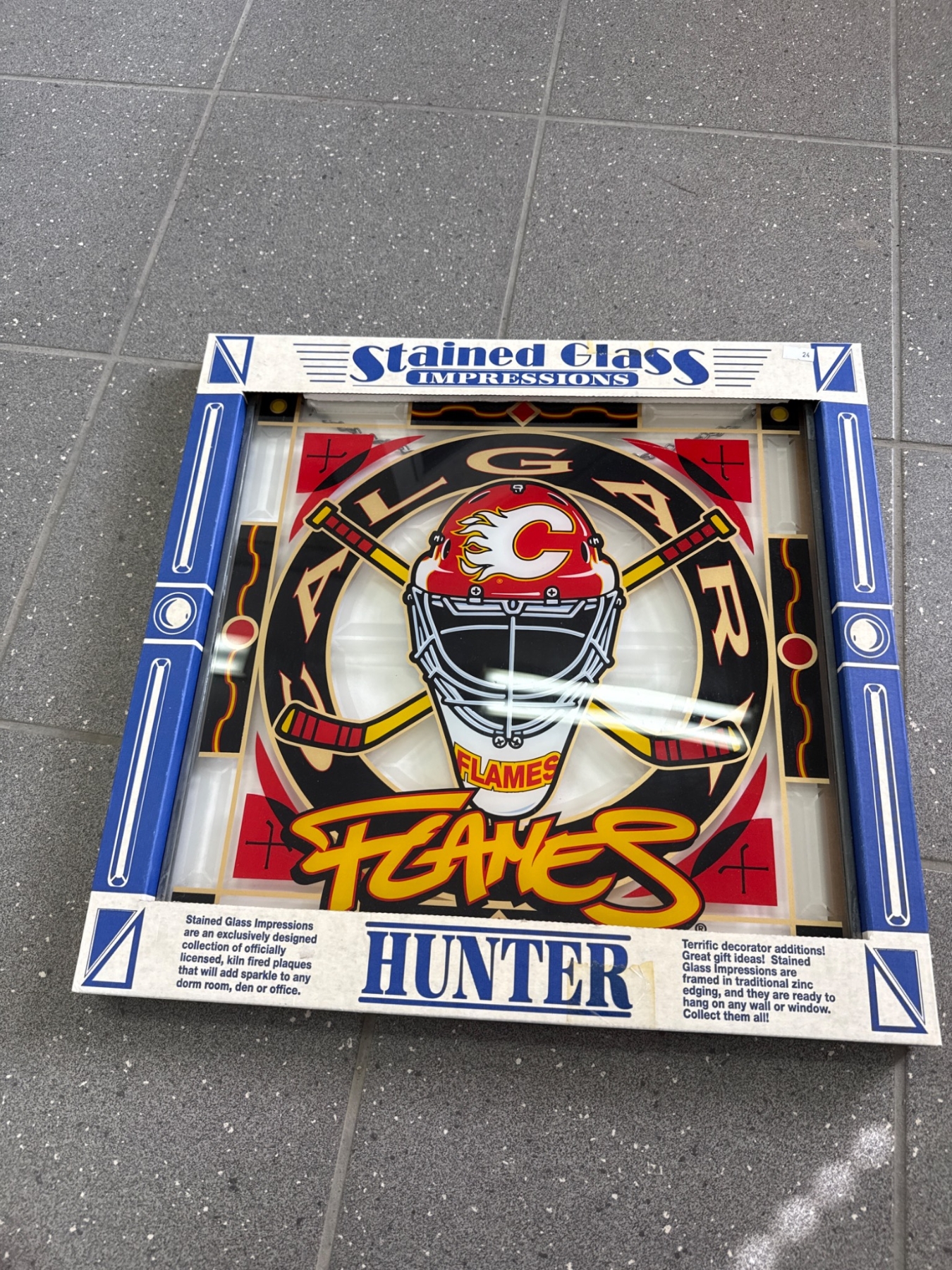 Calgary Flames-themed stained glass artwork by Hunter, measuring 16x16 inches. Features the team's logo, hockey imagery, and detailed lettering. Presented in its original packaging marked 'Stained Glass Impressions.' Suitable for display or collection. Appears unused and well-preserved.