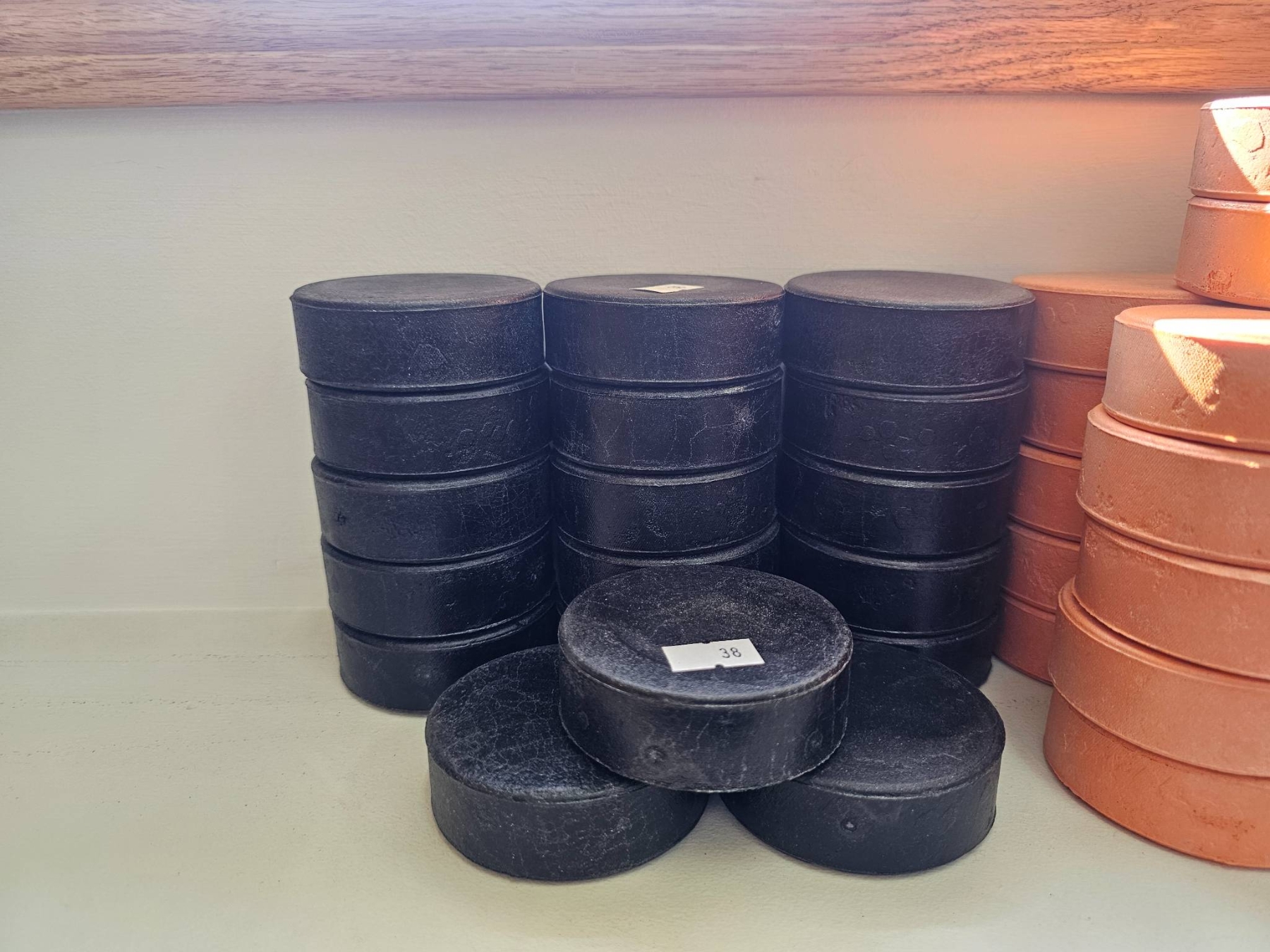 Hockey pucks in two colors: black and orange. The black and orange pucks are standard size and shape, suitable for ice hockey or training purposes. The lot includes multiple stacks of each color, with no visible major wear or damage.