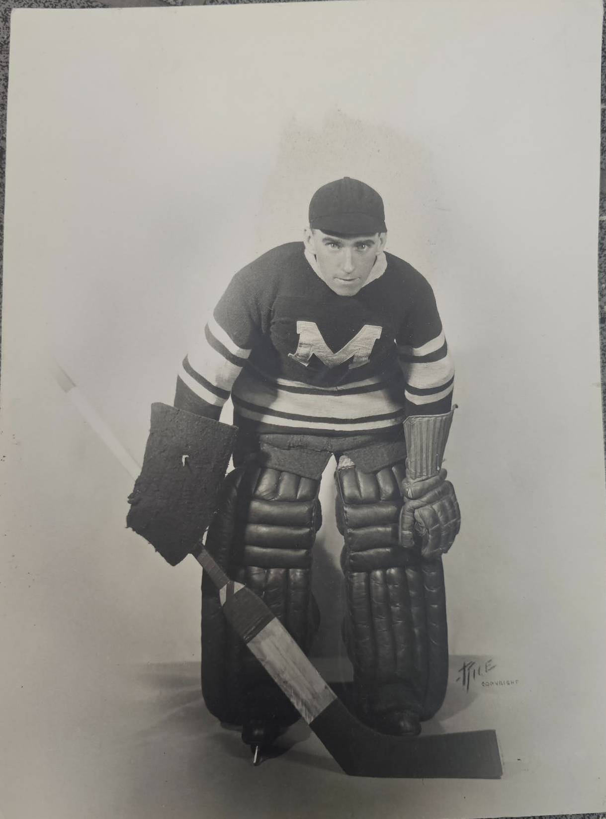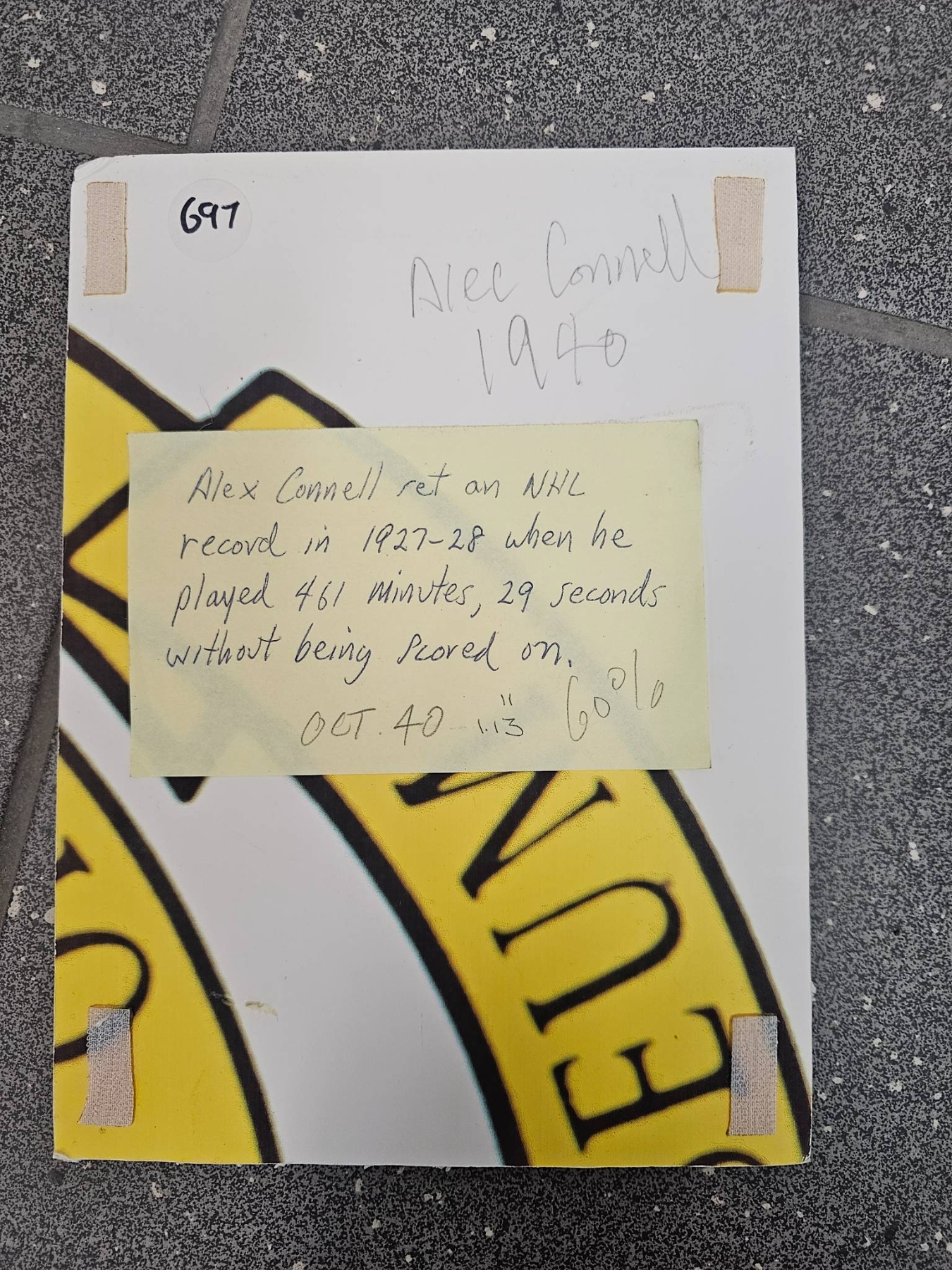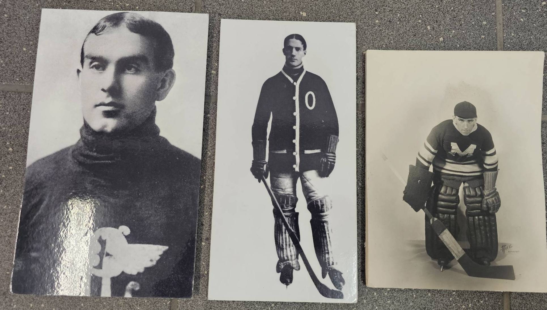 Three black-and-white photographs depicting early hockey players. Includes portraits marked as "Cyclone Taylor," "B. McFarlane," and "Alex Connell." Handwriting on verso provides additional player identification and notes, such as Alex Connell's NHL record in 1927-28. Mounted on backing with adhesive tape. Condition varies, with minor wear visible on mounts.