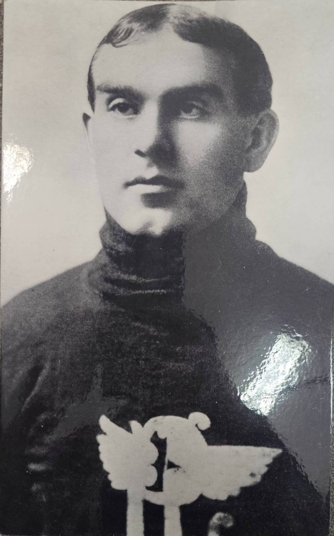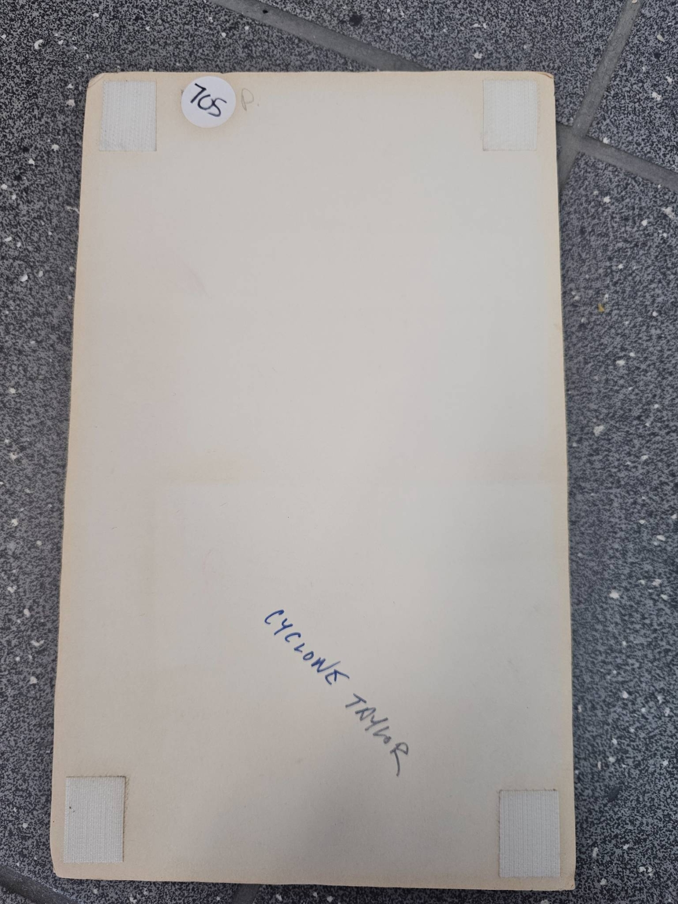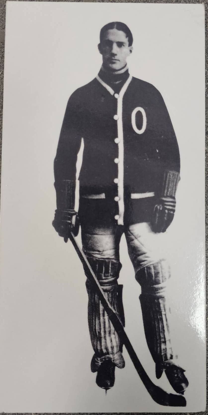 Three black-and-white photographs depicting early hockey players. Includes portraits marked as "Cyclone Taylor," "B. McFarlane," and "Alex Connell." Handwriting on verso provides additional player identification and notes, such as Alex Connell's NHL record in 1927-28. Mounted on backing with adhesive tape. Condition varies, with minor wear visible on mounts.