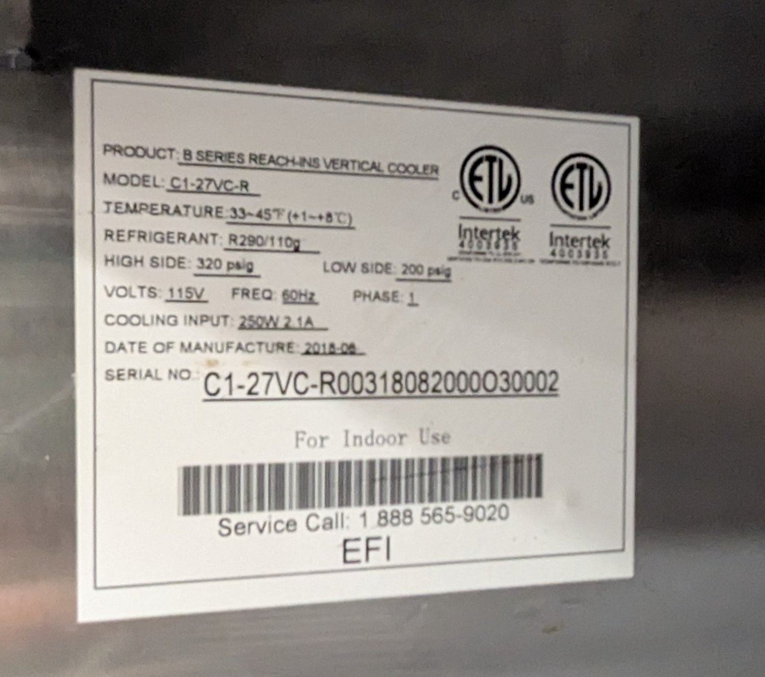 [Used, Tested/Working,] Serial# C1-27VC-R00318082000O30002, 27" x 31.5" x 84.1", 115V/60Hz/1Ph