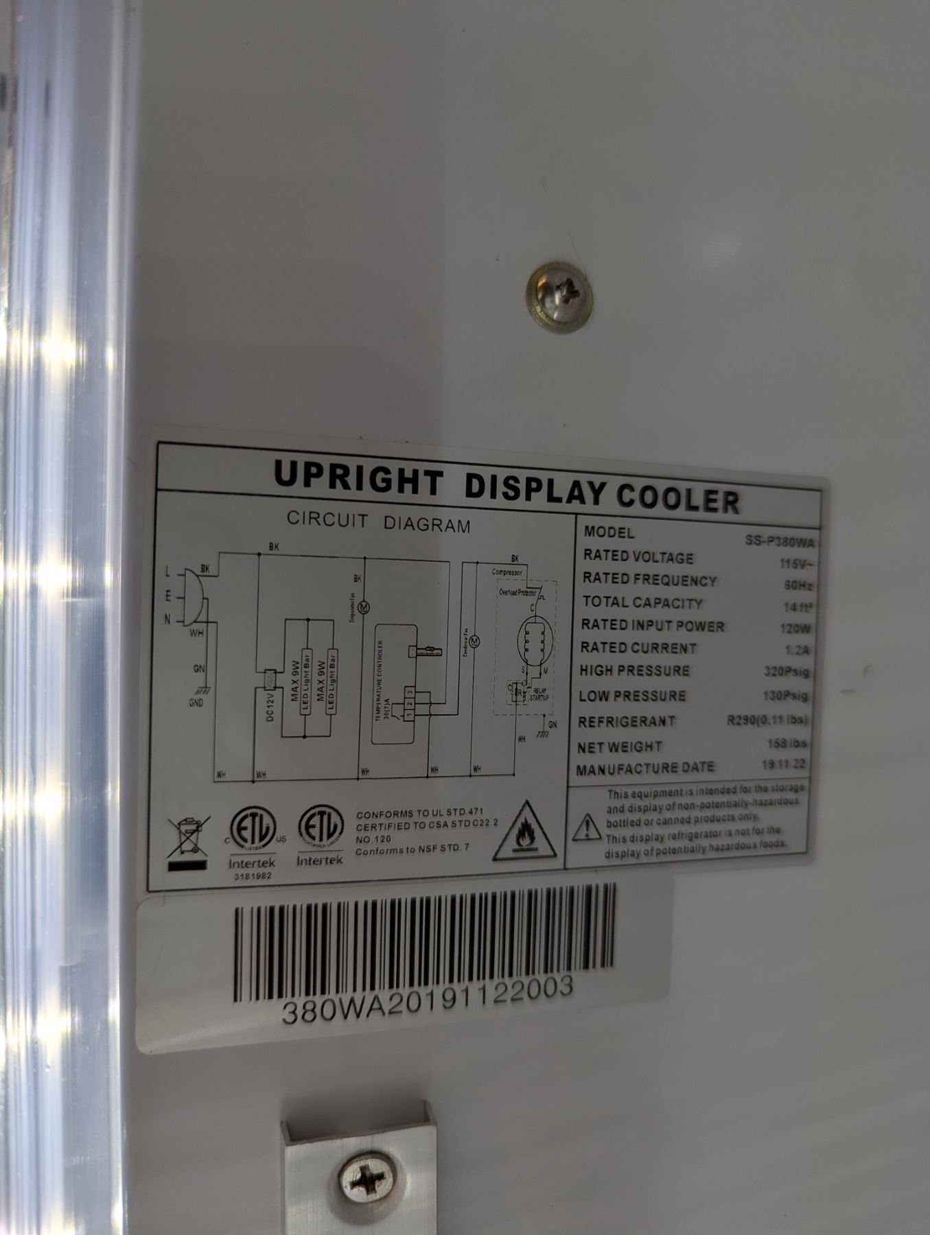 [Used, Tested/Working,] Serial# 380WA201911220003, Model: SS-P380WA, 24" x 23" x 77", 115V/60Hz/1Ph