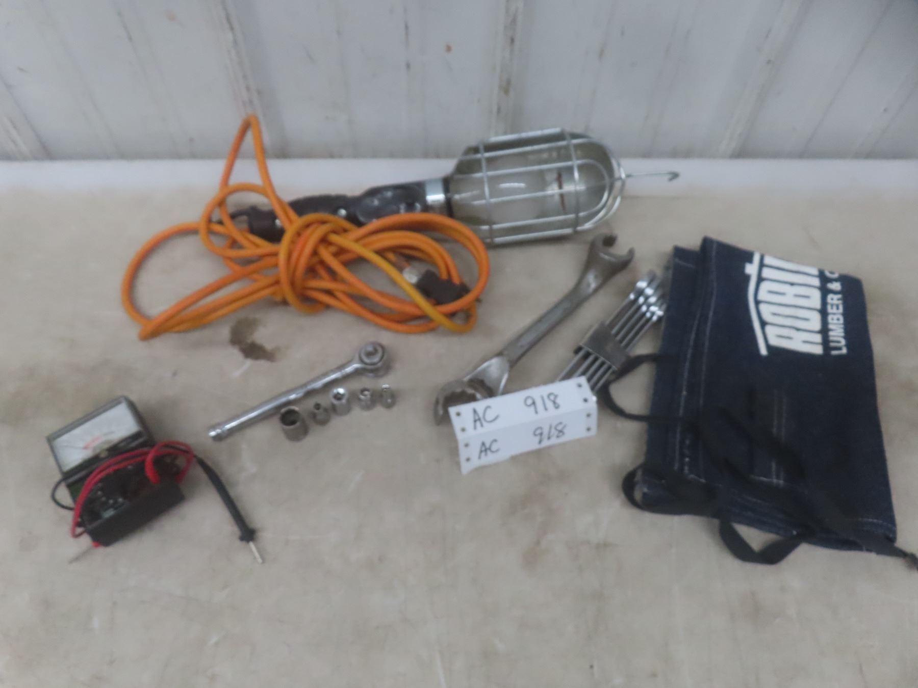 Lot 918 Trouble Light, Sockets, Wrenches, and Multimeter