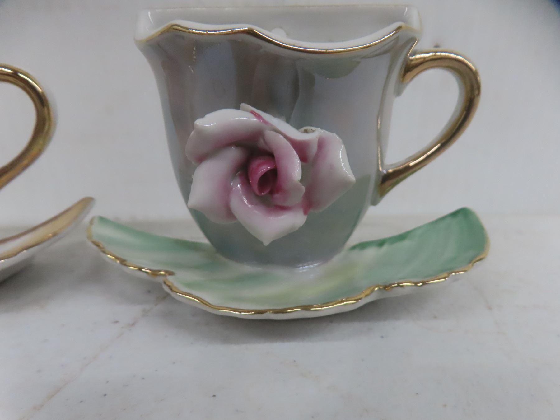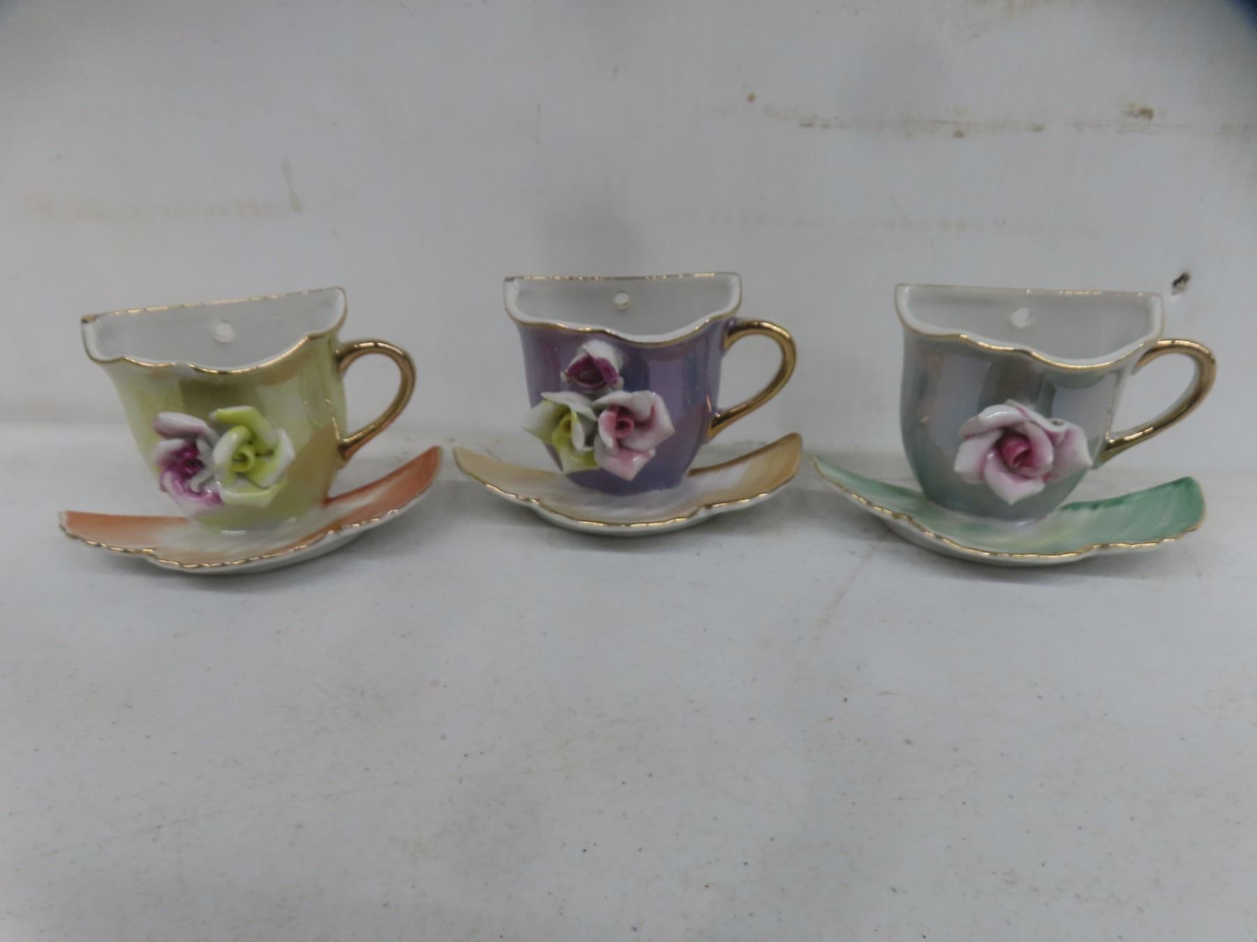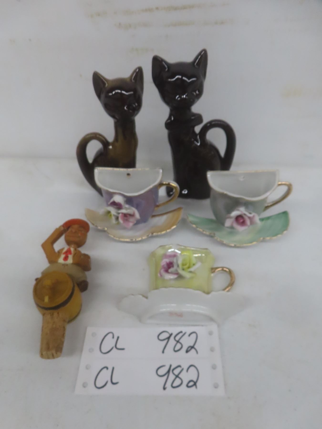 Lot 982 2 Blue Mountain Style Cats and 3 Hanging Tea Cups