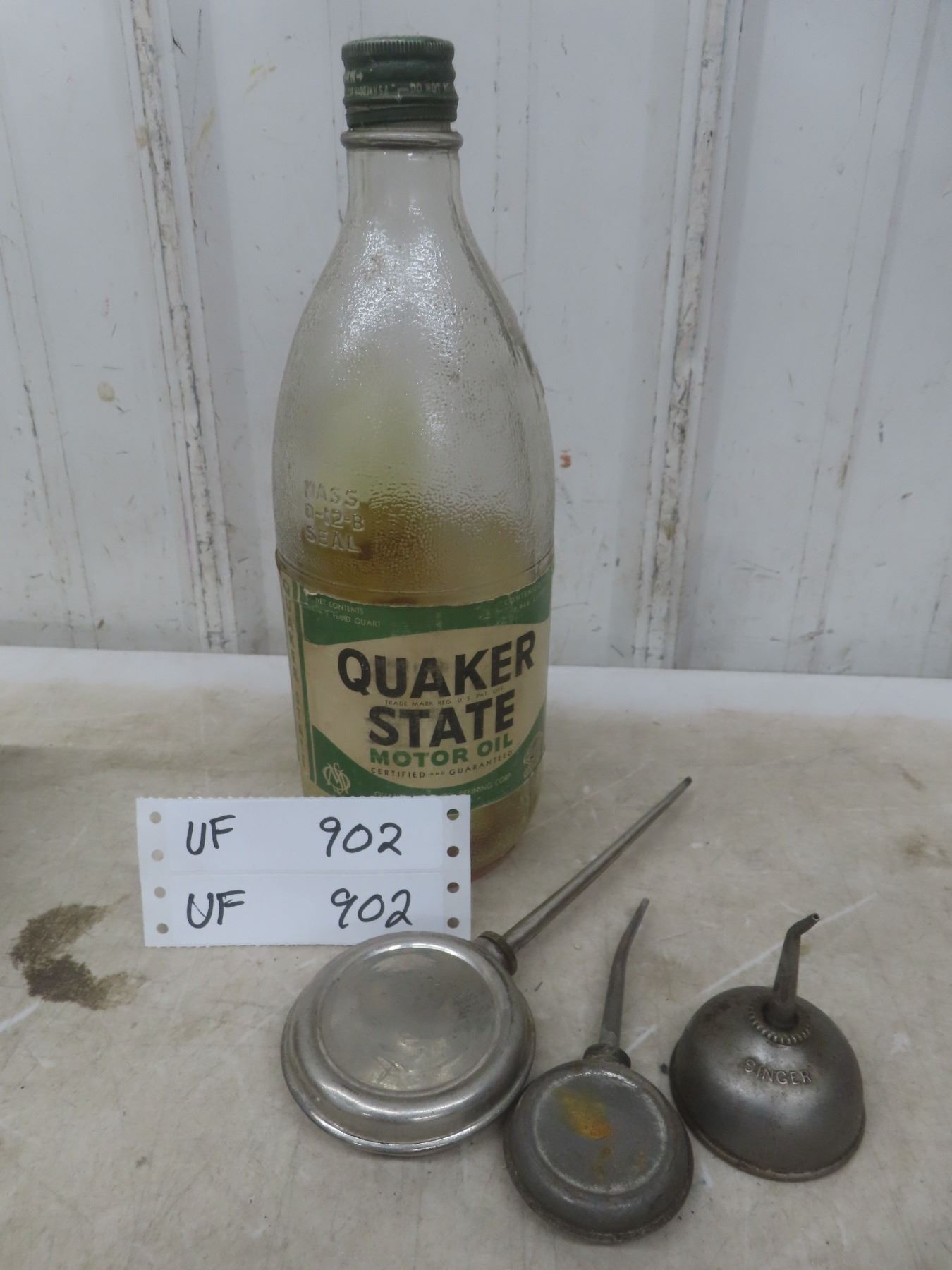 Lot 902 Quaker State 1-Quart Glass Oil Bottle and 3 Oilers