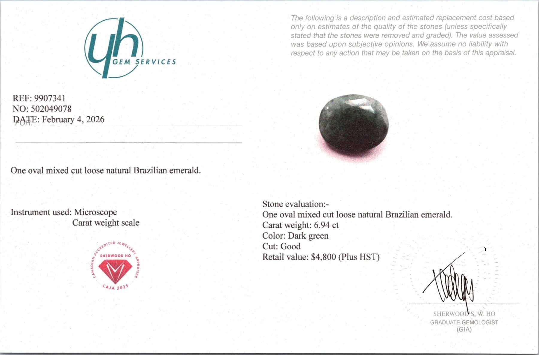 Lot 755B 6.94 ct Certified Brazillian Emerald gemstone ($4,800 Appraisal)