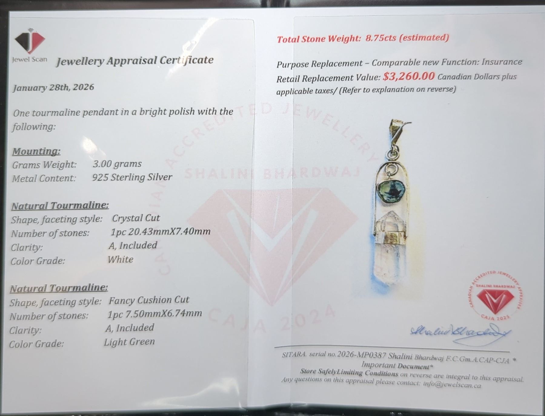 3 ct Certified Silver Tourmaline gemstone Pendant ($3,260 Appraisal)