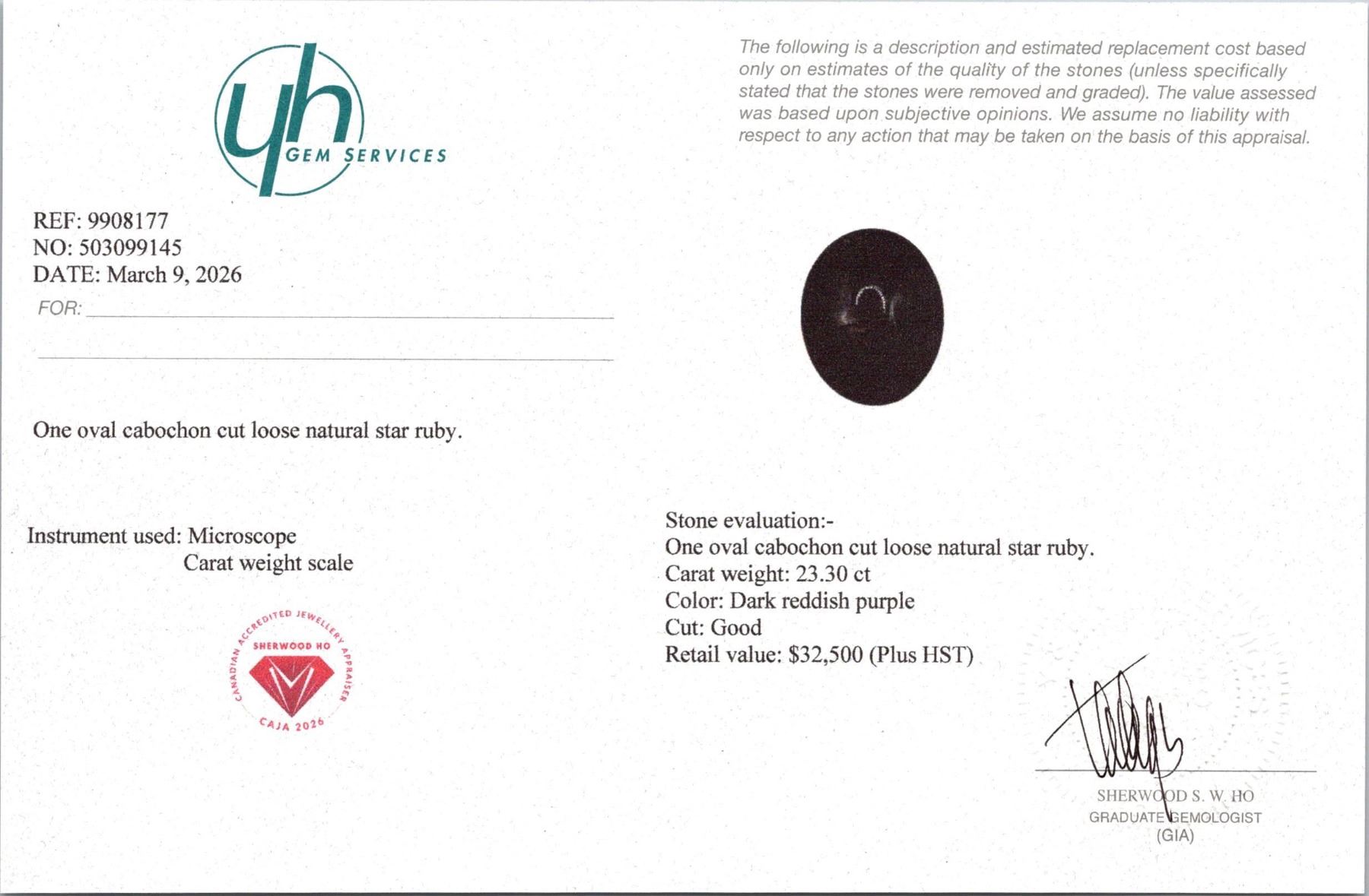 Lot 766B 23.3 ct Certified Star Ruby gemstone Untreated ($32,500 Appraisal)