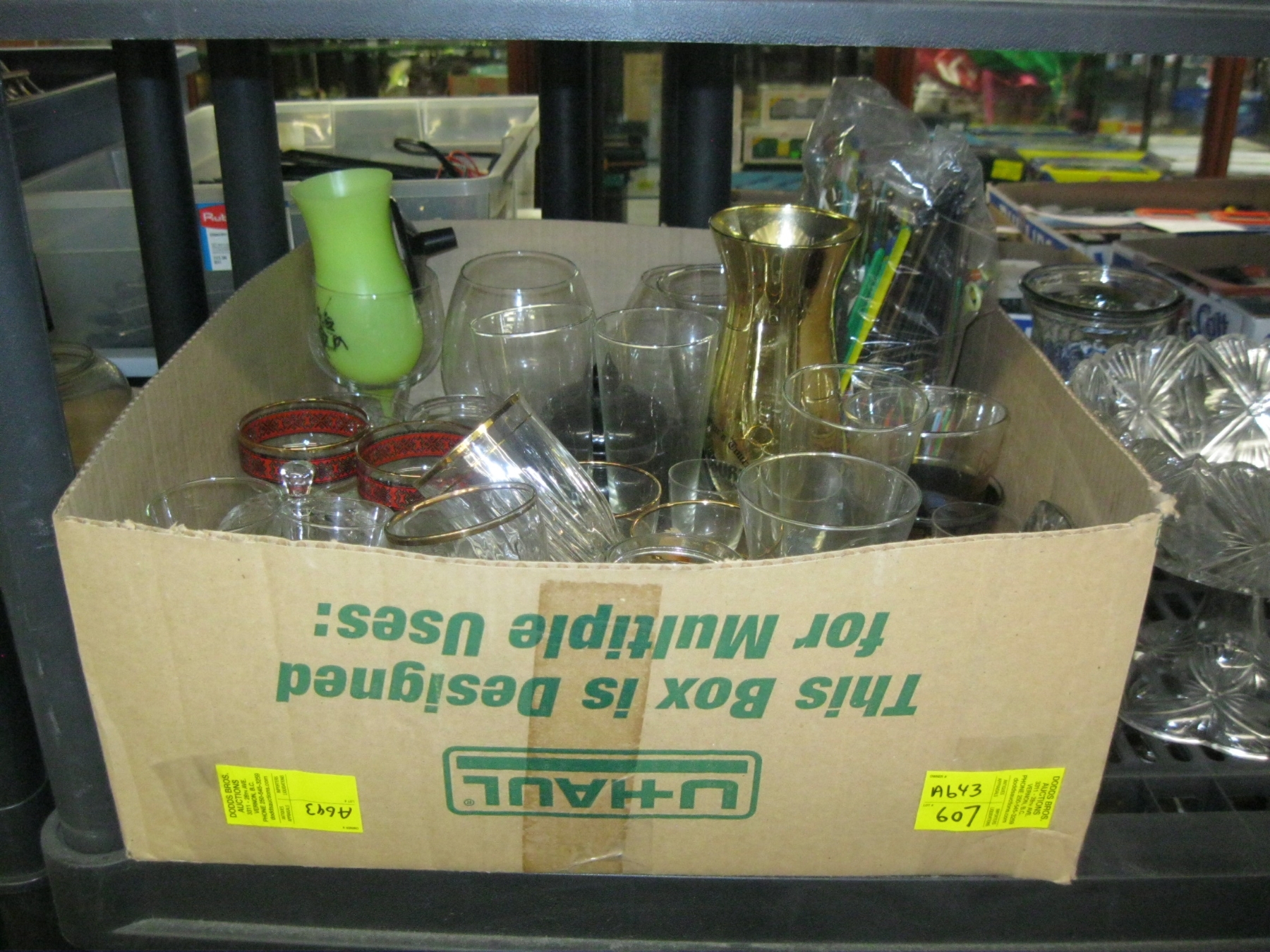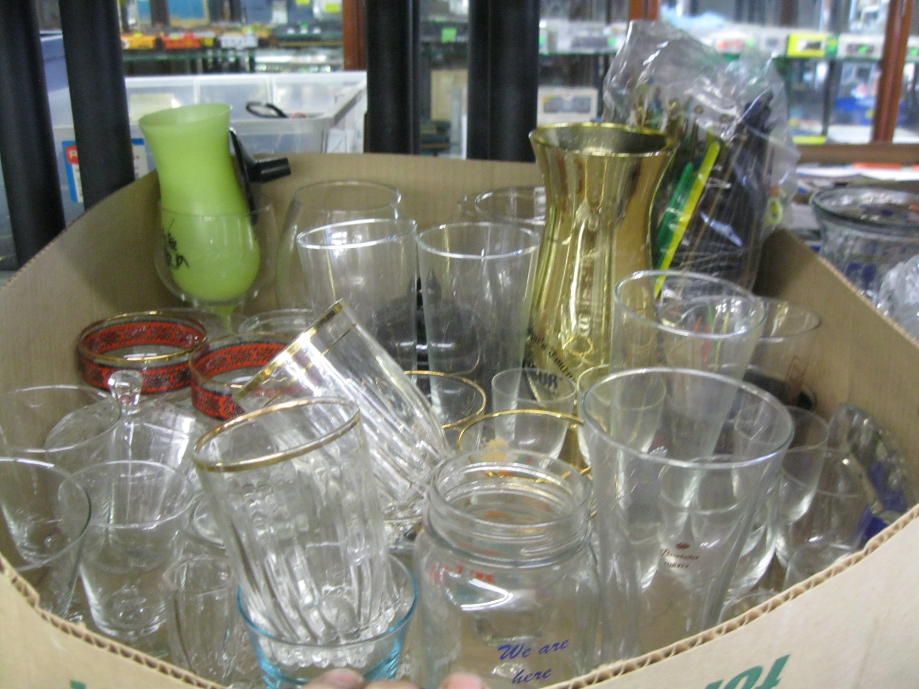 Lot 607 LARGE BOX OF MISC. BAR ITEMS - GLASSES, STIR STICKS, ETC.