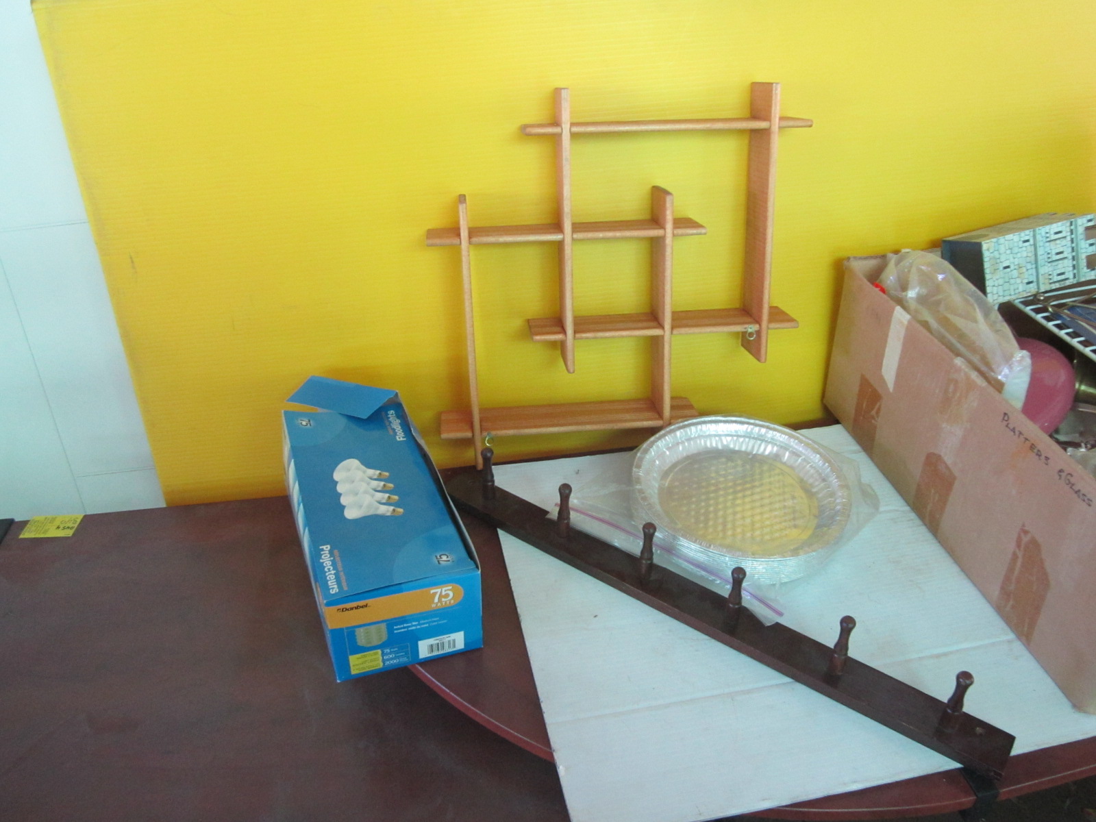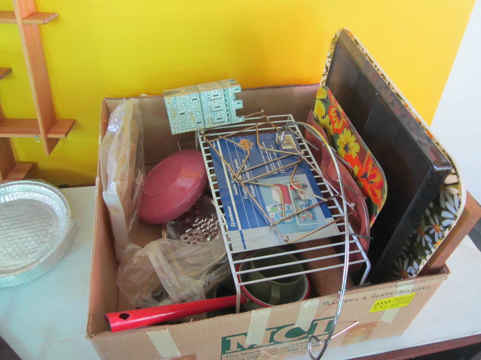Lot 882 BOX OF MISC. - SERVING TRAYS, SHELF UNIT, TIN TRAYS, ETC.