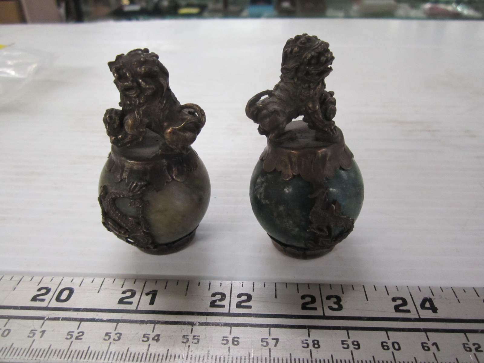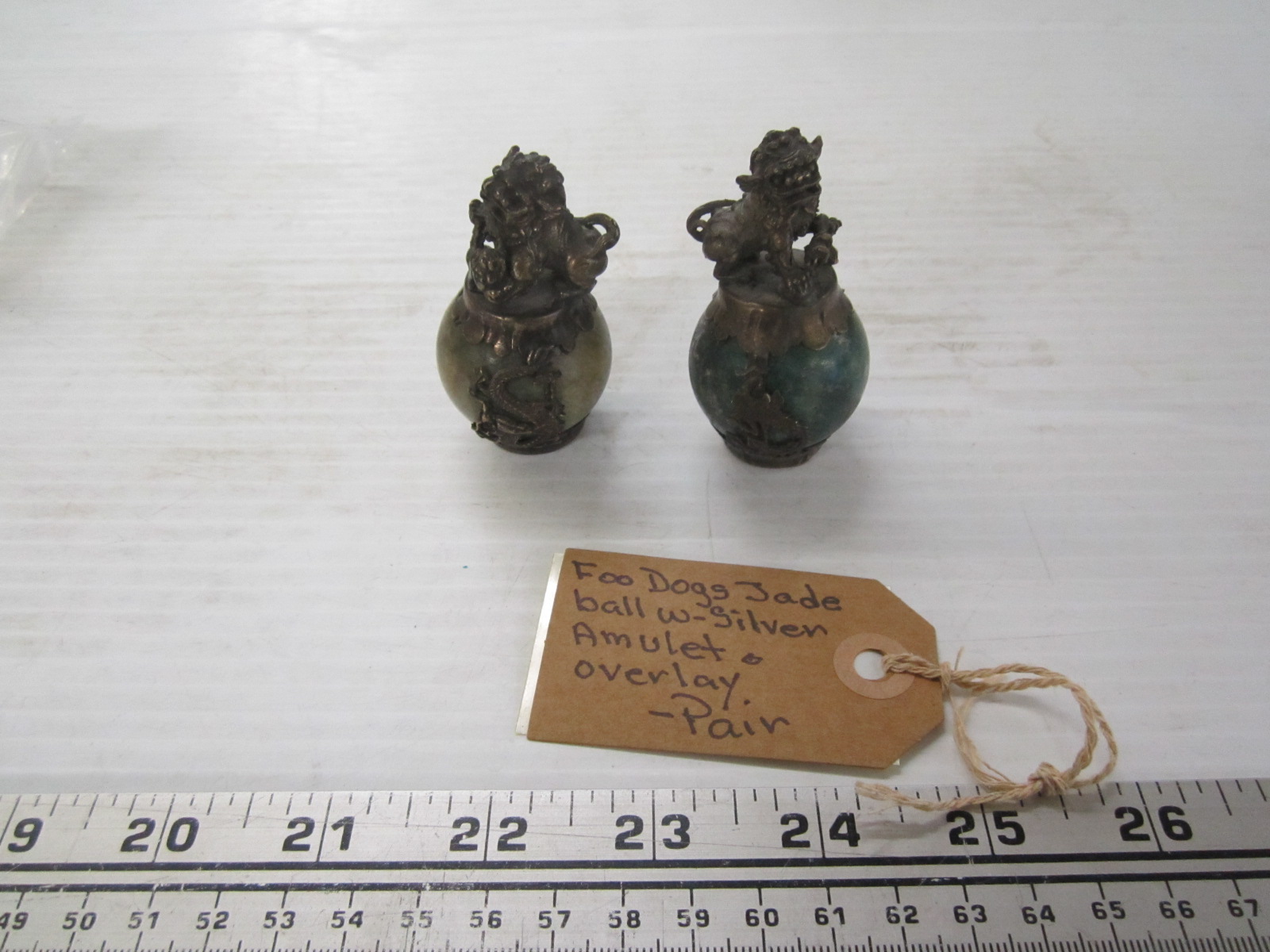 Lot 712 PAIR OF FOO DOGS JADE BALL W/SILVER AMULET & OVERLAY
