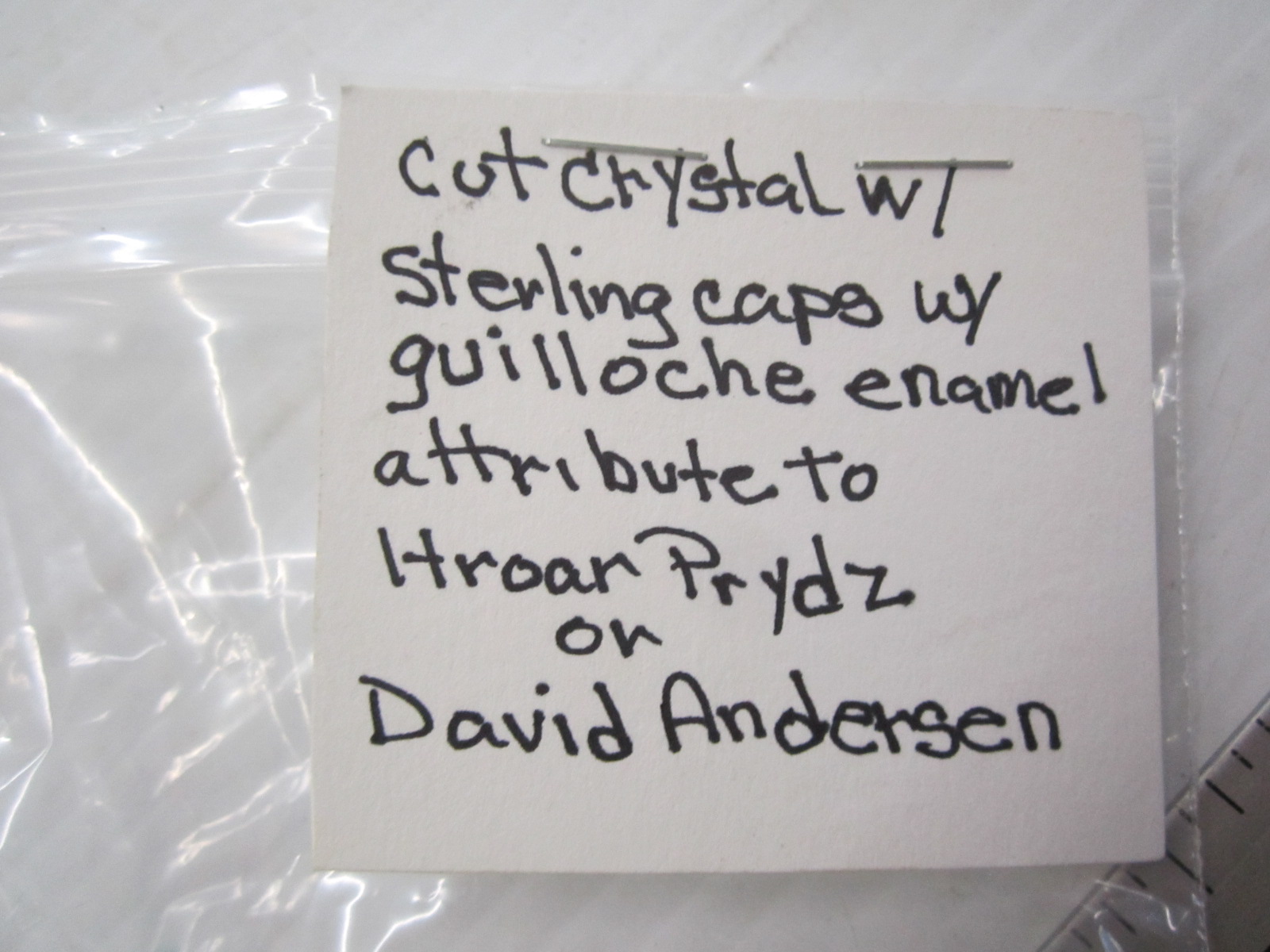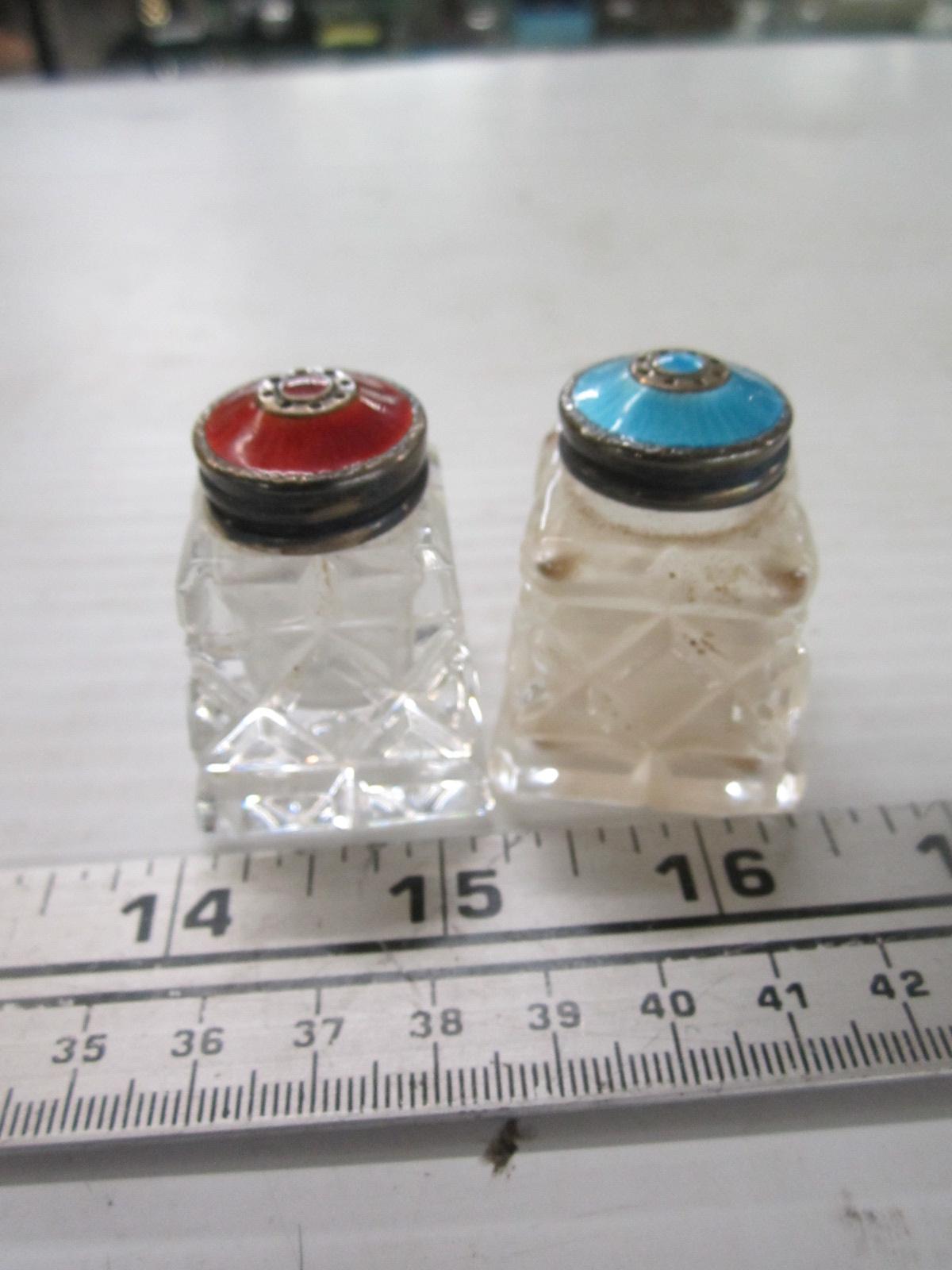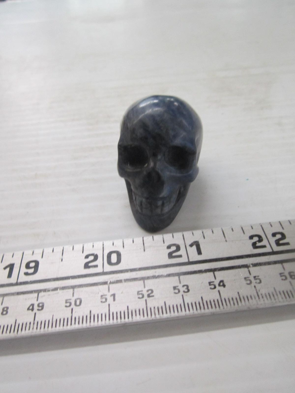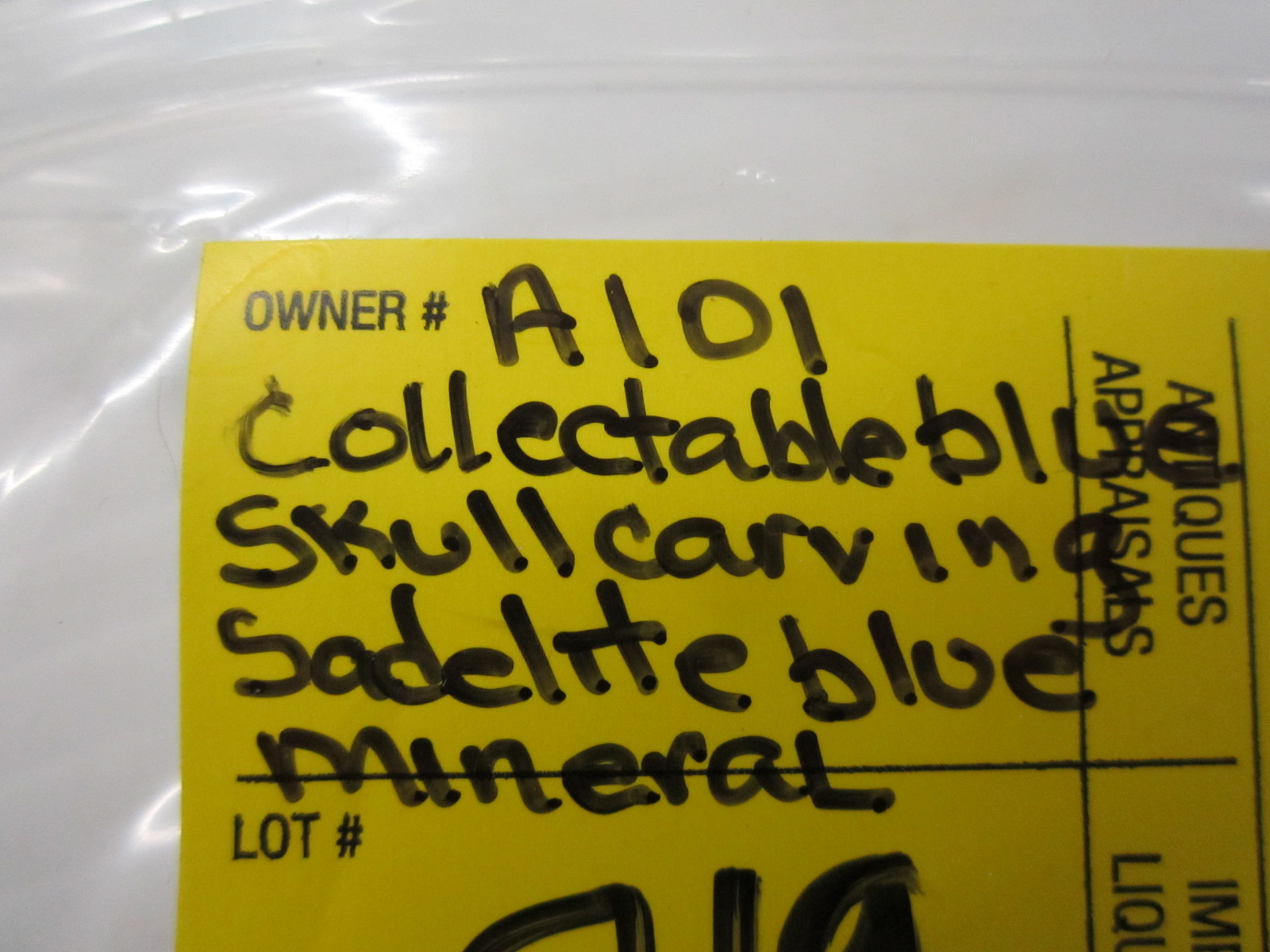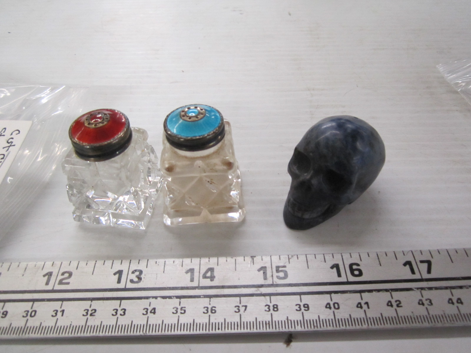 Lot 719 CUT CRYSTAL W/STERLING CAP SALT & PEPPER SHAKER & A COLLECTIBLE BLUE SKULL CARVING