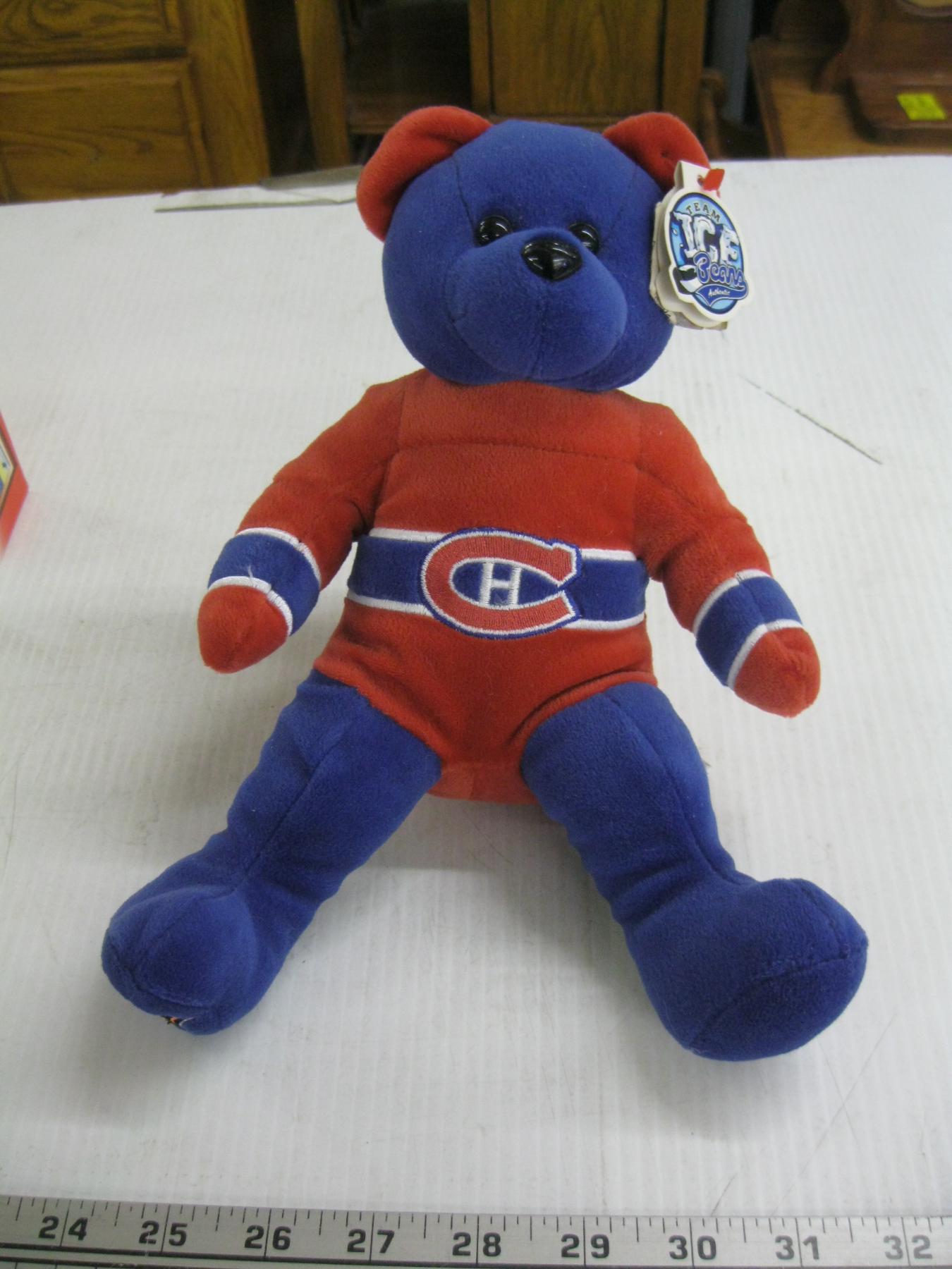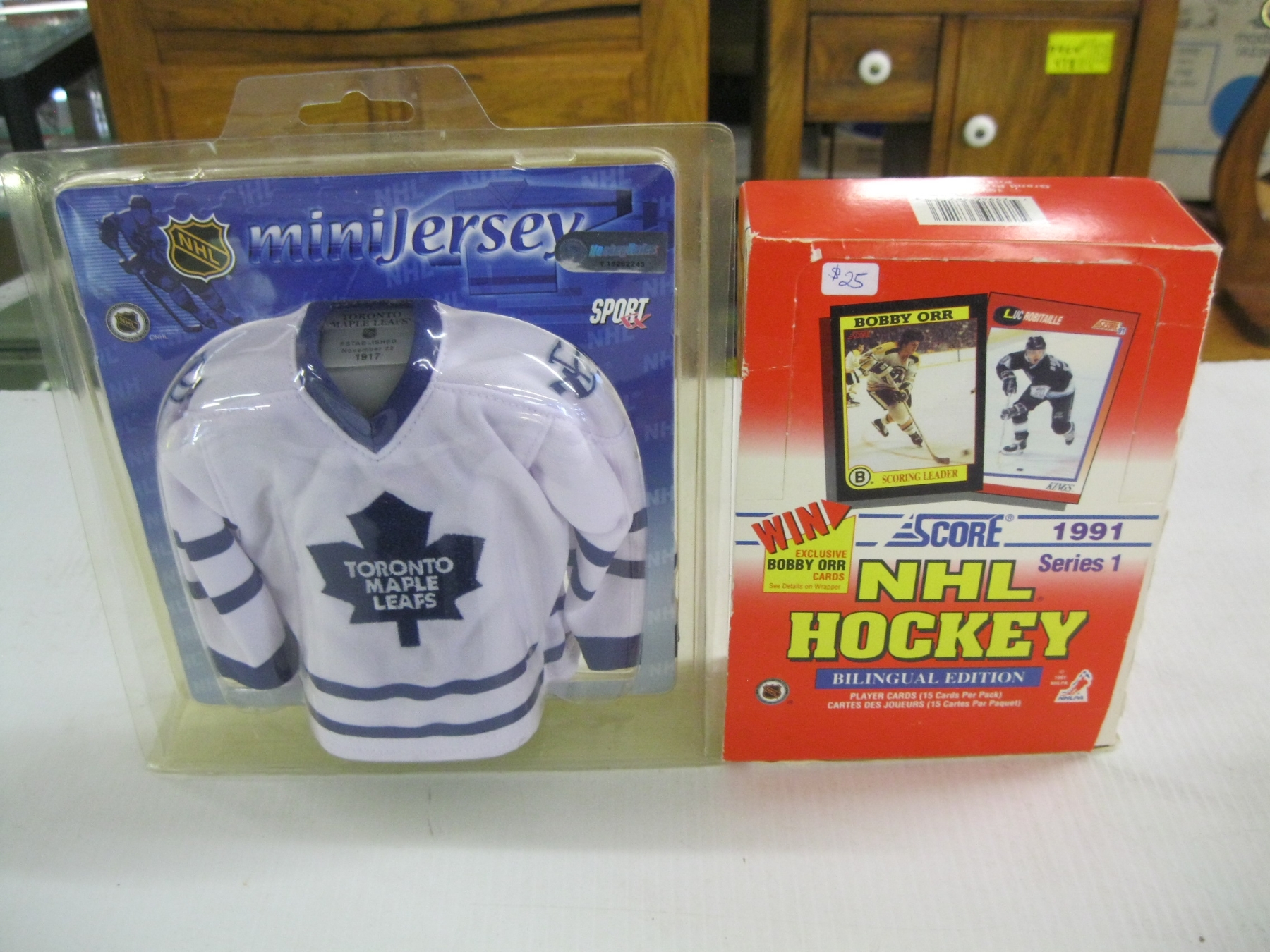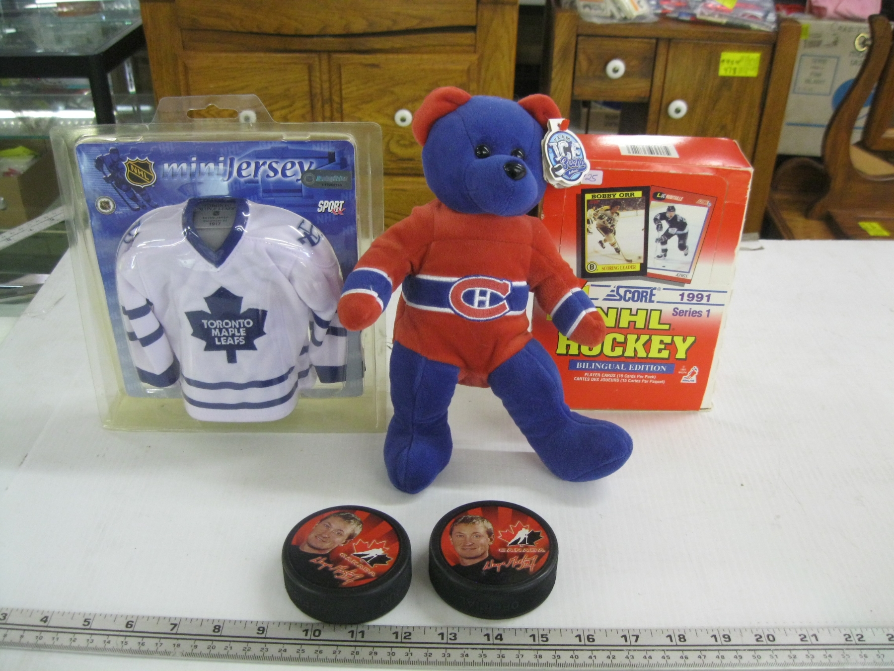 Lot 670 1991 NHL HOCKEY CARD BOX SET, MINI JERSEY, HOCKEY PUCKS, STUFFED BEAR