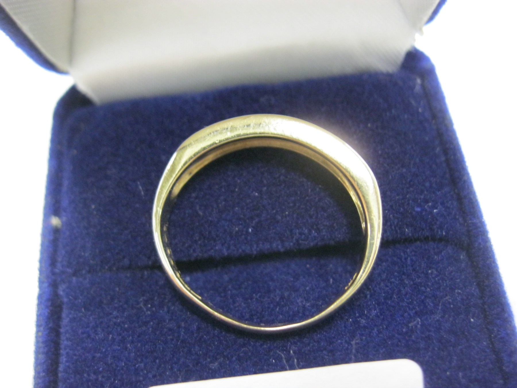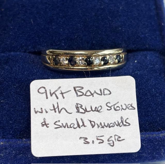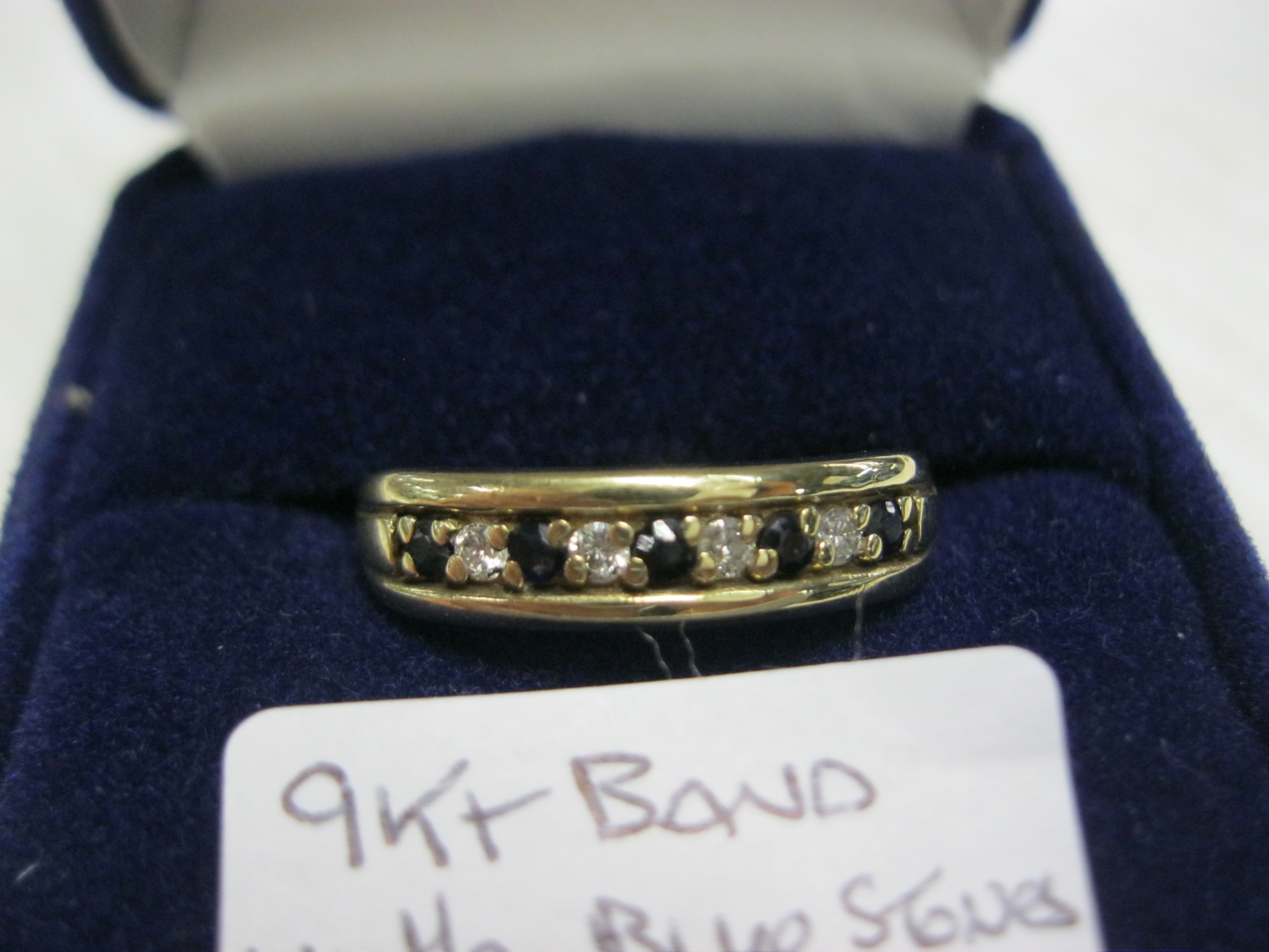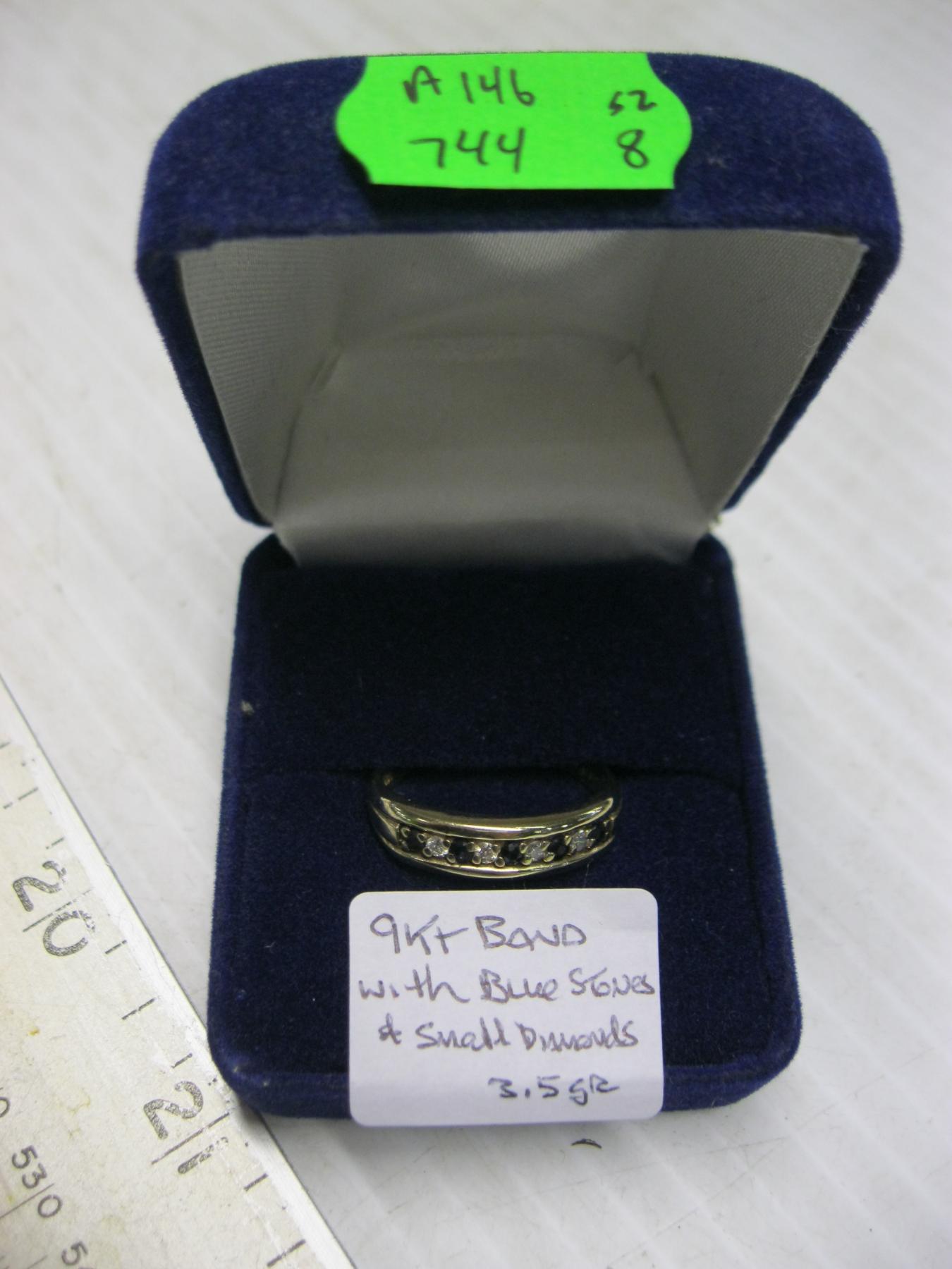 Lot 744 9KT BAND W/BLUE STONES & SMALL DIAMONDS - 3.5G - SZ 8