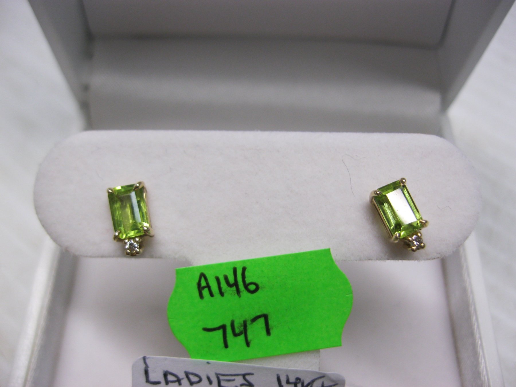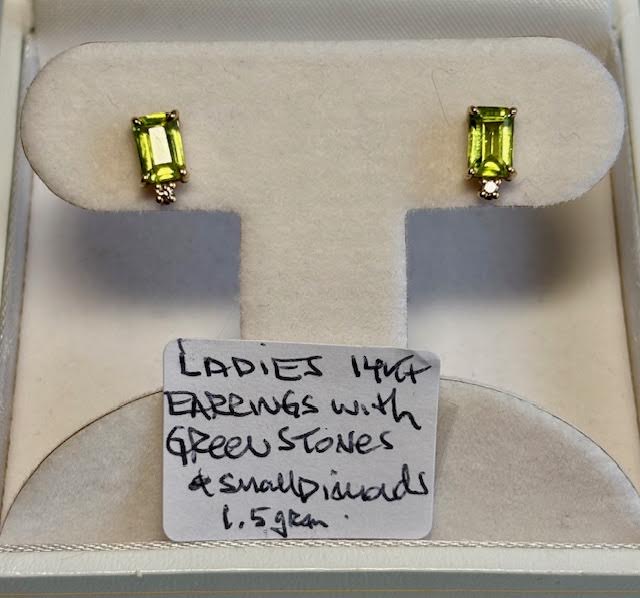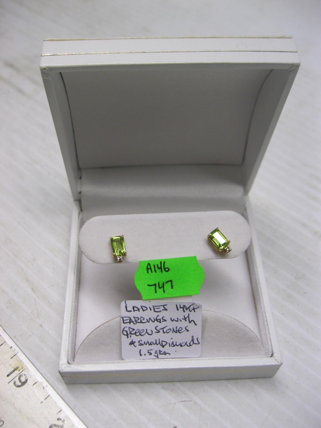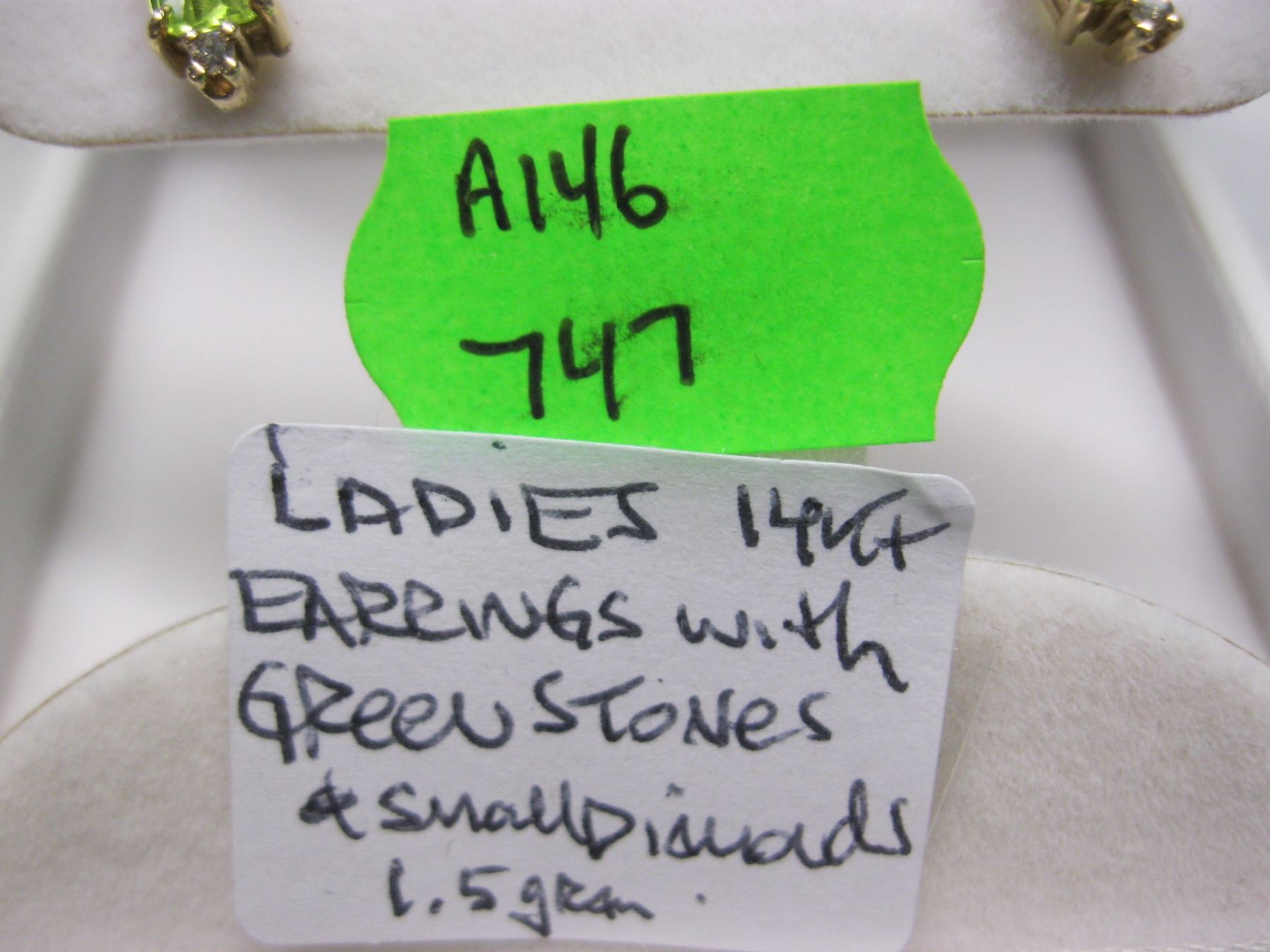 Lot 747 PR OF LADIES 14KT EARRINGS W/GREEN STONES & SMALL DIAMONDS - 1.5G