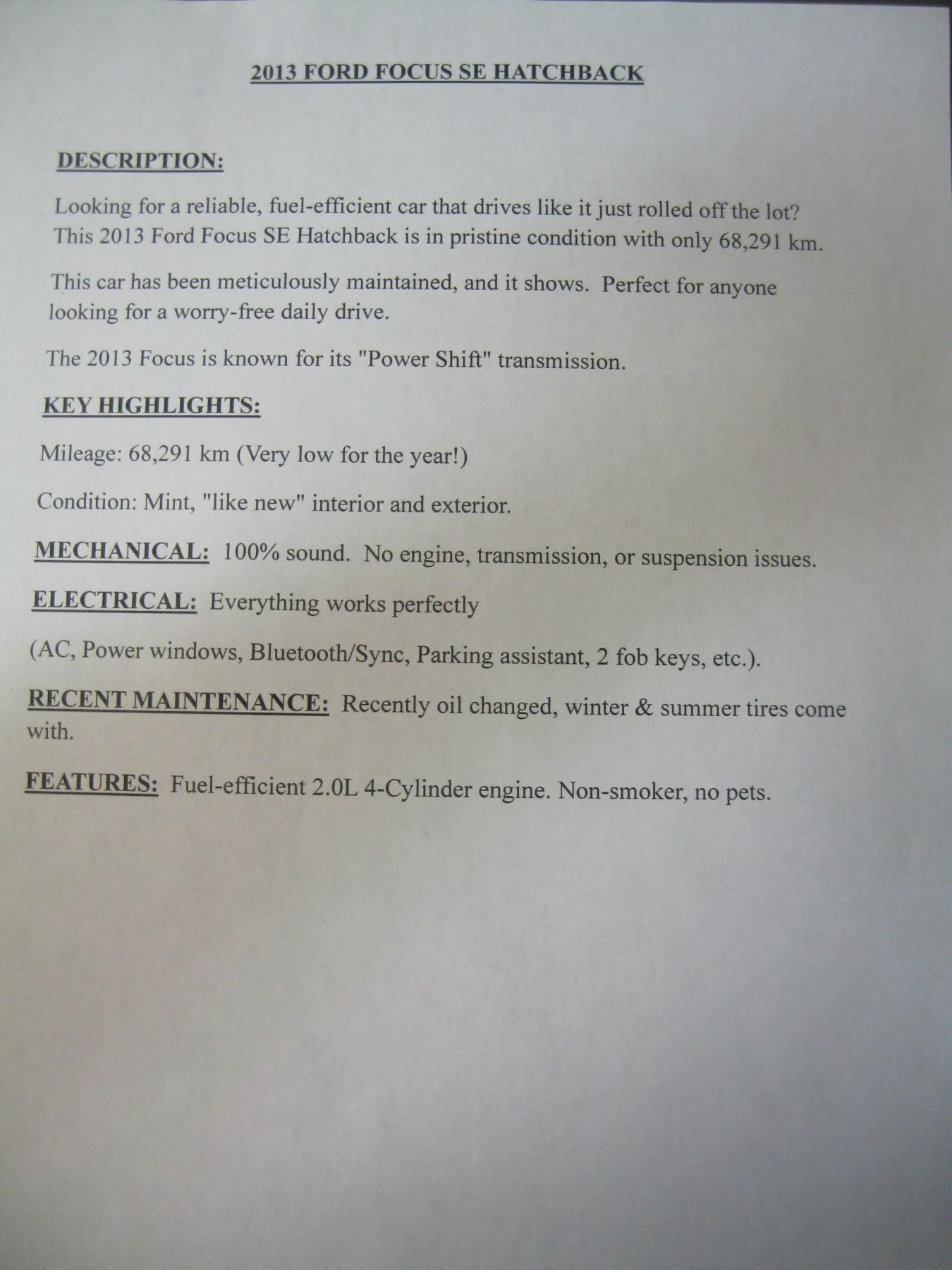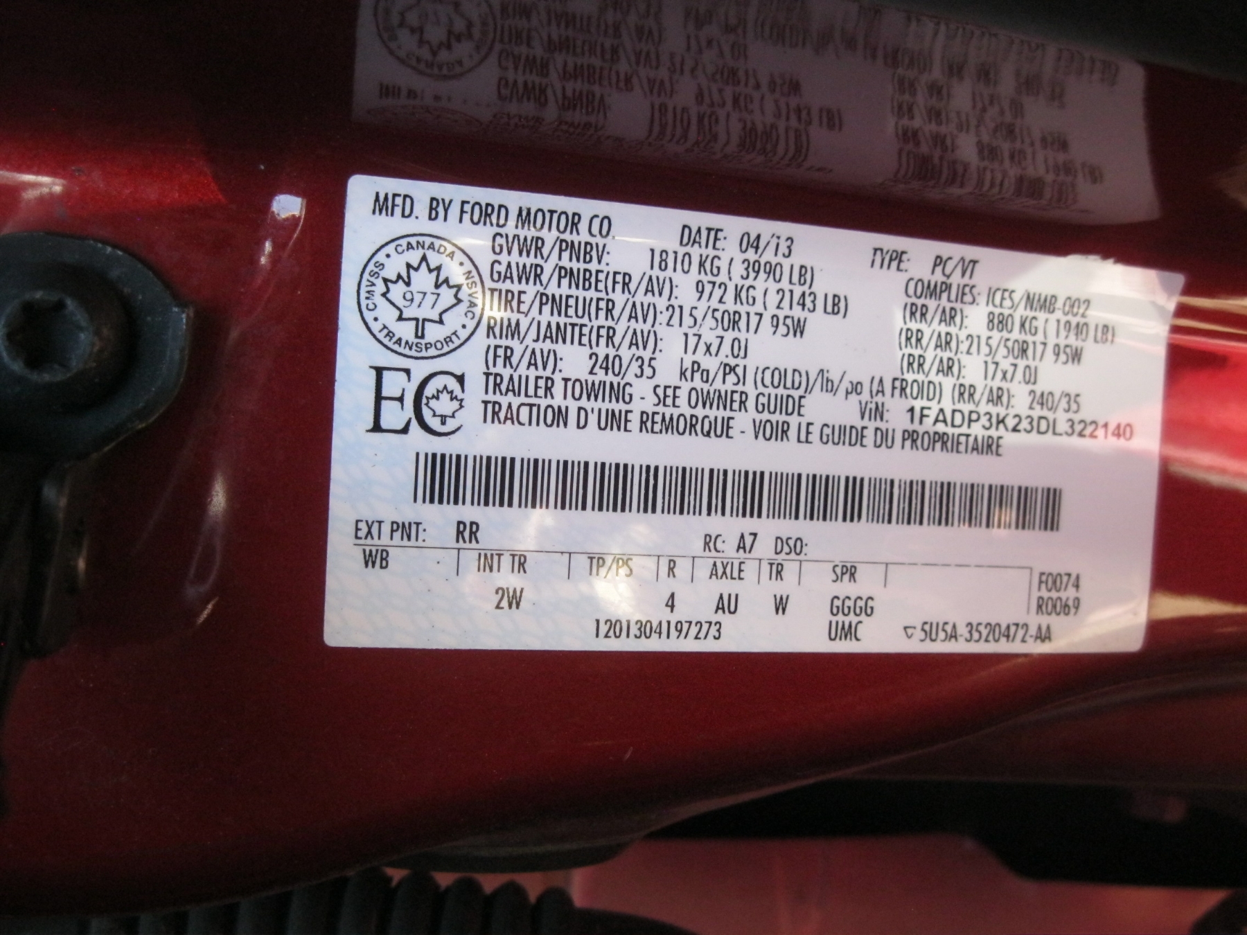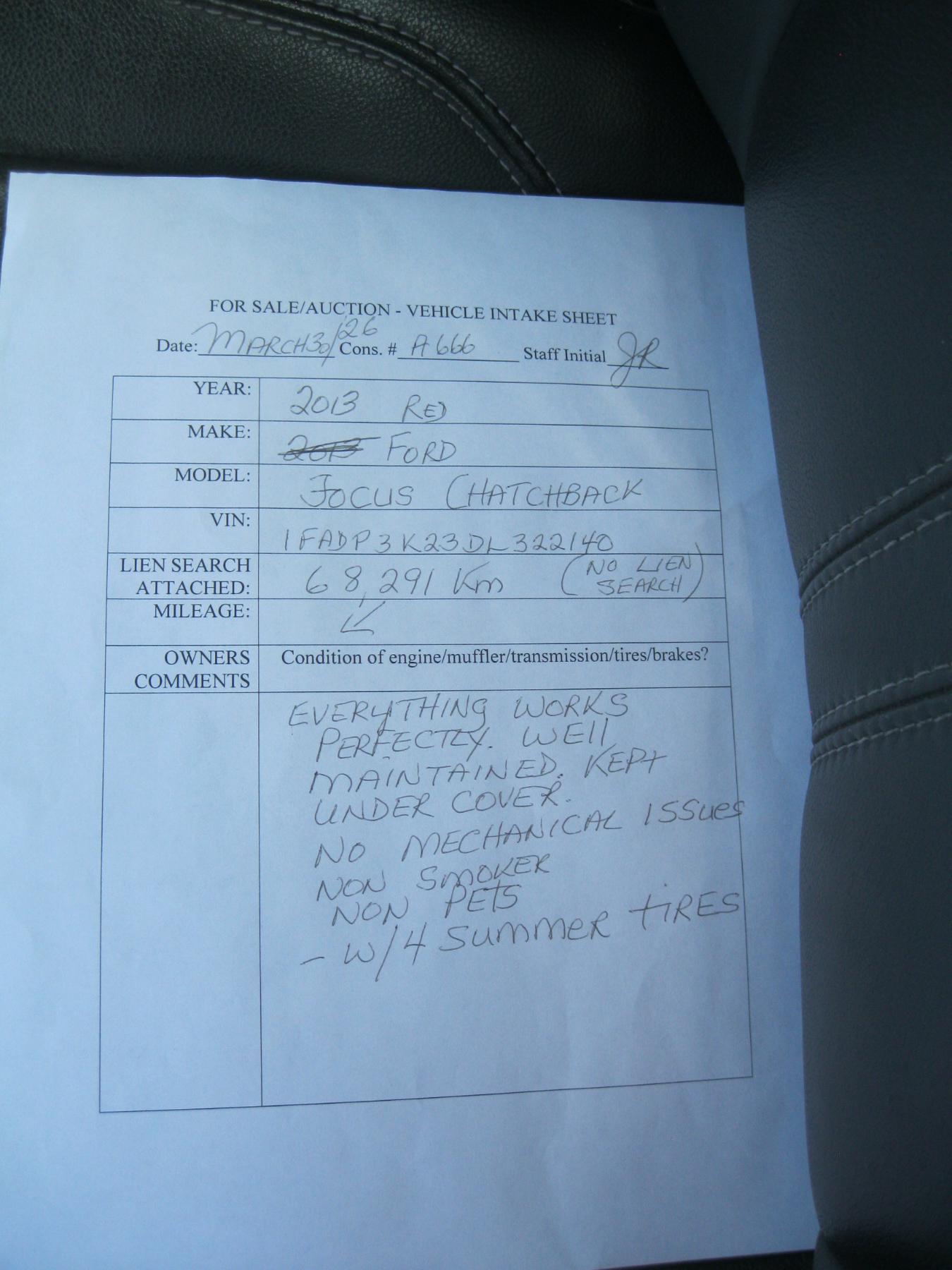 Lot 1001 2013 FORD FOCUS HATCHBACK - VIN # 68,291 KM, W/PAPERS