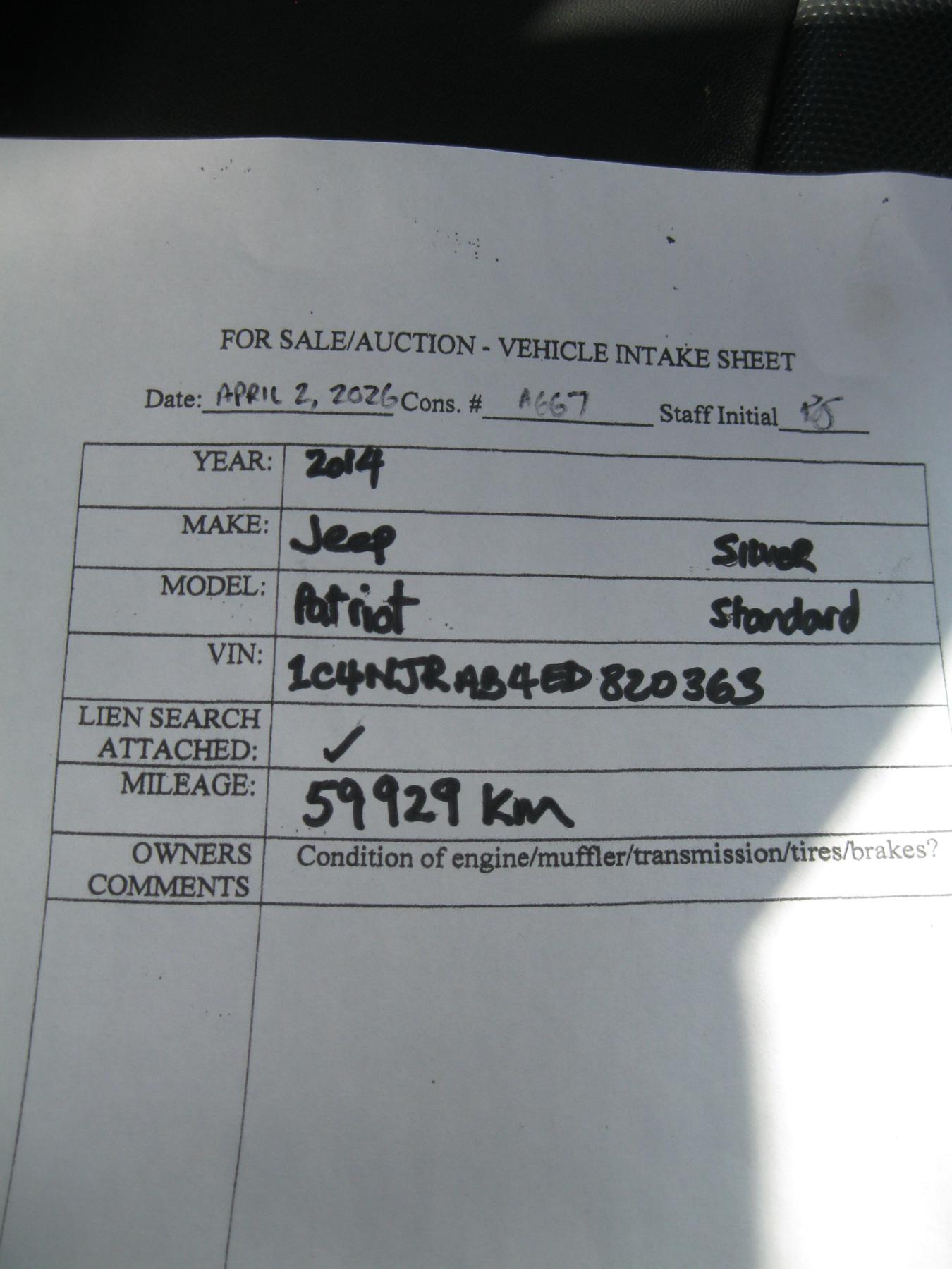 Lot 1061 2014 JEEP PATRIOT - VIN #1C4NJRAB4ED820363, 59,929 KM W/PAPERS