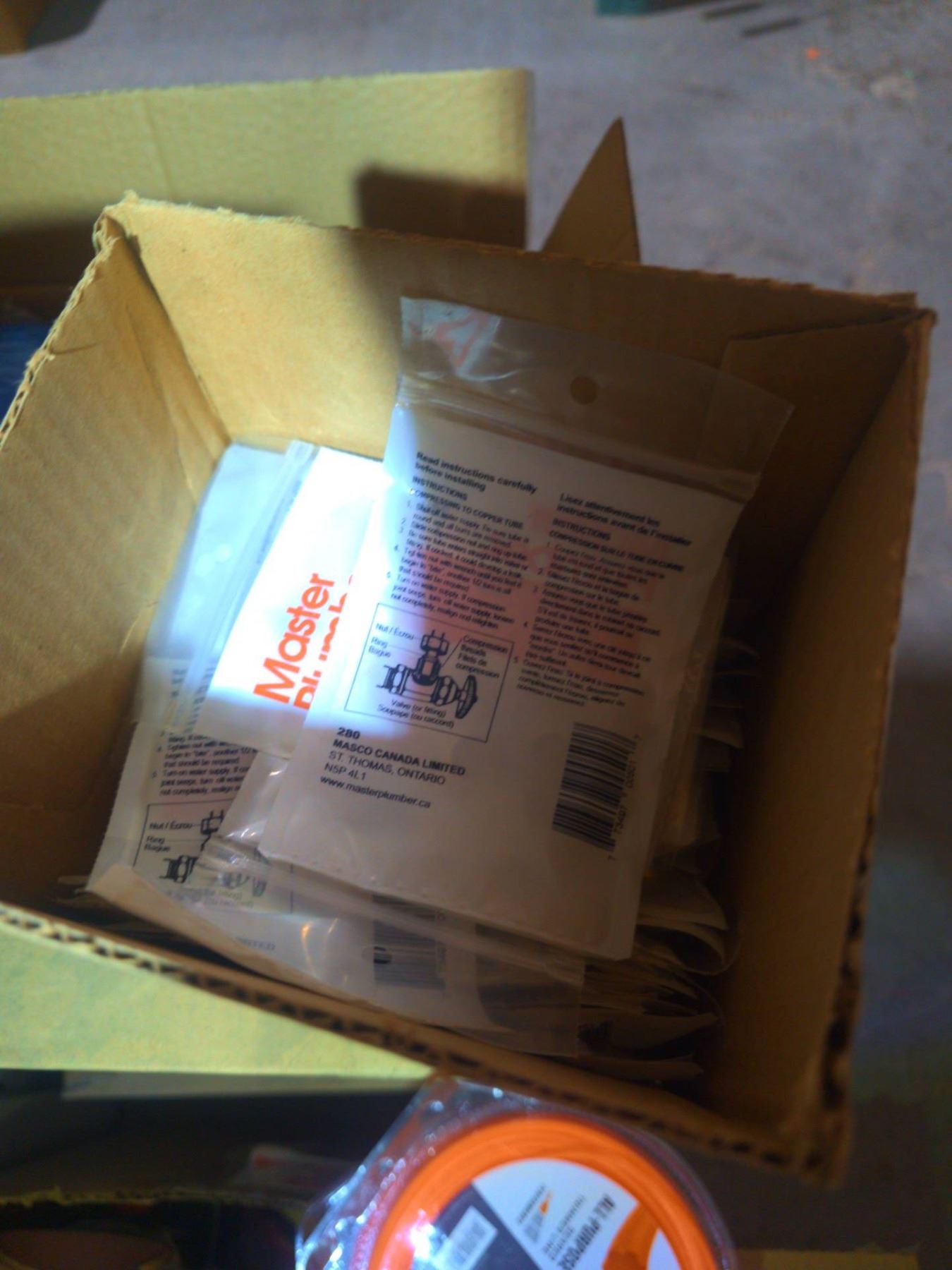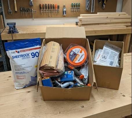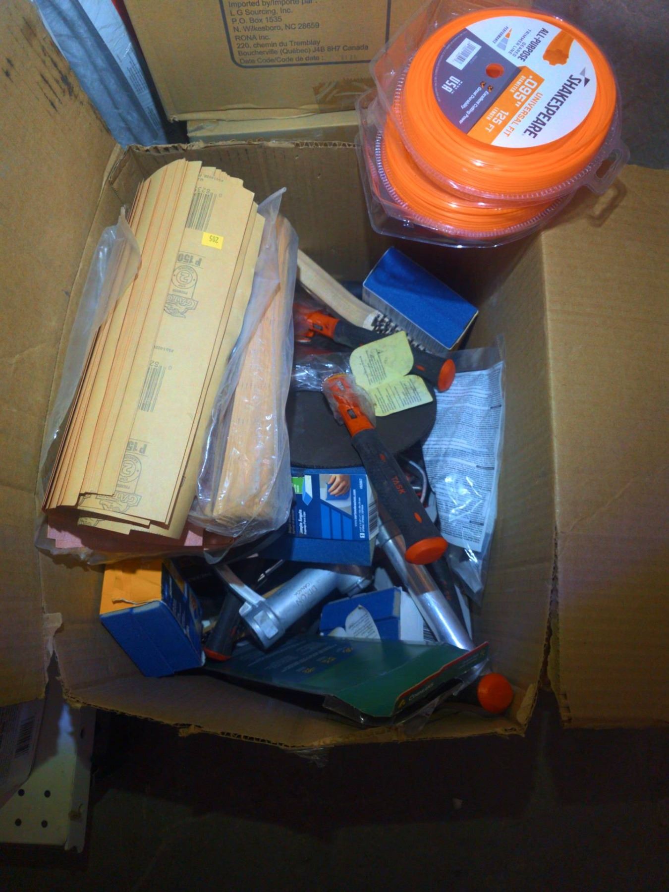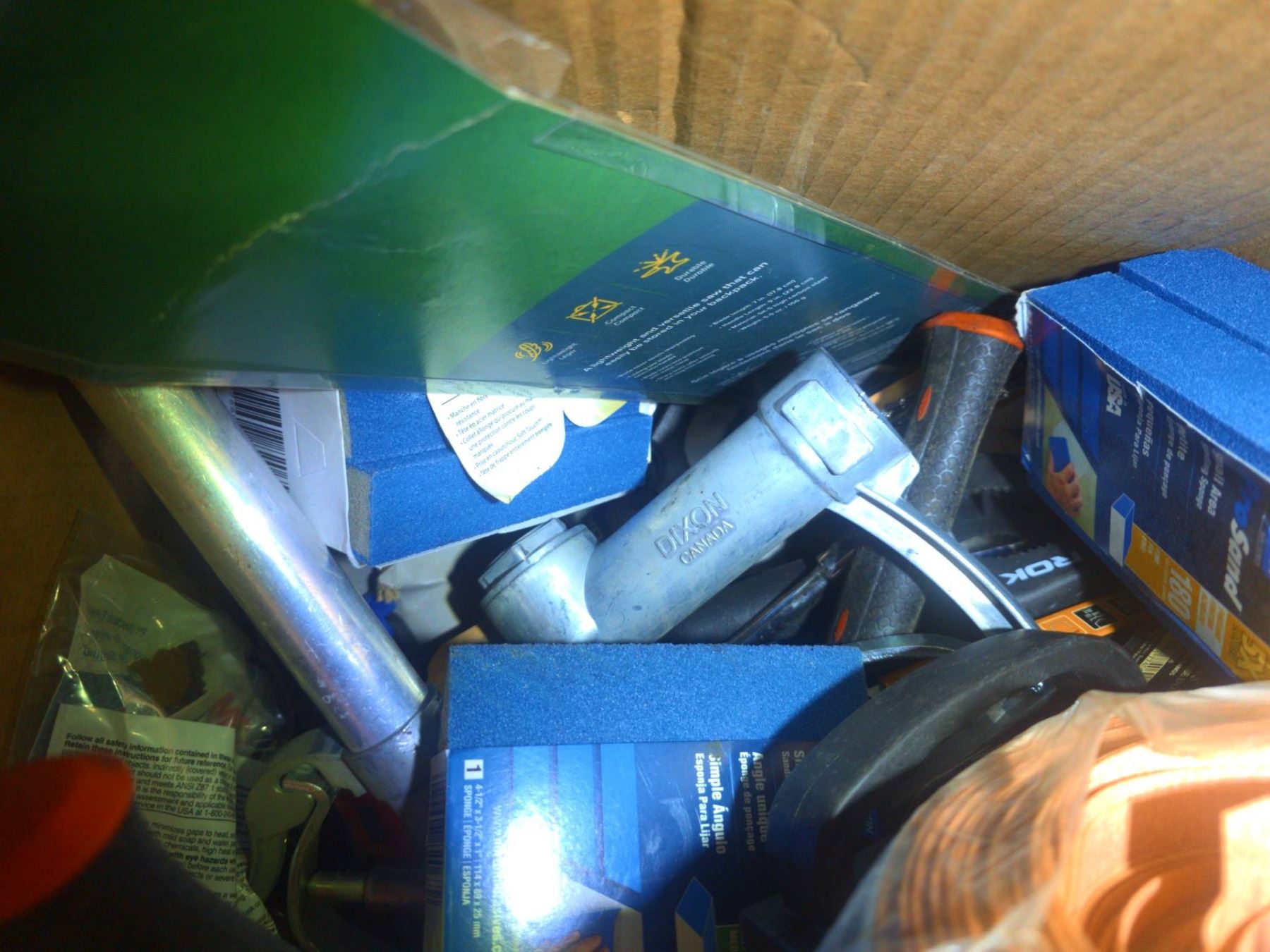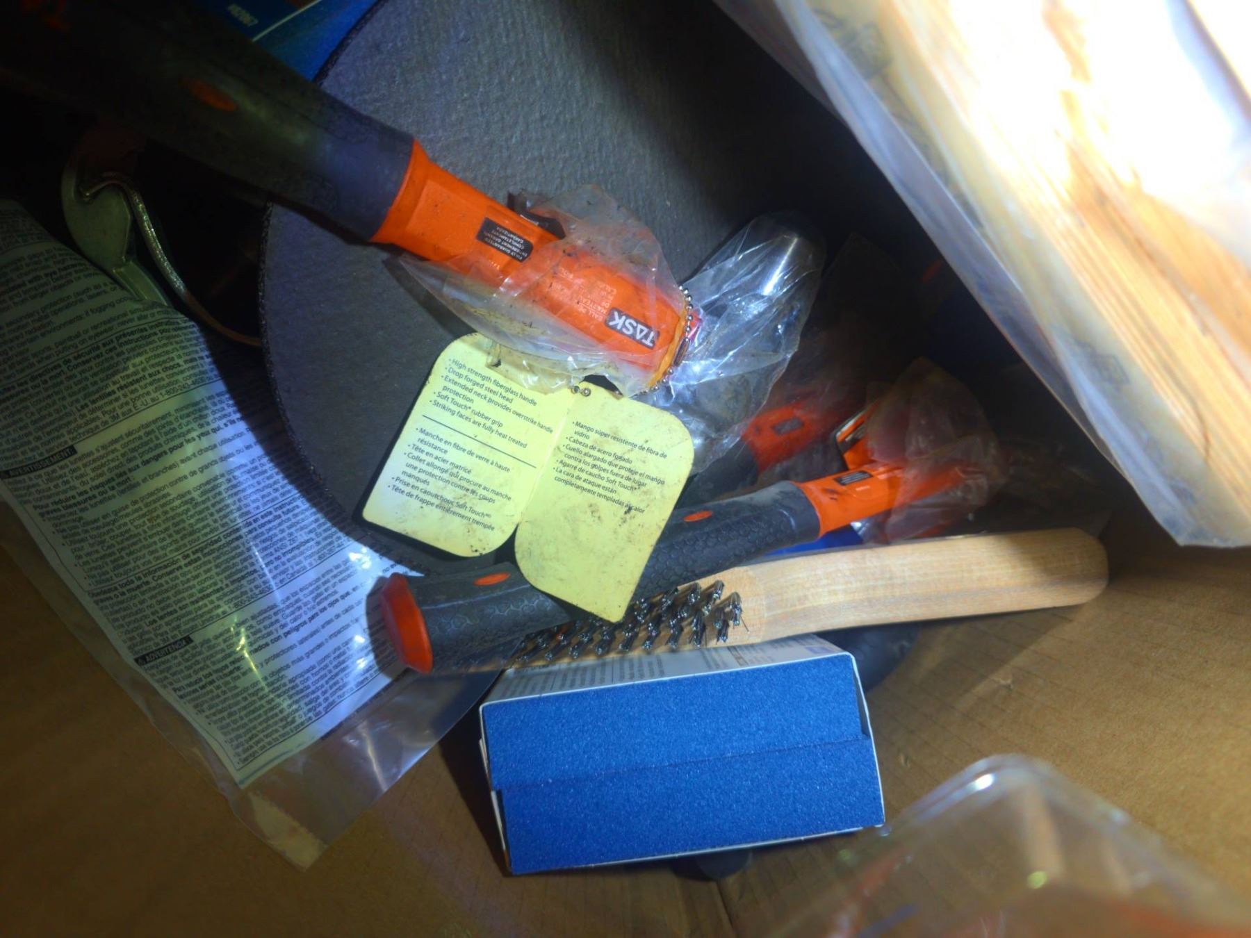 Box lot of Assorted Shop supplies, Drywall compound, toold and more