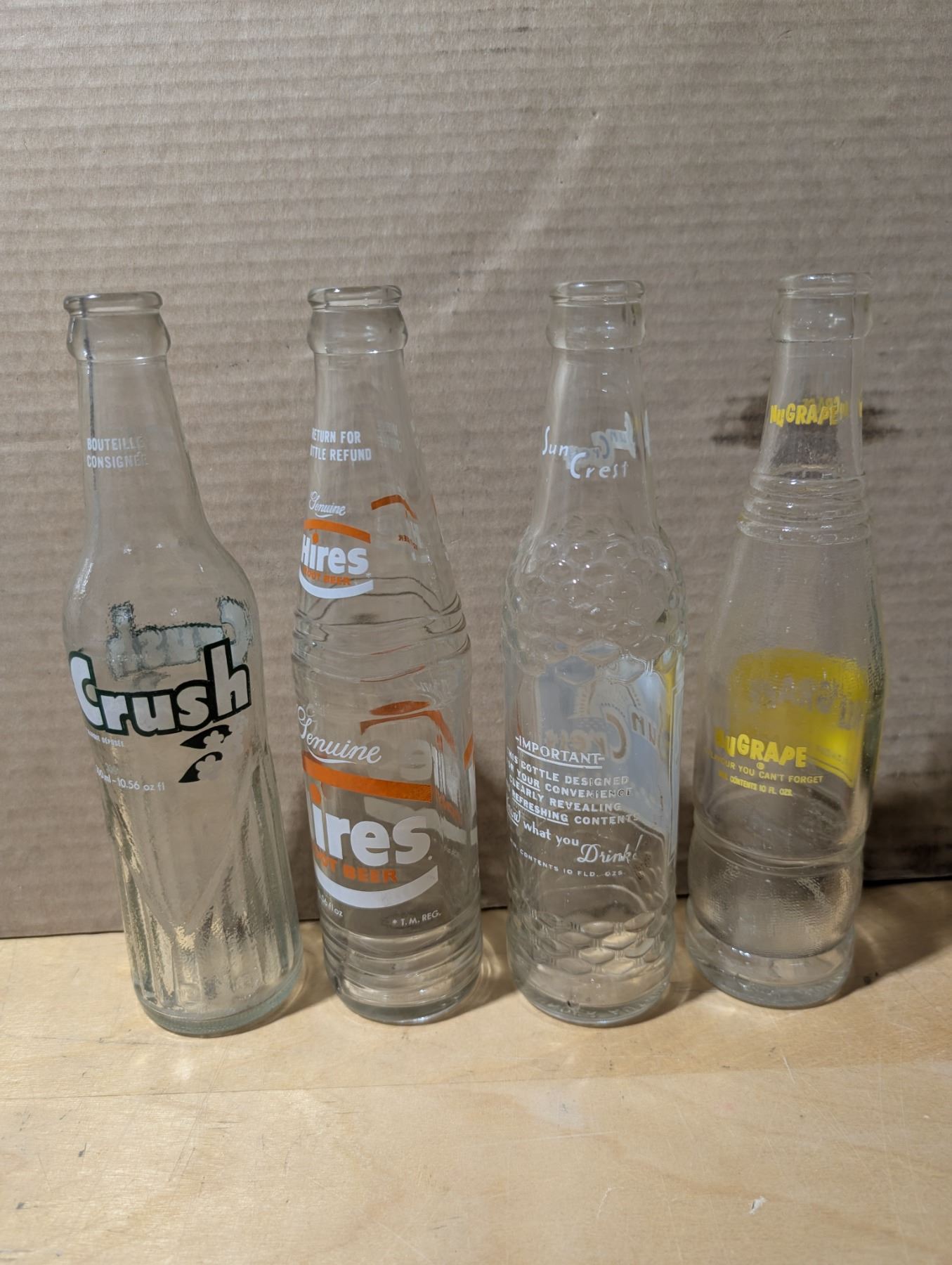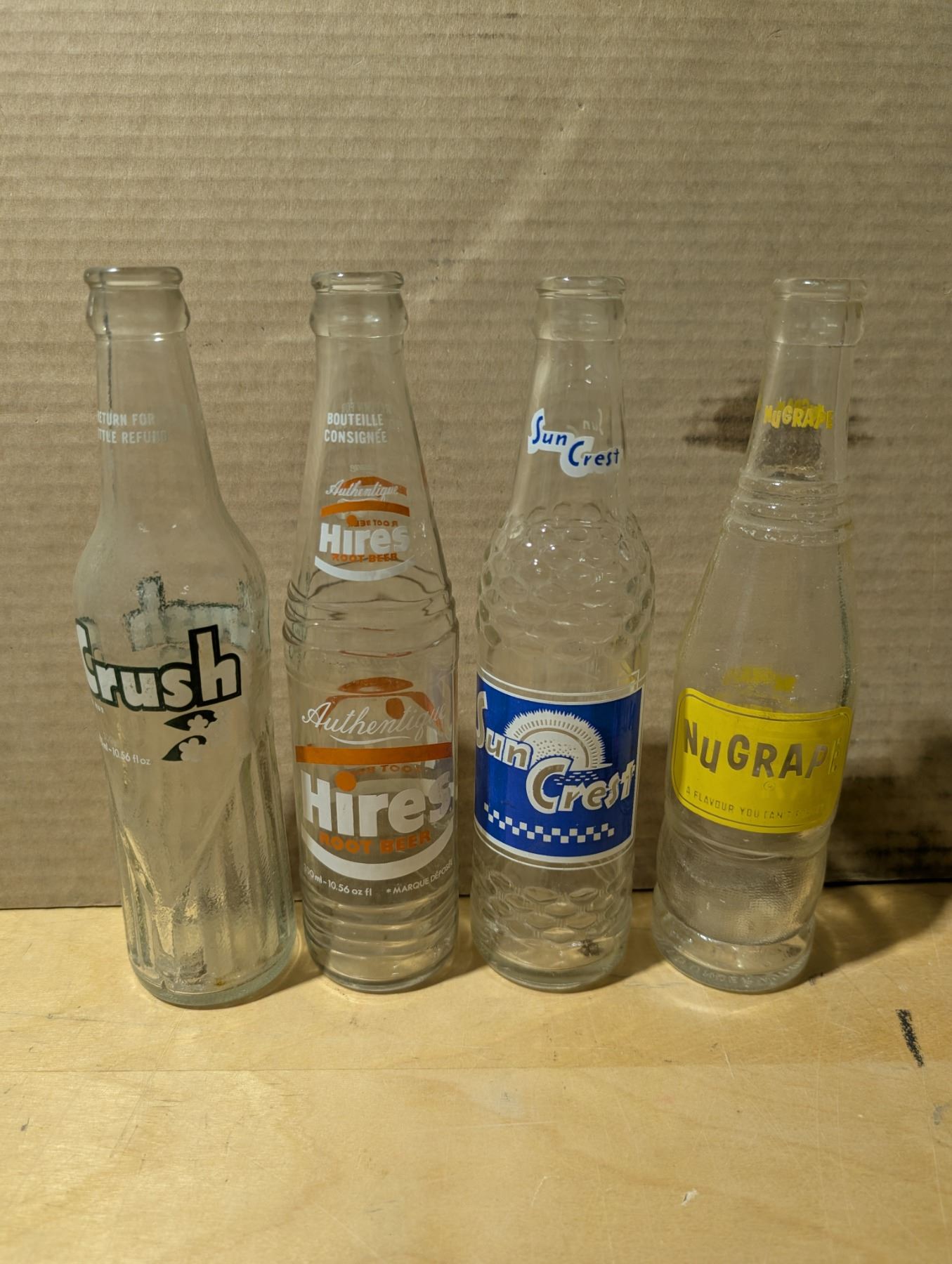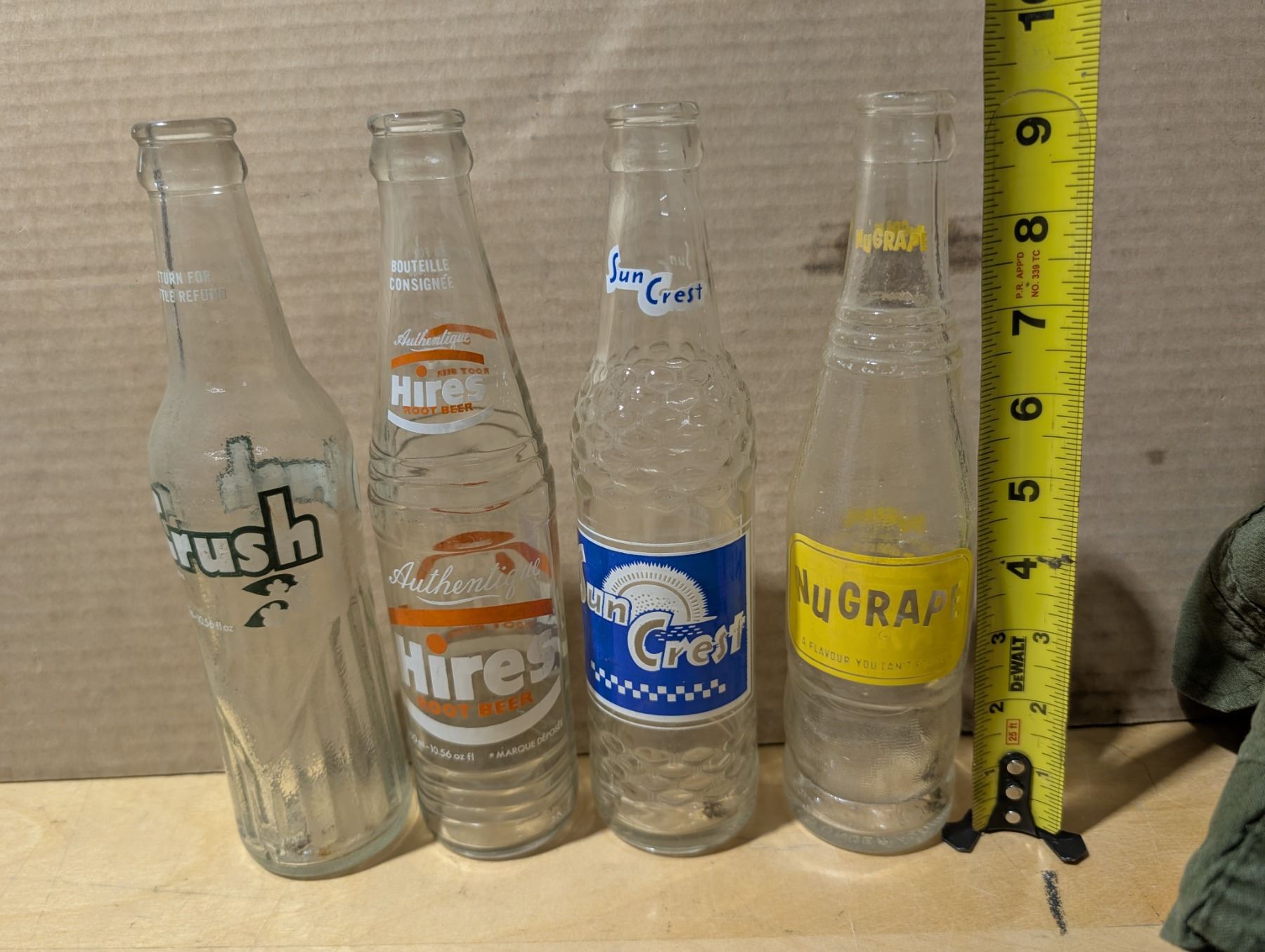 (4) Vintage Pop Bottles (Crush/Sun Crest/Nugrape/Hires)
