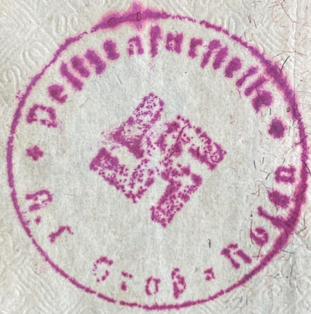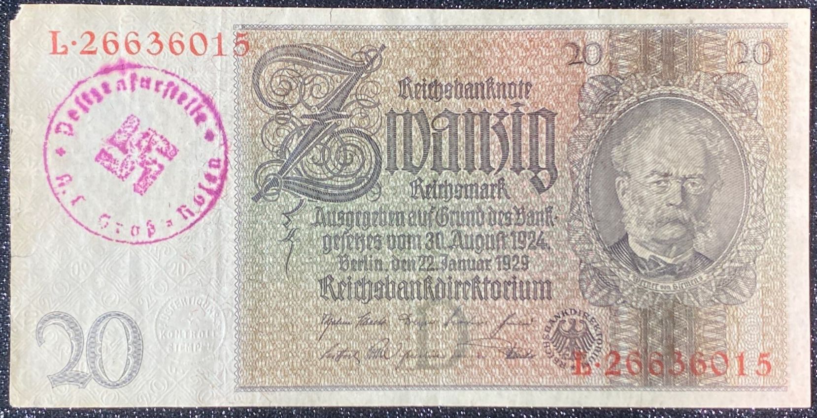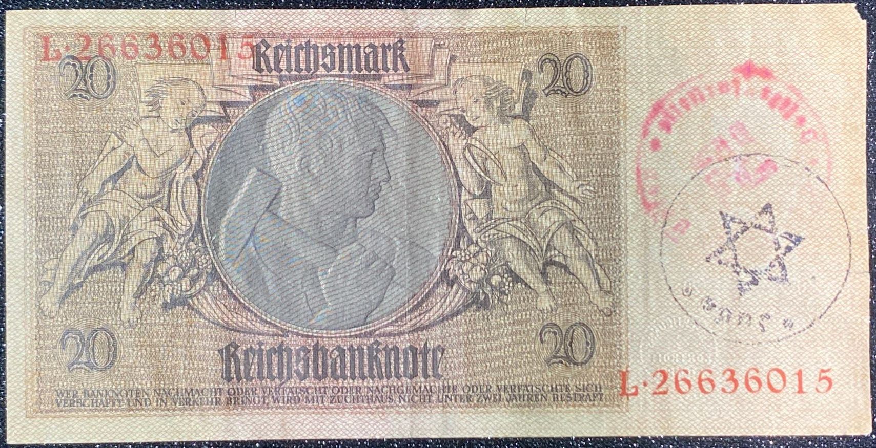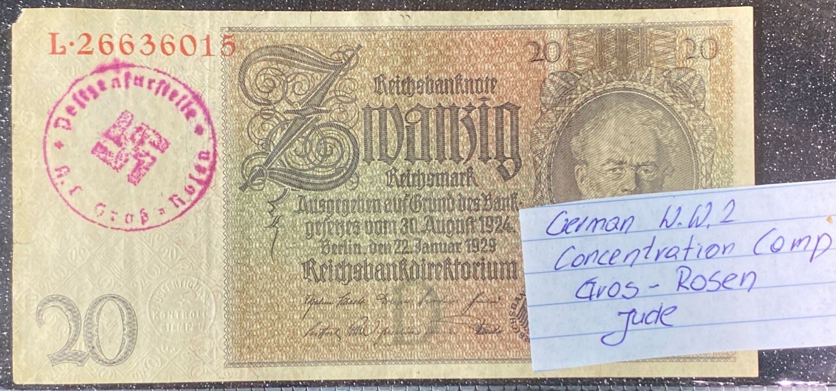Lot 31 1929 German 20 Reichsmark Banknote Stamped Gros Rosen Concentration Camp