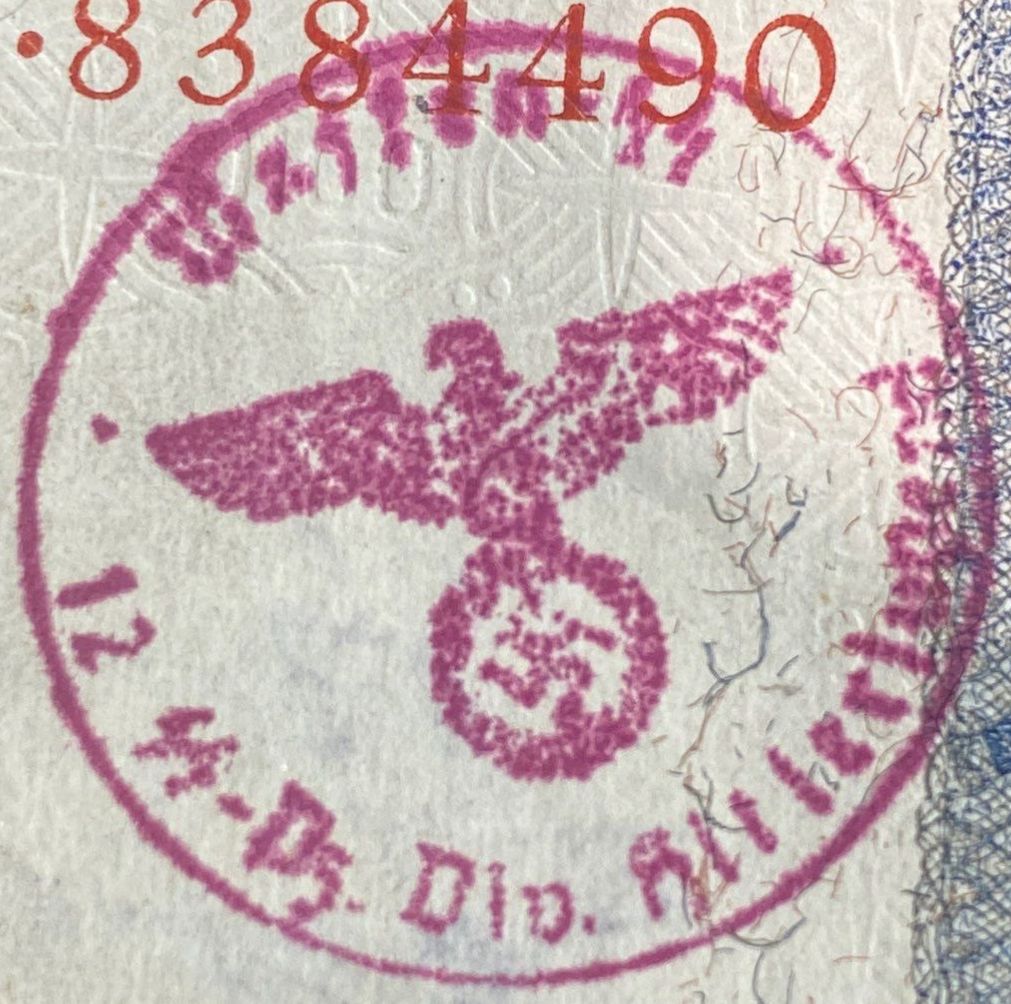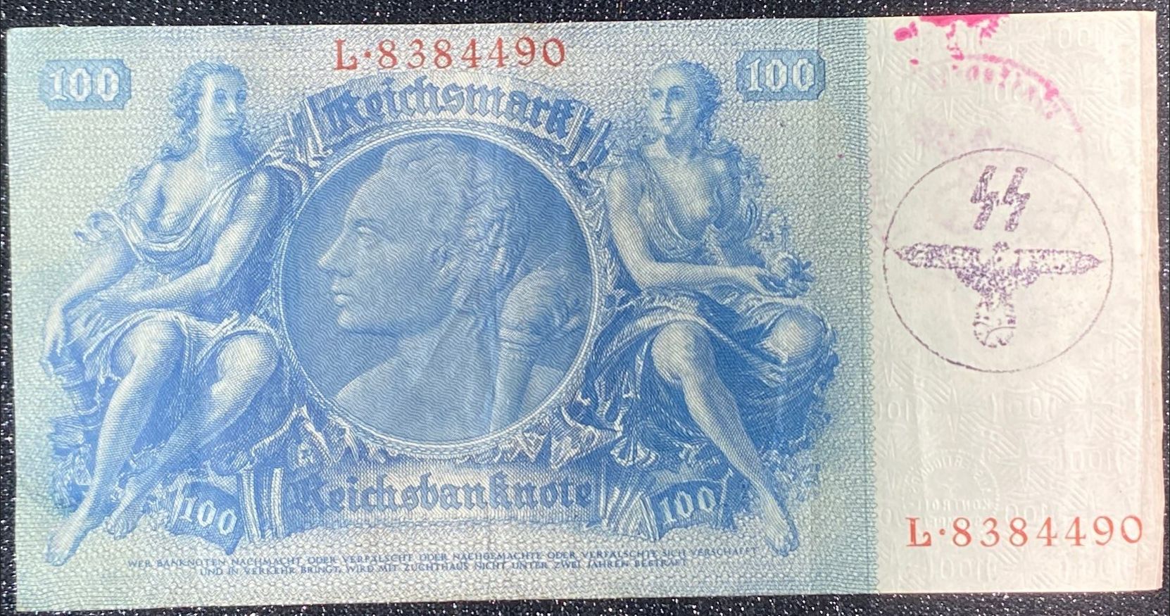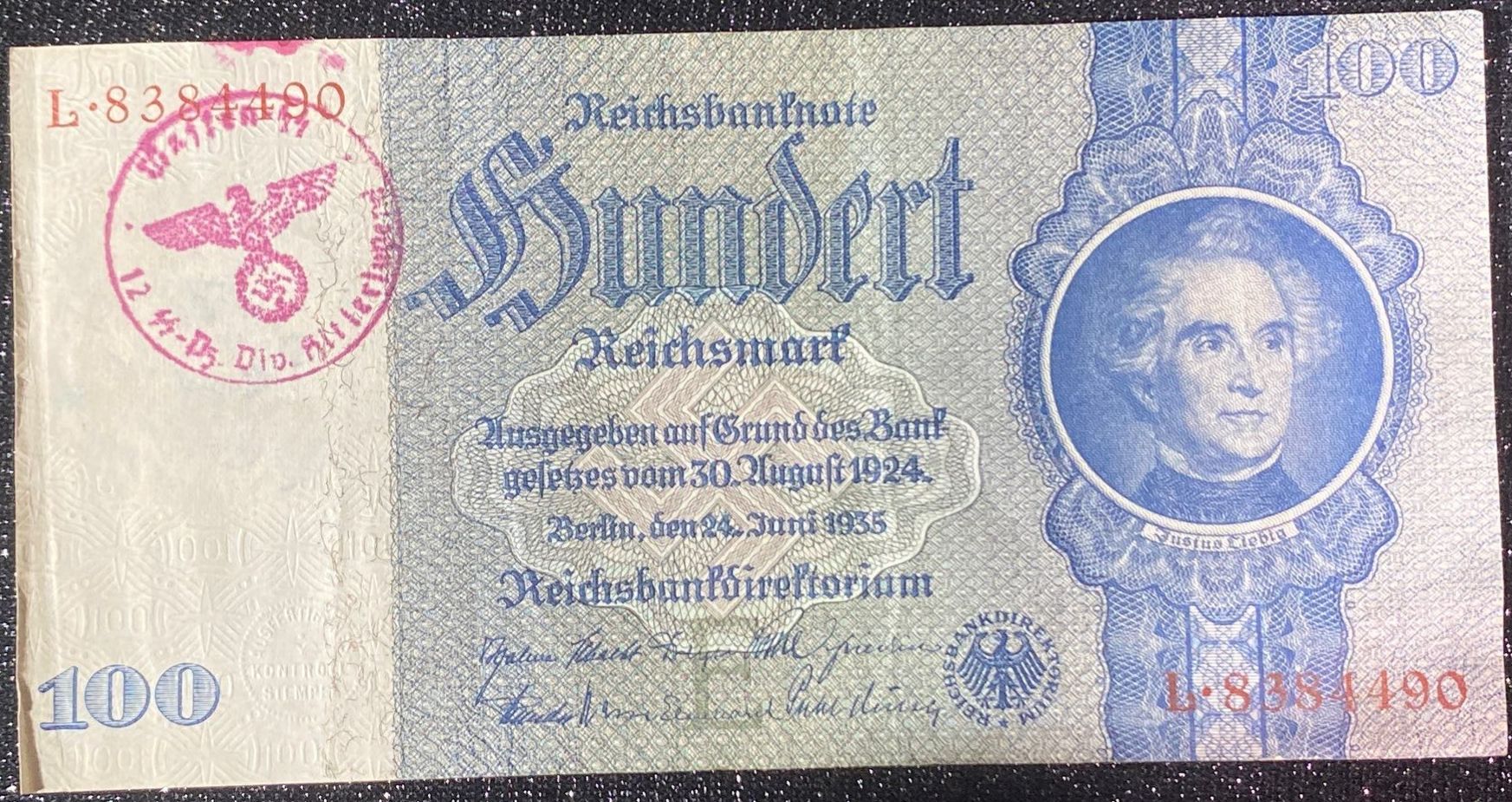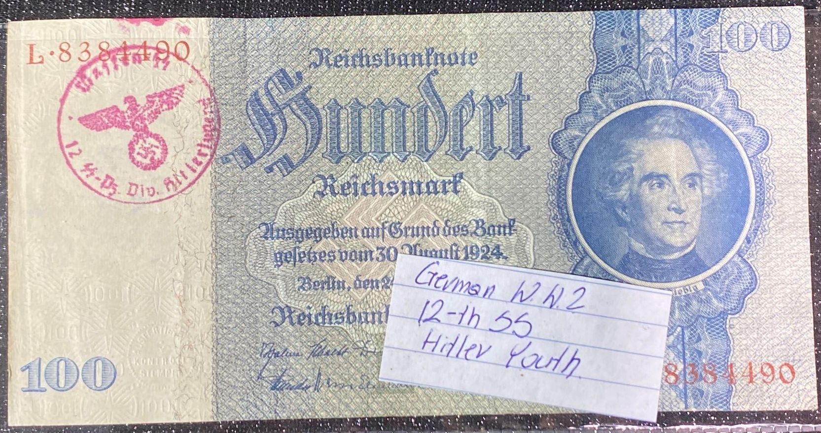 Lot 33 1935 German 100 Reichsmark Banknote Stamped 12th SS Hitler Youth