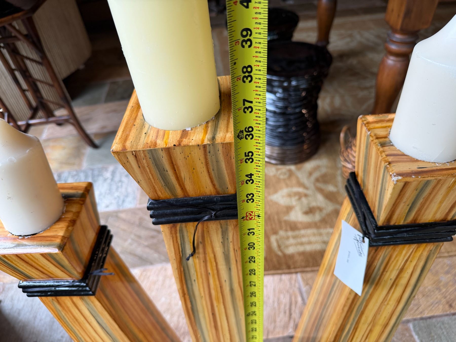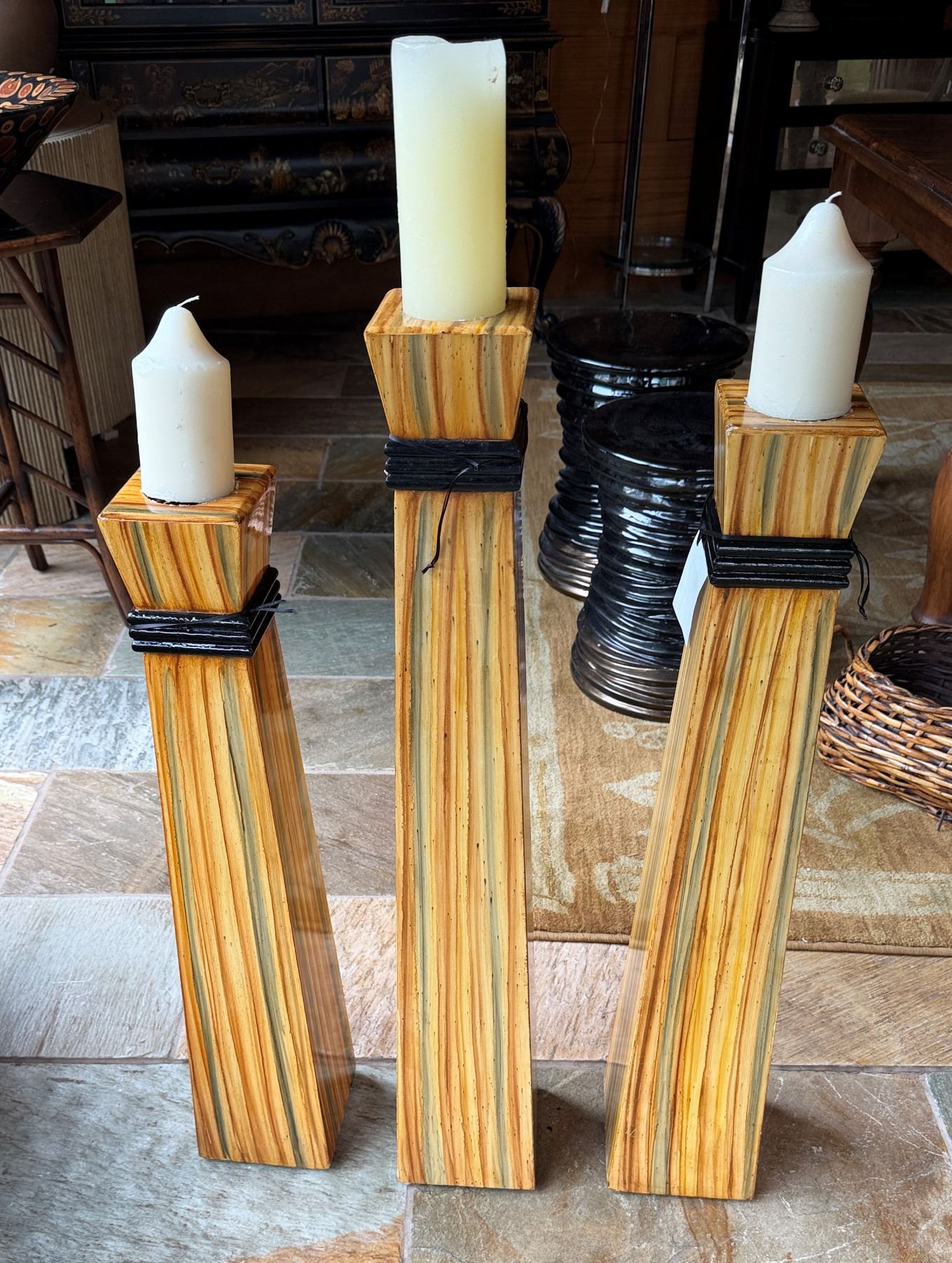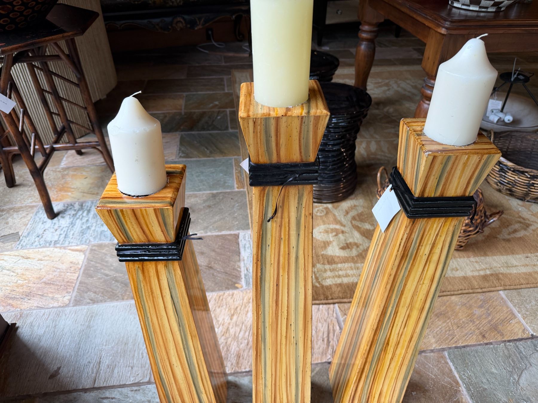 Lot 18 Qty 3 Floor Pillar Candle Holders w/ Striped Design & 3 White Candles, Misc Sizes