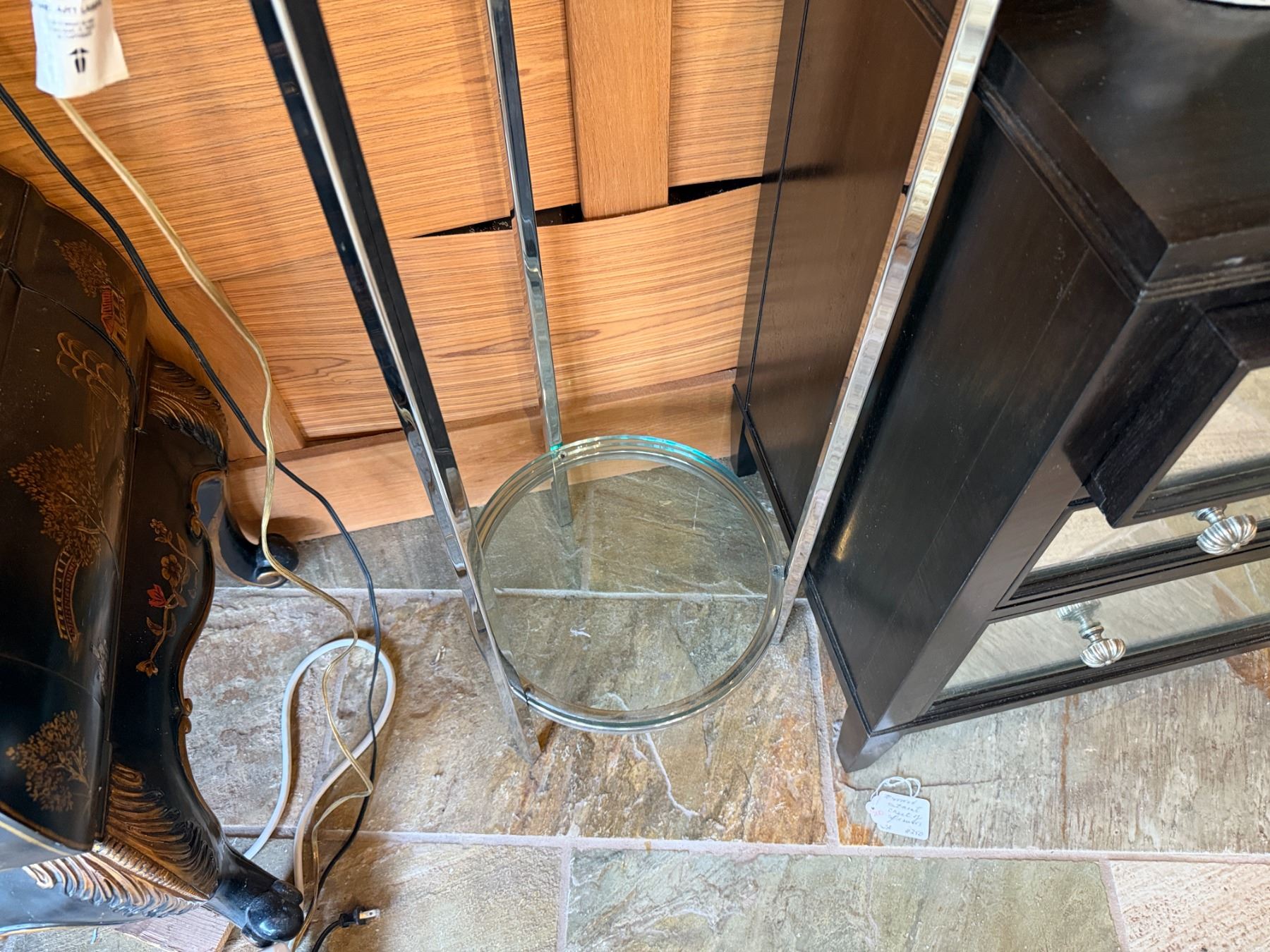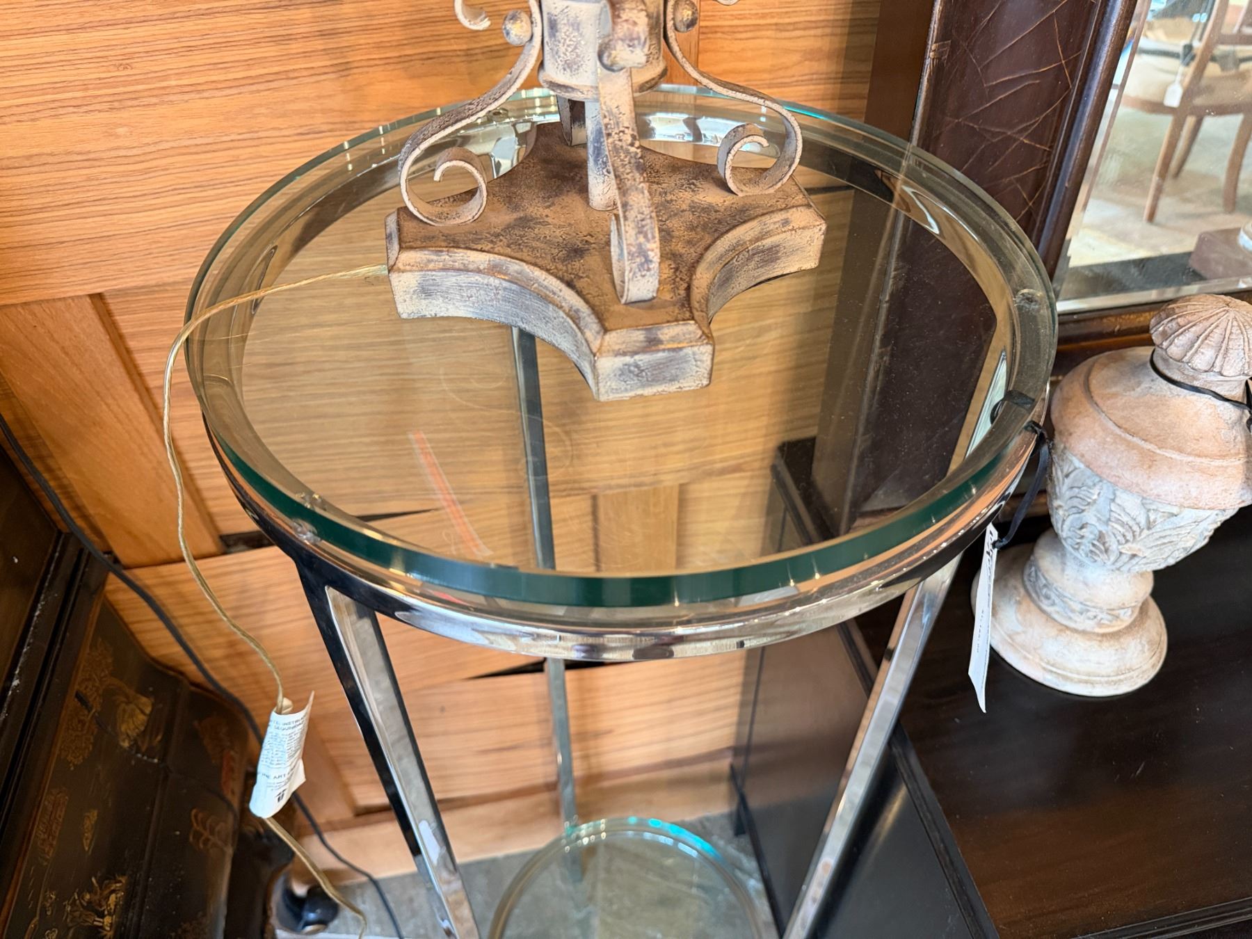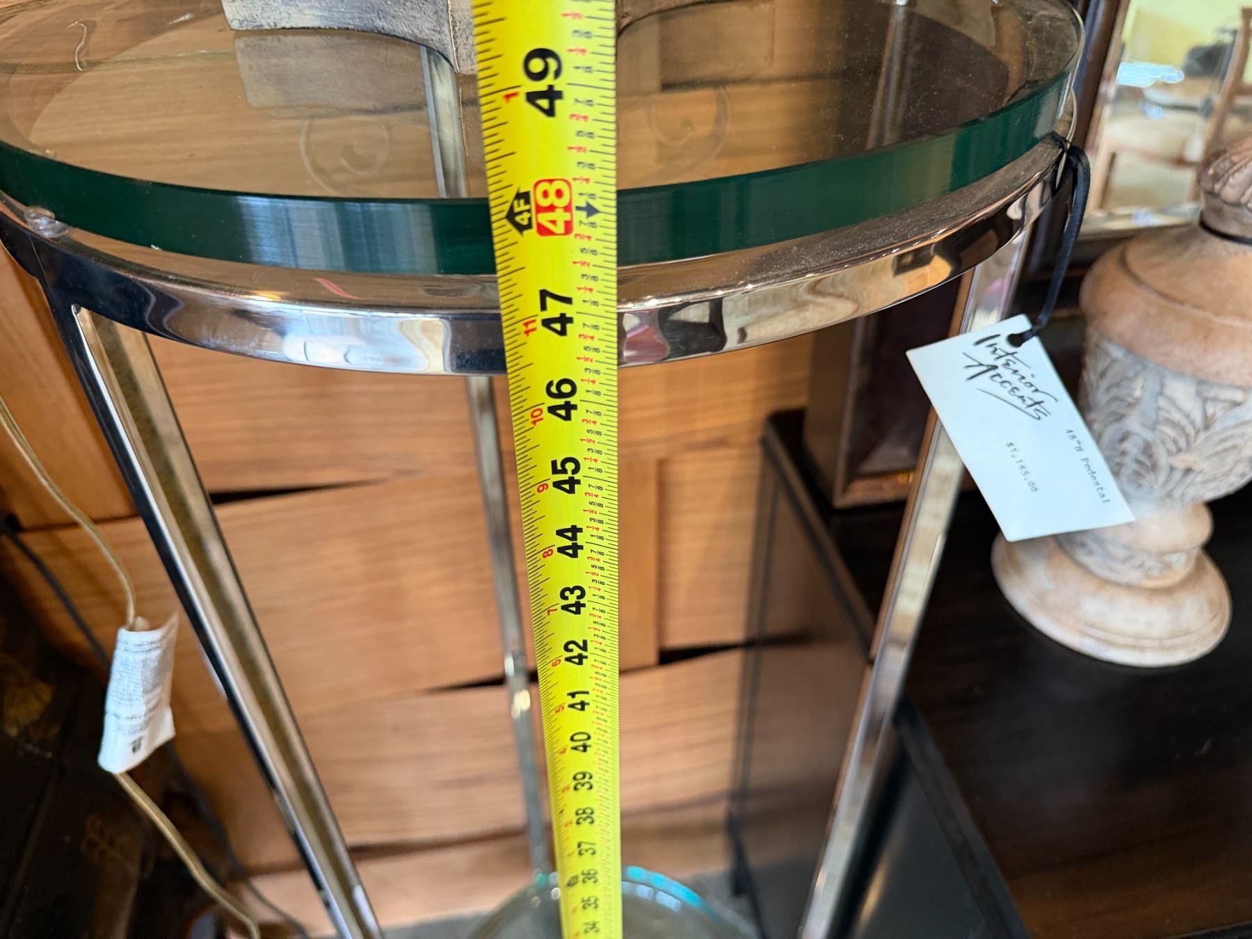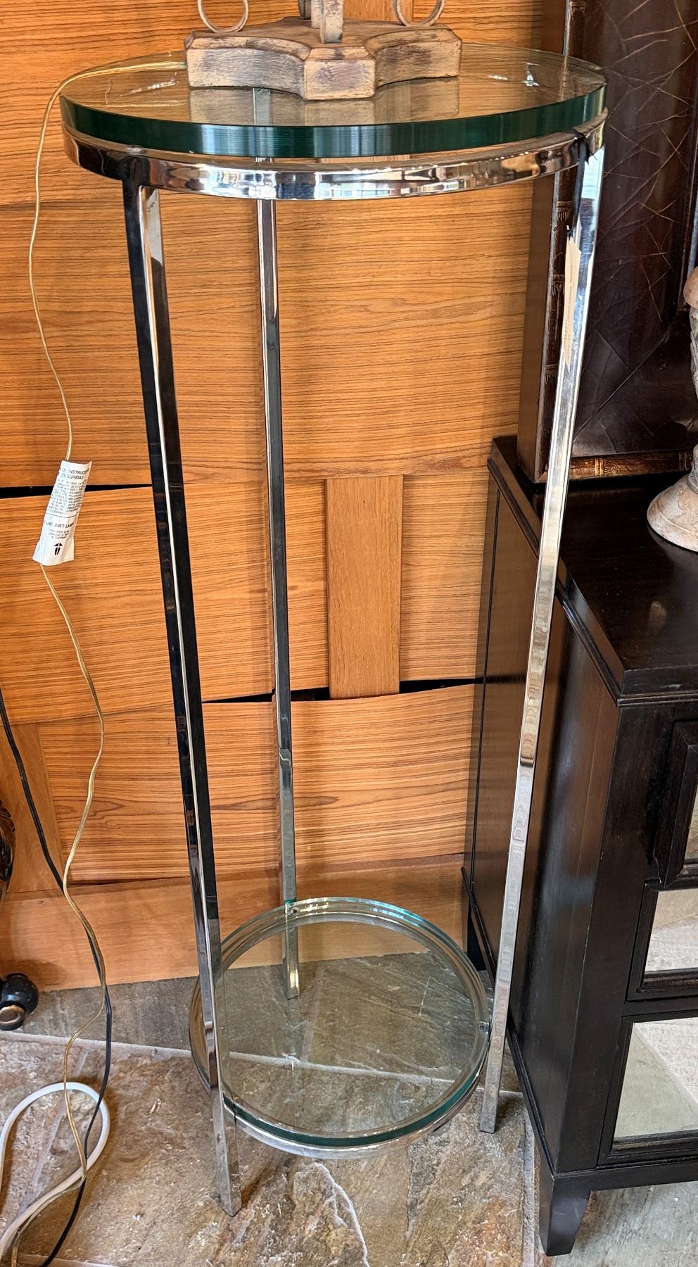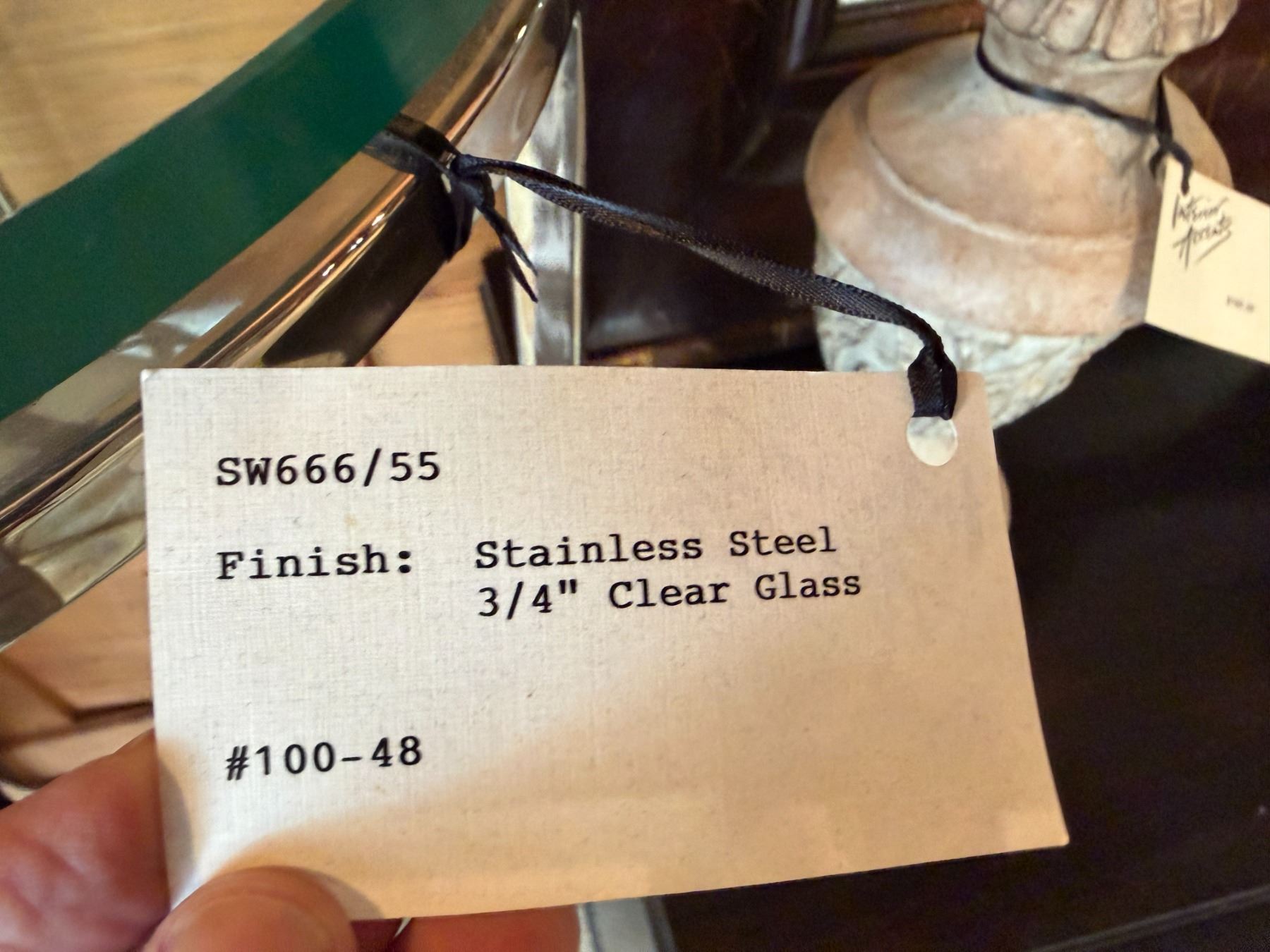 Swaim Round Stainless Steel Table w/ Glass Top & Undershelf 16" Dia, 48"H