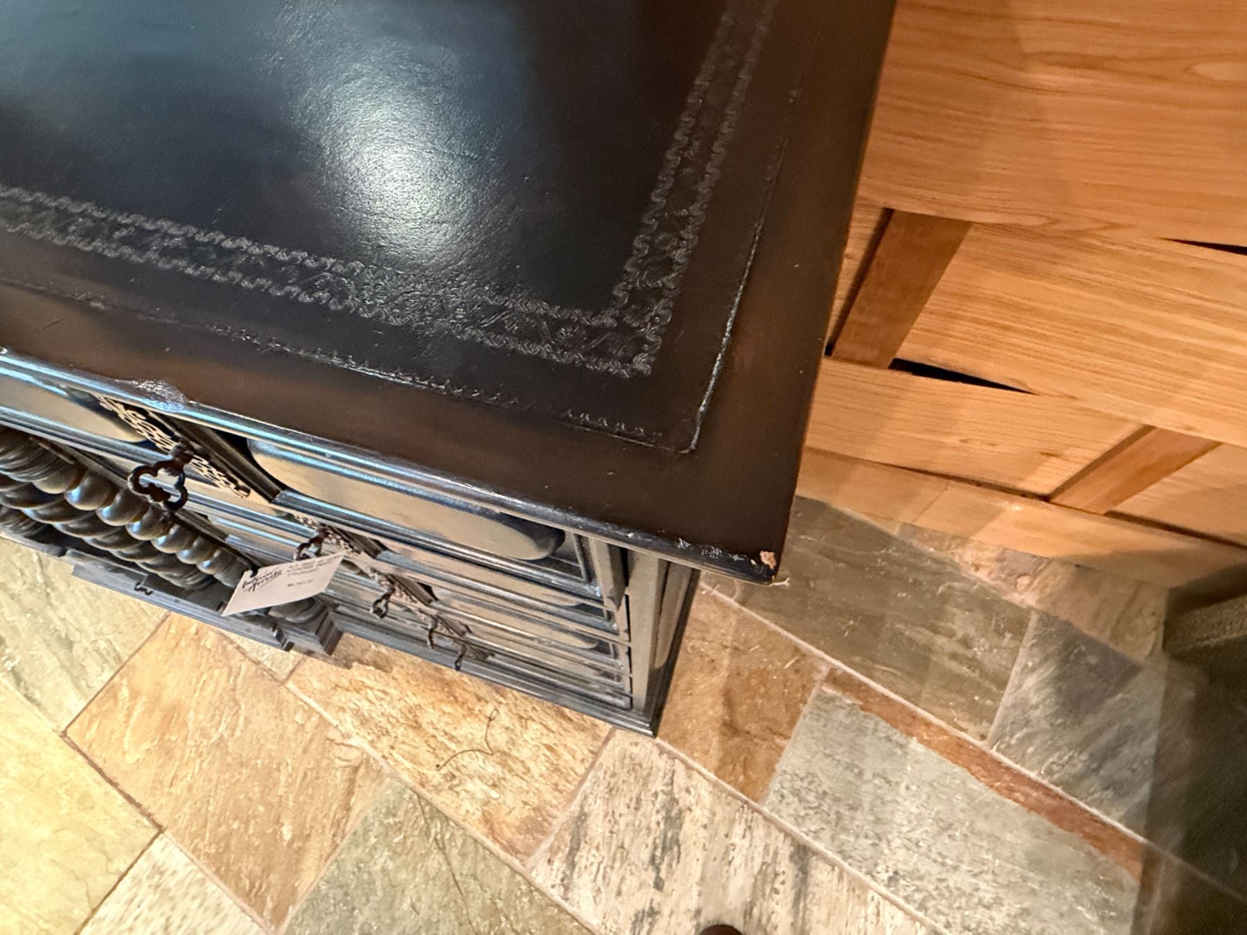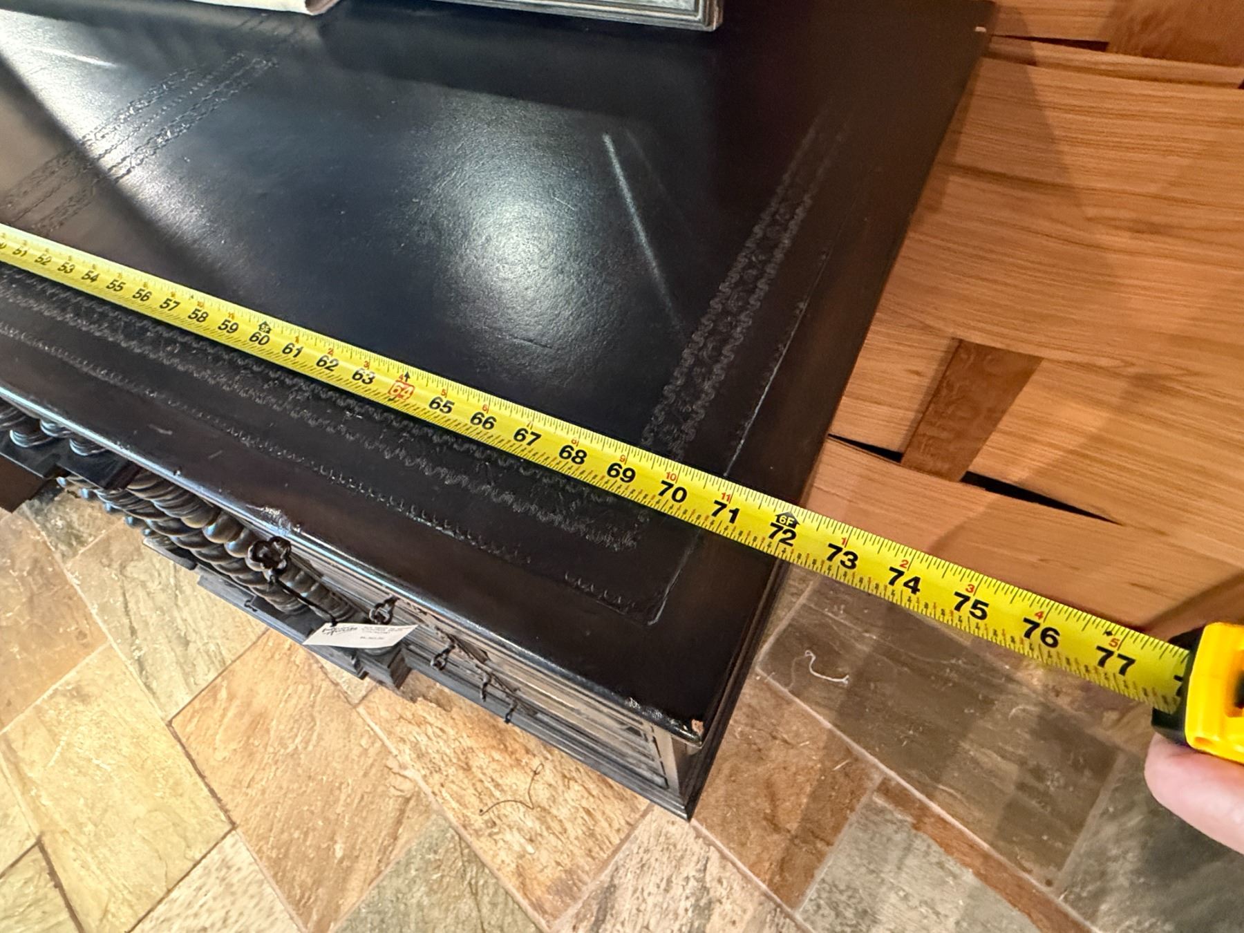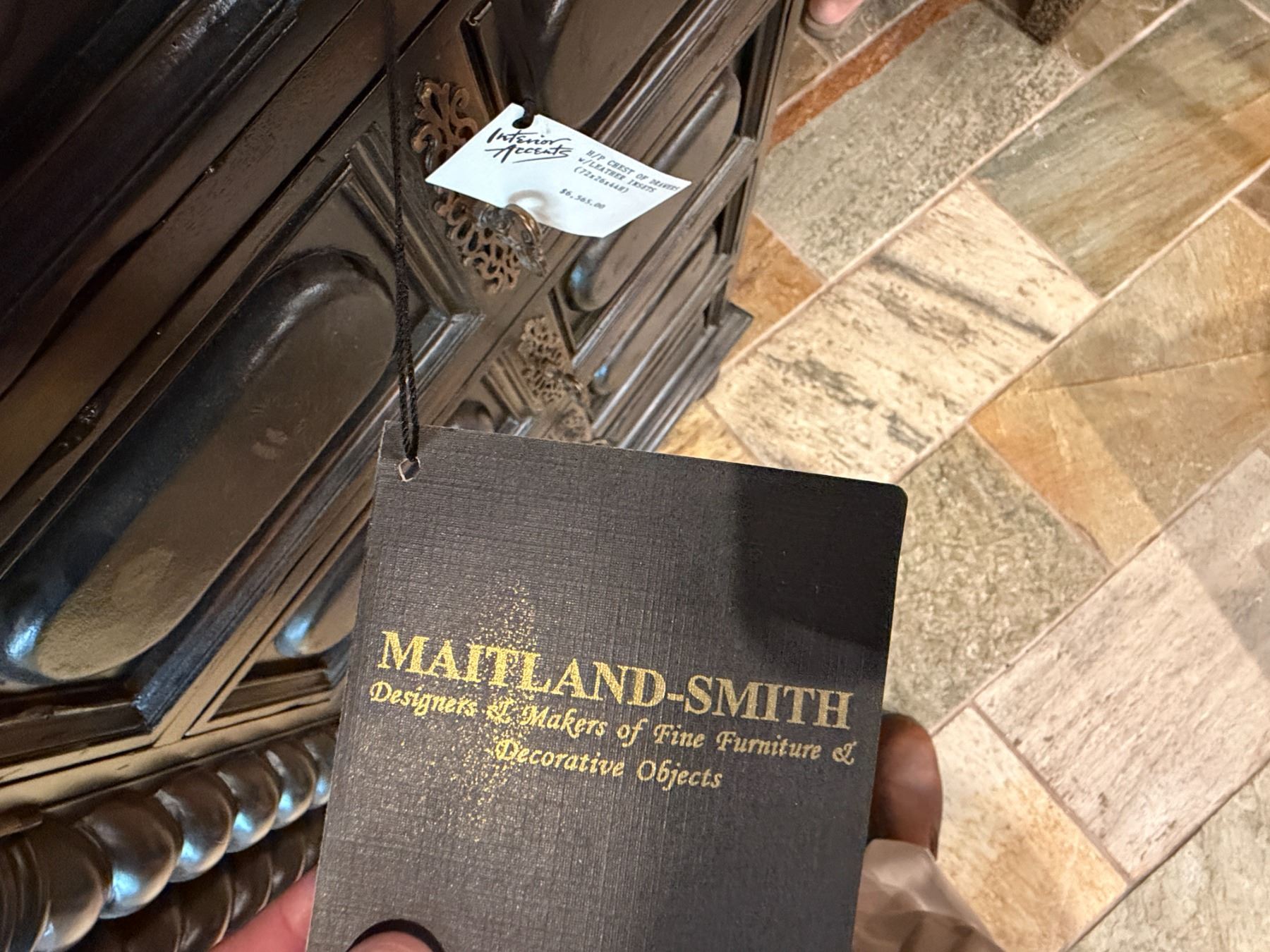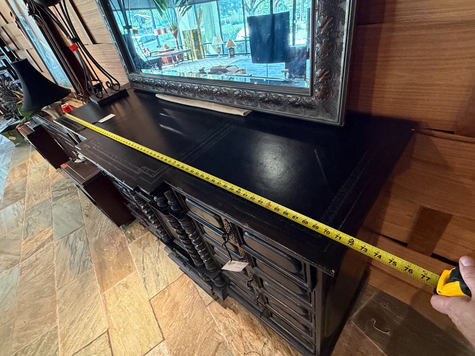 Lot 57 Maitland-Smith Carved Wooden Chest of Drawers w/ Leather Insets 72" x 23" x 44"H
