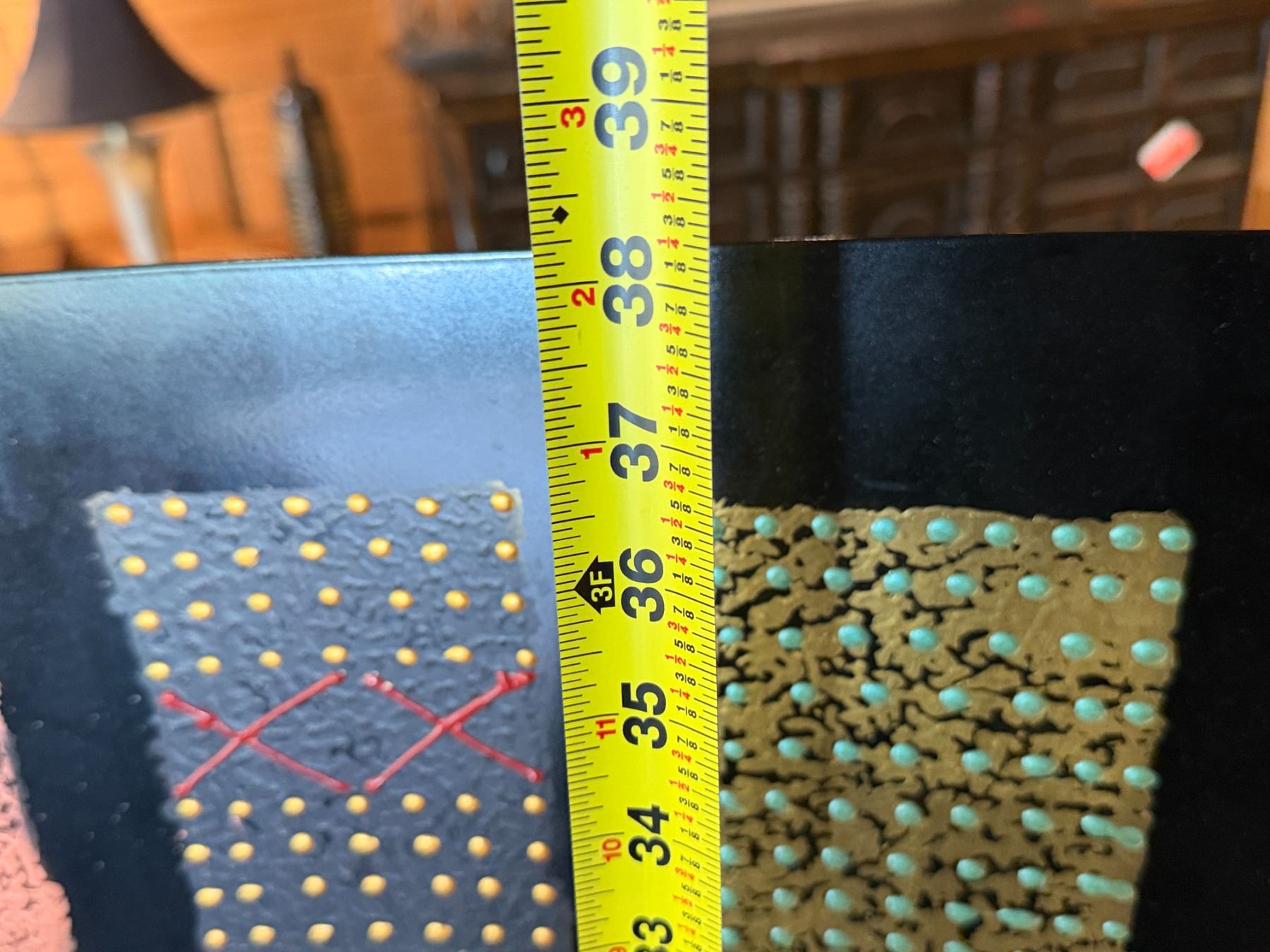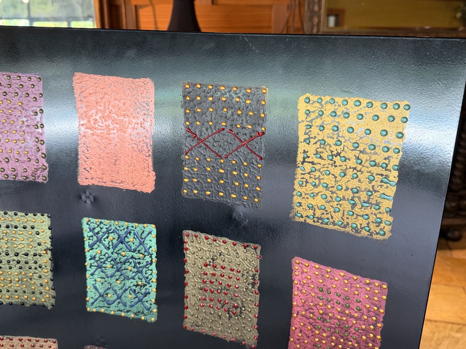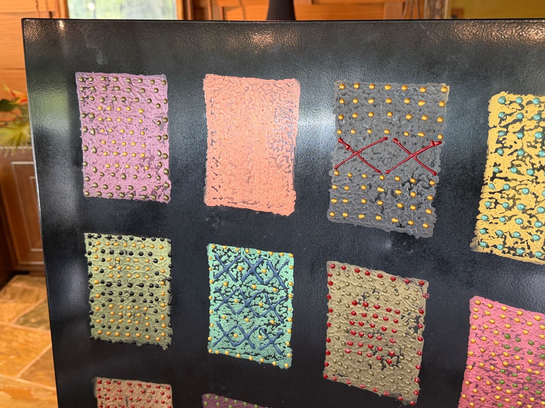 Lot 61 Contemporary Sculptural Artwork Signed by Artist w/ 12 Textured Panels on Black Metal Stand 24" x 38