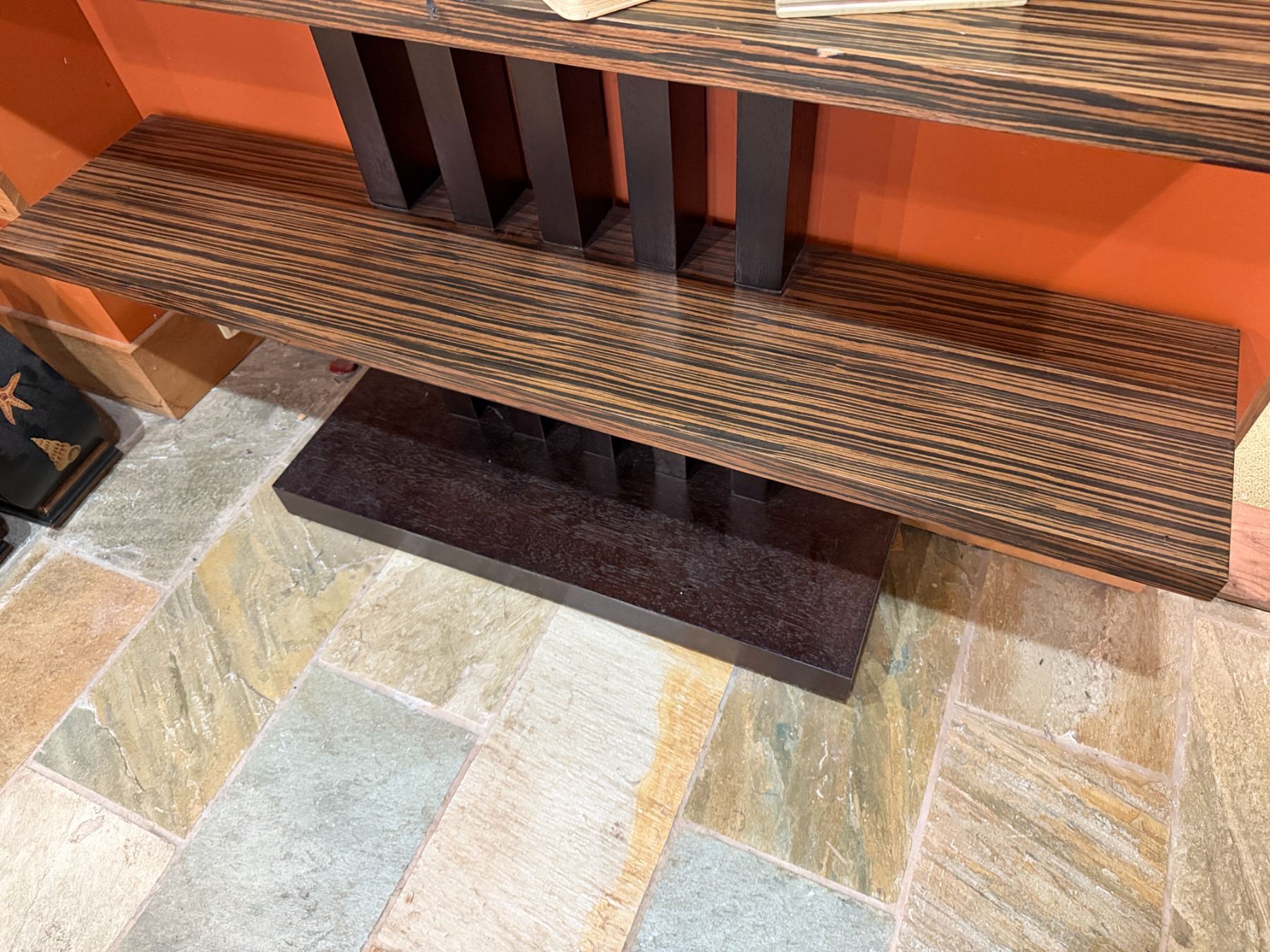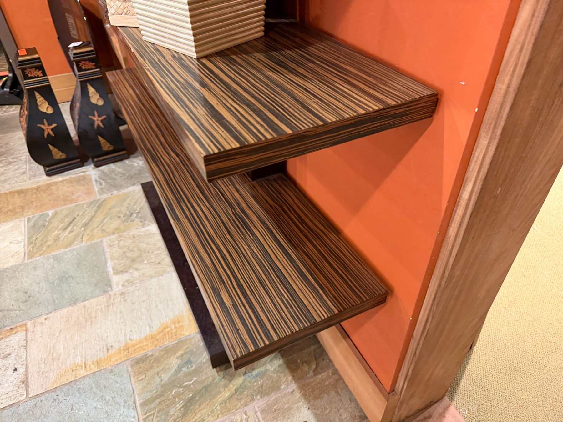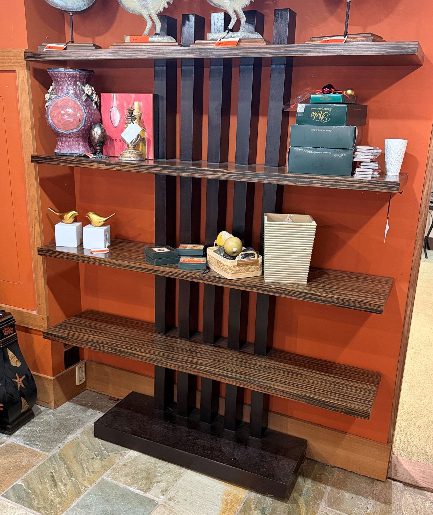 Lot 91 Adriana Hoyos Equador Wooden 4 Tier Chocolate Bookcase w/ Black Pillars (contents not included)