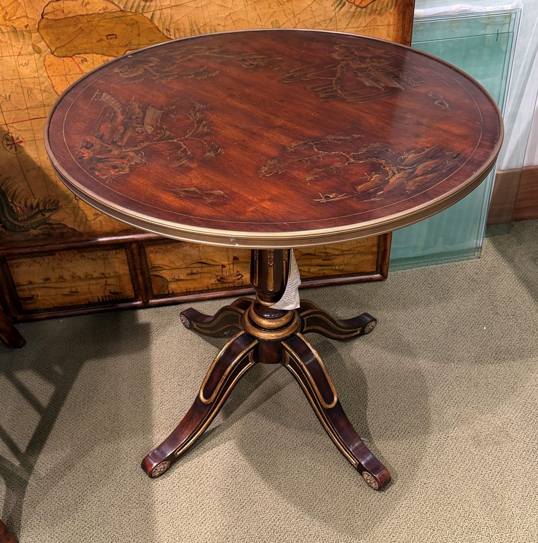 Theodore Alexander Round Side Table on Pedestal Base w/ Asian Floral Top 28" Dia, 28"H