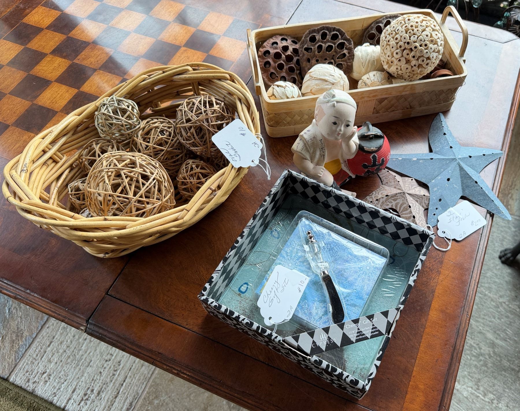 Lot 139 Qty 2 Baskets w/ Wicker Filler Balls, Figurine, Starfish Décor, etc Misc Sizes