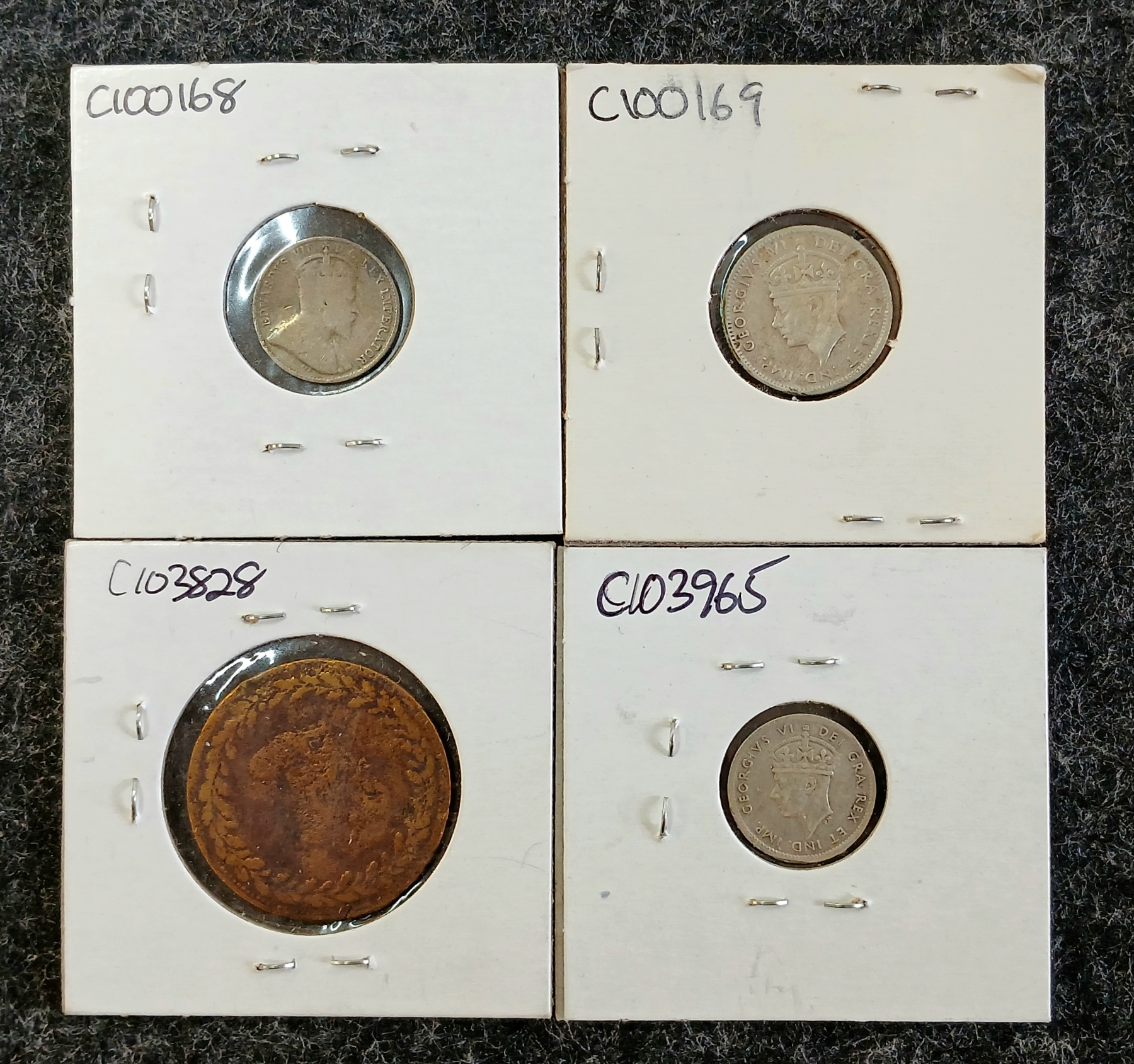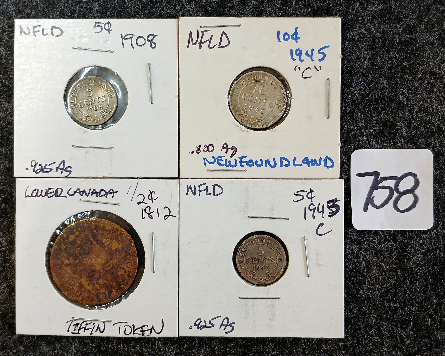 Lot 758 LOT OF 4 - 1908, 1943 & 1945 NEWFOUNDLAND 5 & 10 CENT COINS & 1812 UPPER CANADA TOKEN