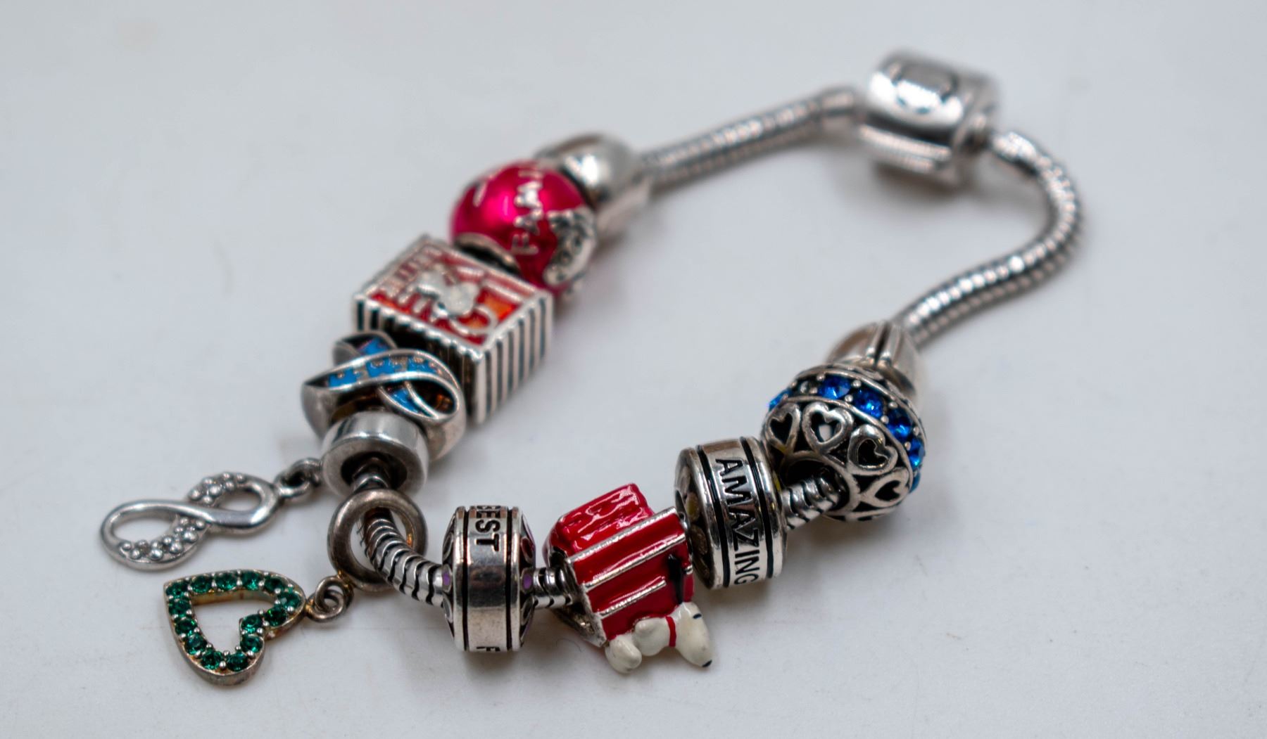 - VERIFIED (ENTIRE BRACELET INCL ALL CHARMS ARE STER SILV), PEANUTS SNOOPY THEMED, 9 CHARMS & 2 STOPPERS, STAMPED "PERSONA 925" IN 3 PLACES, IN A VELVET BRACELET GIFT BOX