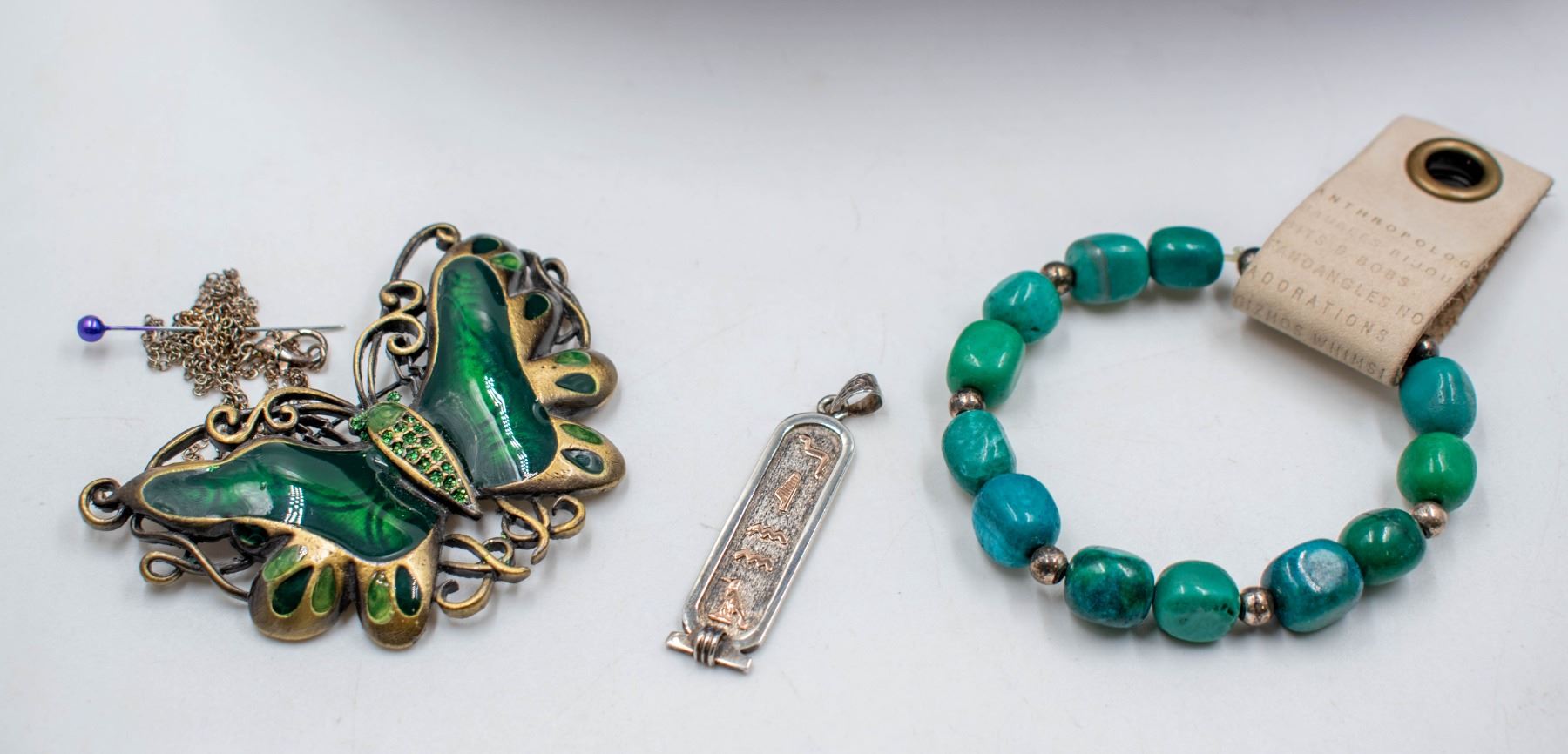 - VERIFIED, GOVT-STAMPED HALLMARK, HIEROGLYPHICS INCLD BACK HAS 26 WITH CORRESPONDING ENGL. ALPHABET, ON A SILVER-TONE CHAIN PLUS NWT $50.00 THAI ANTHROPOLOGY BRACELET, ALL ITEMS VTG, IN AN ANTHRO JEWELRY CASE-TAG ON BOTTOM $54.00 INDIA