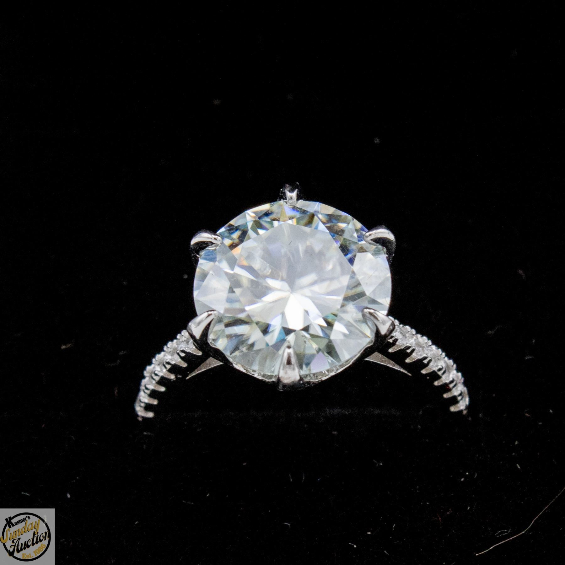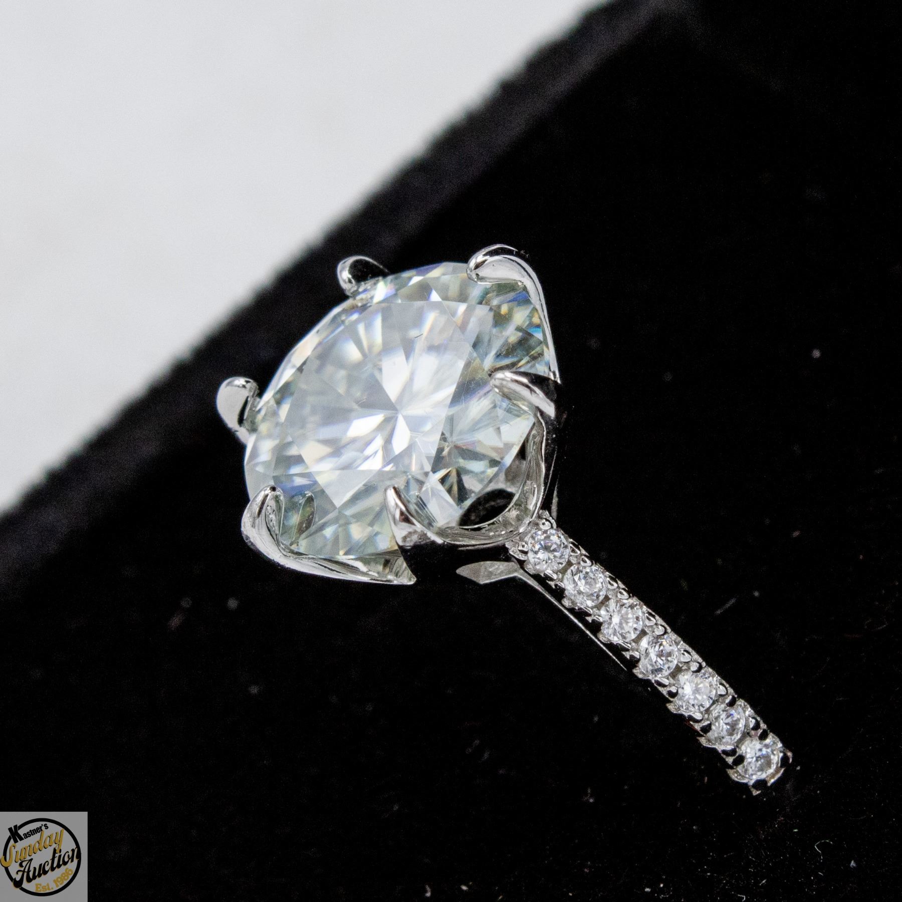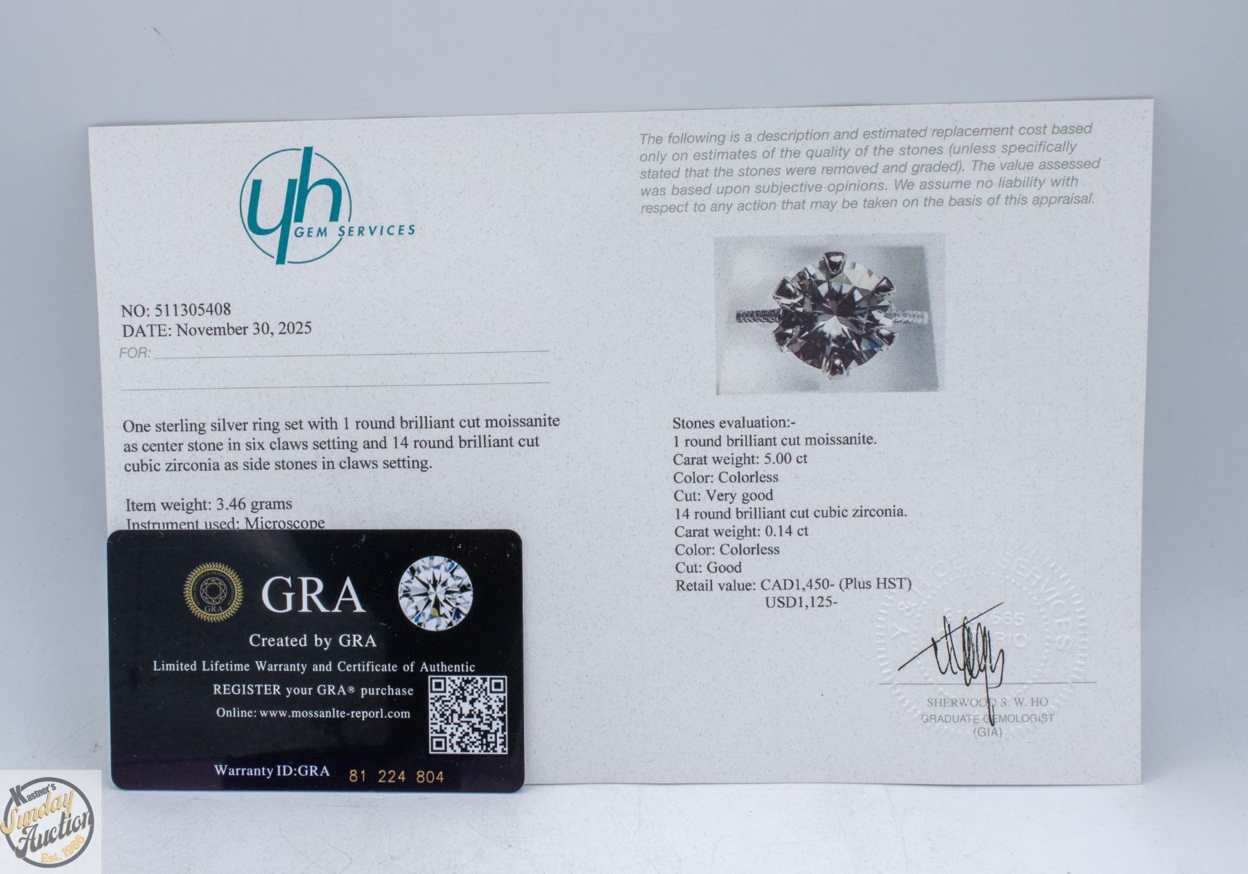 CUT MOISSANITE STONE VVS D COLOR SET IN CENTER WITH 14 ROUND BRILLIANT CUT CUBIC ZIRCONIA SET IN SHANKS SET IN 925 SILVER RING SIZE 5.5 RETAIL VALUE $1,450.00 **ALL ITEMS MUST BE REMOVED BY 5PM SATURDAY, APRIL 25TH 2026. ALL REMAINING ITEMS WILL BE SUBJECT TO A $6.00 PER DAY STORAGE CHARGE. ANY ITEMS REMAINING AFTER MONDAY, MAY 11TH 2026 WILL BE CONSIDERED FORFEITED. NO REFUNDS WILL BE ISSUED FOR FORFEITED ITEMS. TO SCHEDULE A PICK UP APPOINTMENT CLICK HERE