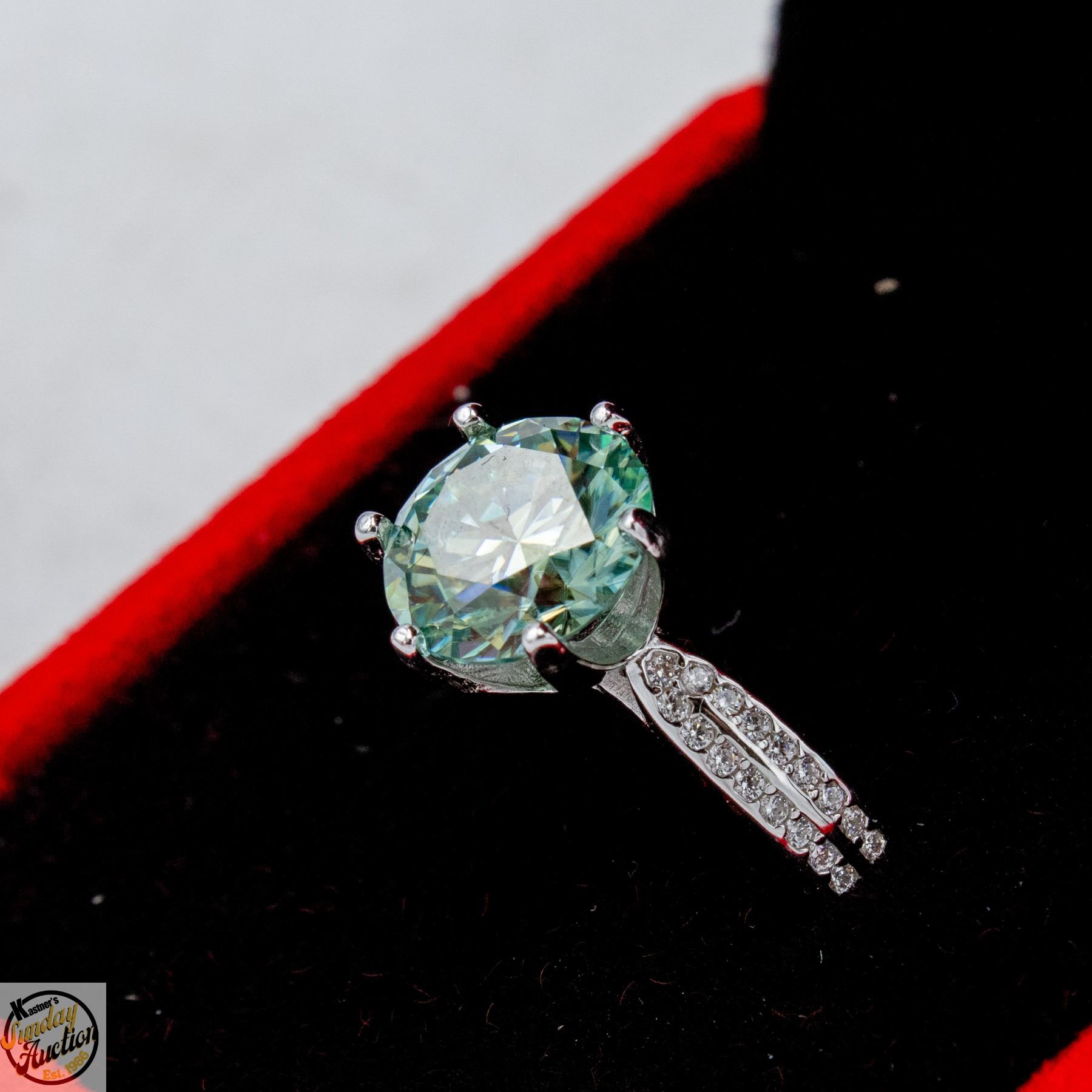 BRILLIANT CUT MOISSANITE STONE VVS BLUE COLOR WITH 34 ROUND BRILLIANT CUT CUBIC ZIRCONIA SET IN DUAL ROWS IN SHANKS SET IN 925 SILVER RING SIZE 7 RETAIL VALUE $1,275.00 **ALL ITEMS MUST BE REMOVED BY 5PM SATURDAY, APRIL 25TH 2026. ALL REMAINING ITEMS WILL BE SUBJECT TO A $6.00 PER DAY STORAGE CHARGE. ANY ITEMS REMAINING AFTER MONDAY, MAY 11TH 2026 WILL BE CONSIDERED FORFEITED. NO REFUNDS WILL BE ISSUED FOR FORFEITED ITEMS. TO SCHEDULE A PICK UP APPOINTMENT CLICK HERE