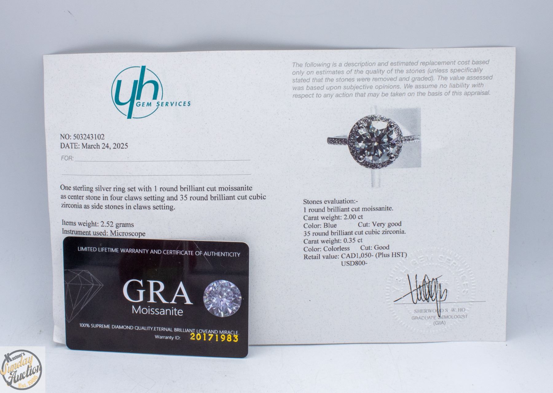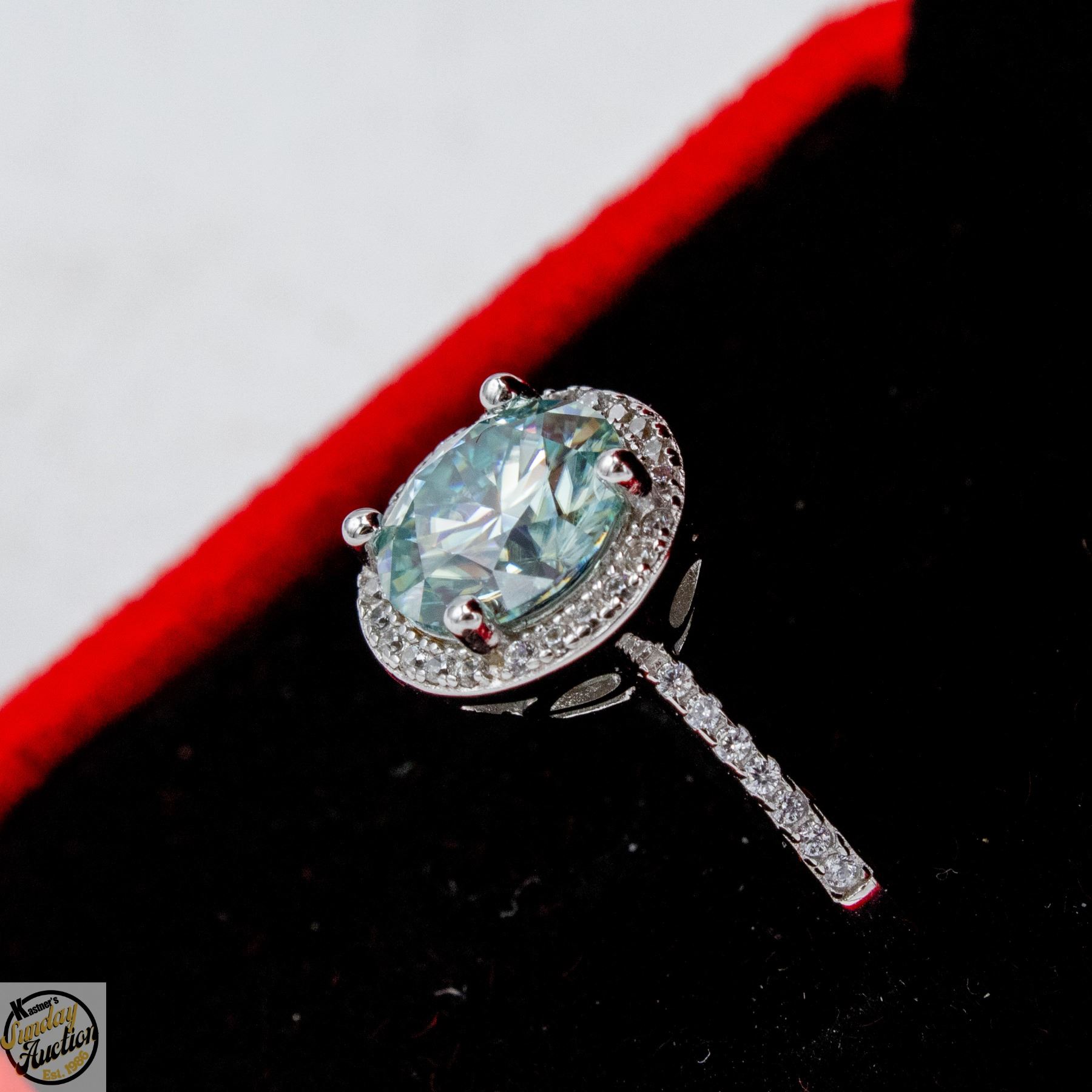 BRILLIANT CUT MOISSANITE STONE VVS BLUE COLOR WITH 35 ROUND BRILLIANT CUT CUBIC ZIRCONIA STONES SET IN ROUND HALO WITH MORE SET IN SHANKS SET IN 925 SILVER RING SIZE ADJUSTABLE RETAIL VALUE $1,050.00 **ALL ITEMS MUST BE REMOVED BY 5PM SATURDAY, APRIL 25TH 2026. ALL REMAINING ITEMS WILL BE SUBJECT TO A $6.00 PER DAY STORAGE CHARGE. ANY ITEMS REMAINING AFTER MONDAY, MAY 11TH 2026 WILL BE CONSIDERED FORFEITED. NO REFUNDS WILL BE ISSUED FOR FORFEITED ITEMS. TO SCHEDULE A PICK UP APPOINTMENT CLICK HERE