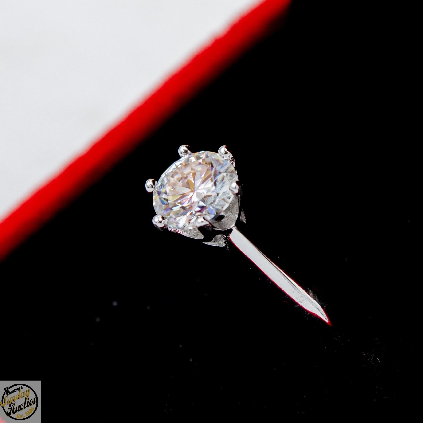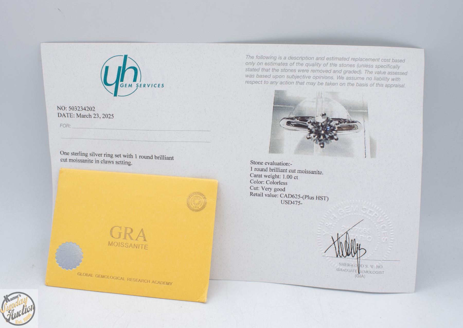MOISSANITE STONE VVS D COLOR SET IN 6 CLAW HEAD SET IN 925 SILVER RING SIZE 6.5 RETAIL VALUE $1050.00 **ALL ITEMS MUST BE REMOVED BY 5PM SATURDAY, APRIL 25TH 2026. ALL REMAINING ITEMS WILL BE SUBJECT TO A $6.00 PER DAY STORAGE CHARGE. ANY ITEMS REMAINING AFTER MONDAY, MAY 11TH 2026 WILL BE CONSIDERED FORFEITED. NO REFUNDS WILL BE ISSUED FOR FORFEITED ITEMS. TO SCHEDULE A PICK UP APPOINTMENT CLICK HERE