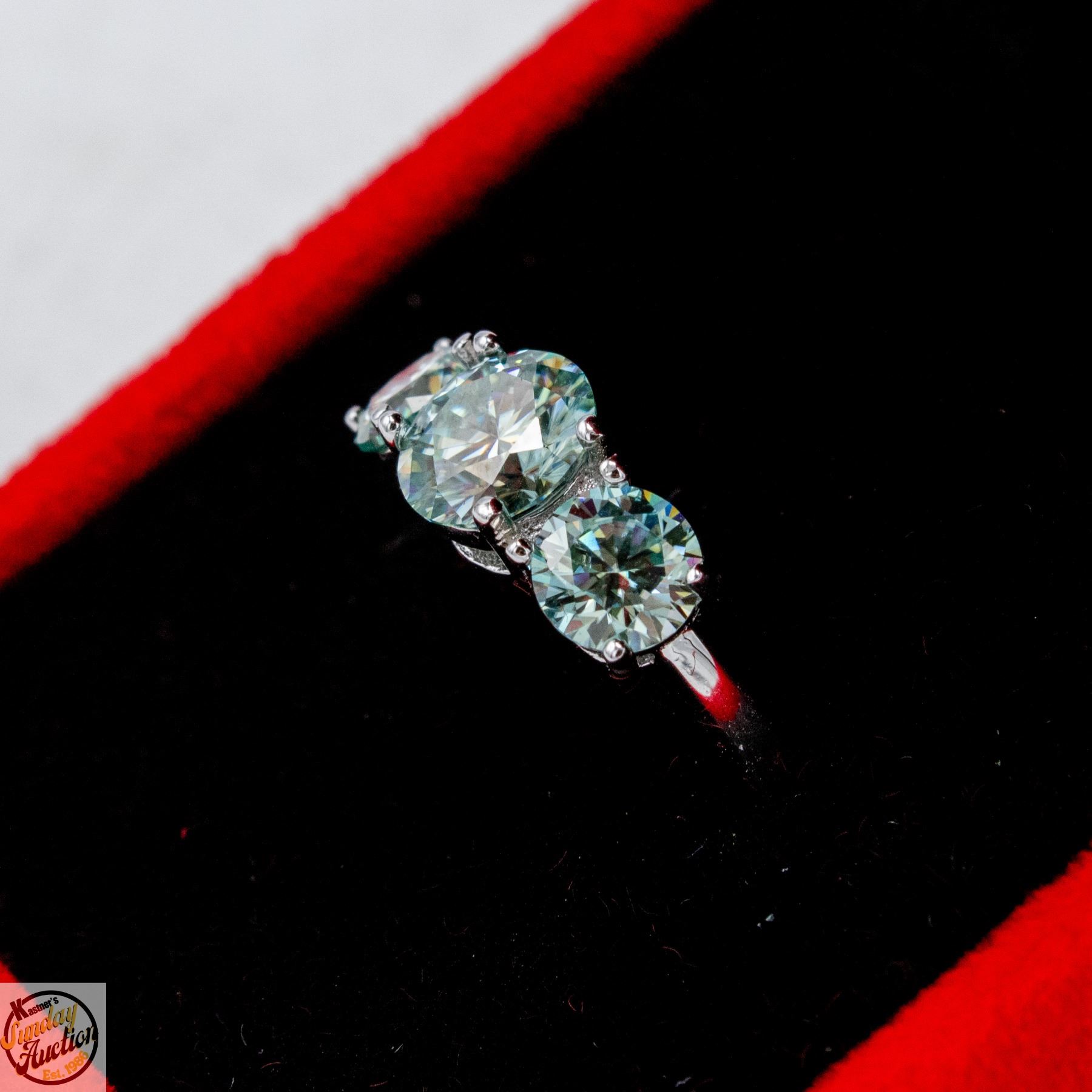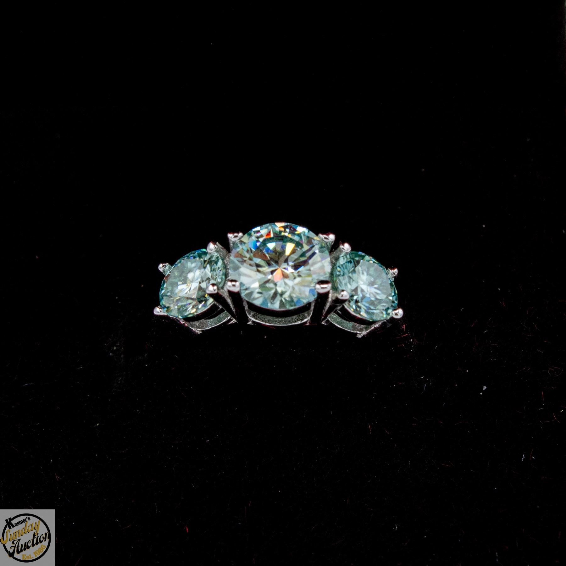 BRILLIANT CUT MOISSANITE STONES VVS BLUE COLOR WITH 1.00 CT CENTER WITH 0.50 CT SET ON EITHER SIDE SET IN 925 SILVER RING SIZE 5 RETAIL VALUE $975.00 **ALL ITEMS MUST BE REMOVED BY 5PM SATURDAY, APRIL 25TH 2026. ALL REMAINING ITEMS WILL BE SUBJECT TO A $6.00 PER DAY STORAGE CHARGE. ANY ITEMS REMAINING AFTER MONDAY, MAY 11TH 2026 WILL BE CONSIDERED FORFEITED. NO REFUNDS WILL BE ISSUED FOR FORFEITED ITEMS. TO SCHEDULE A PICK UP APPOINTMENT CLICK HERE