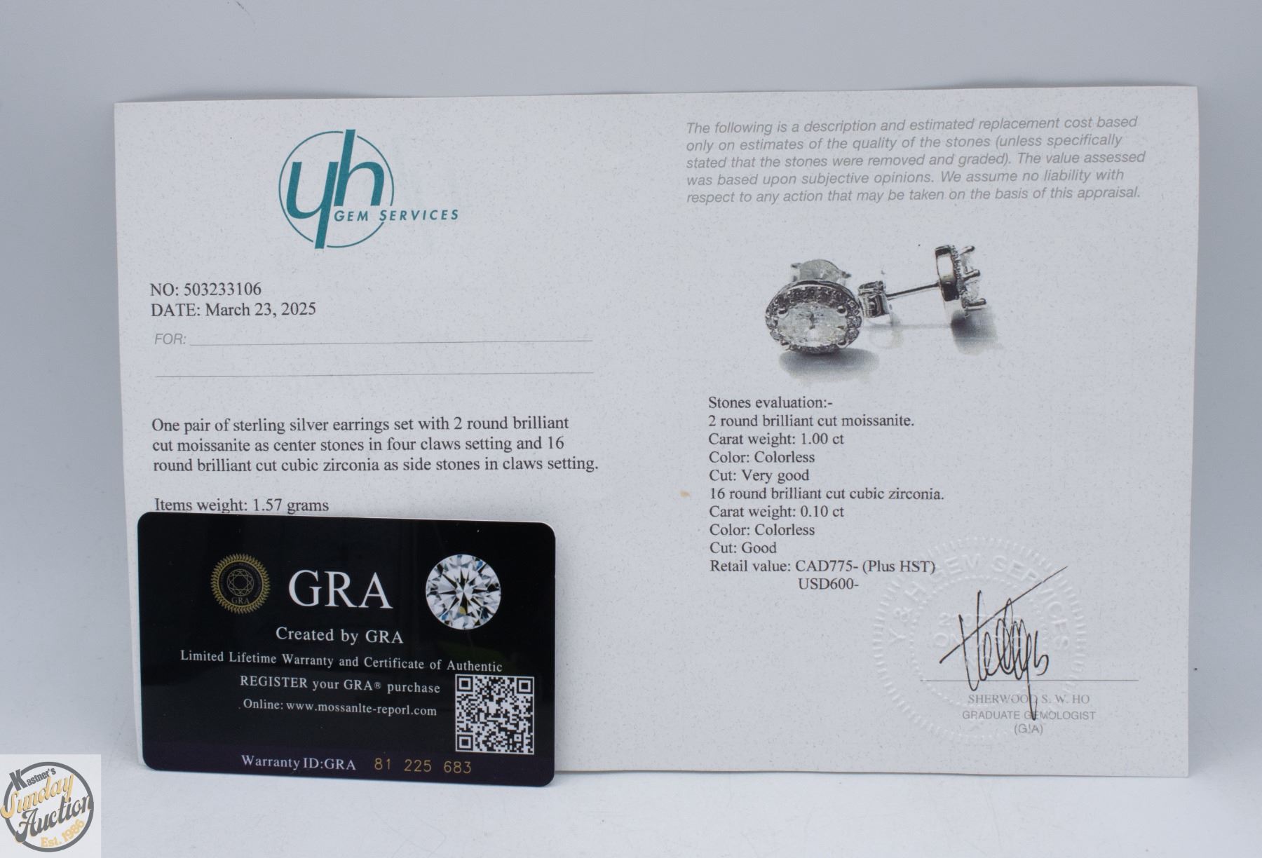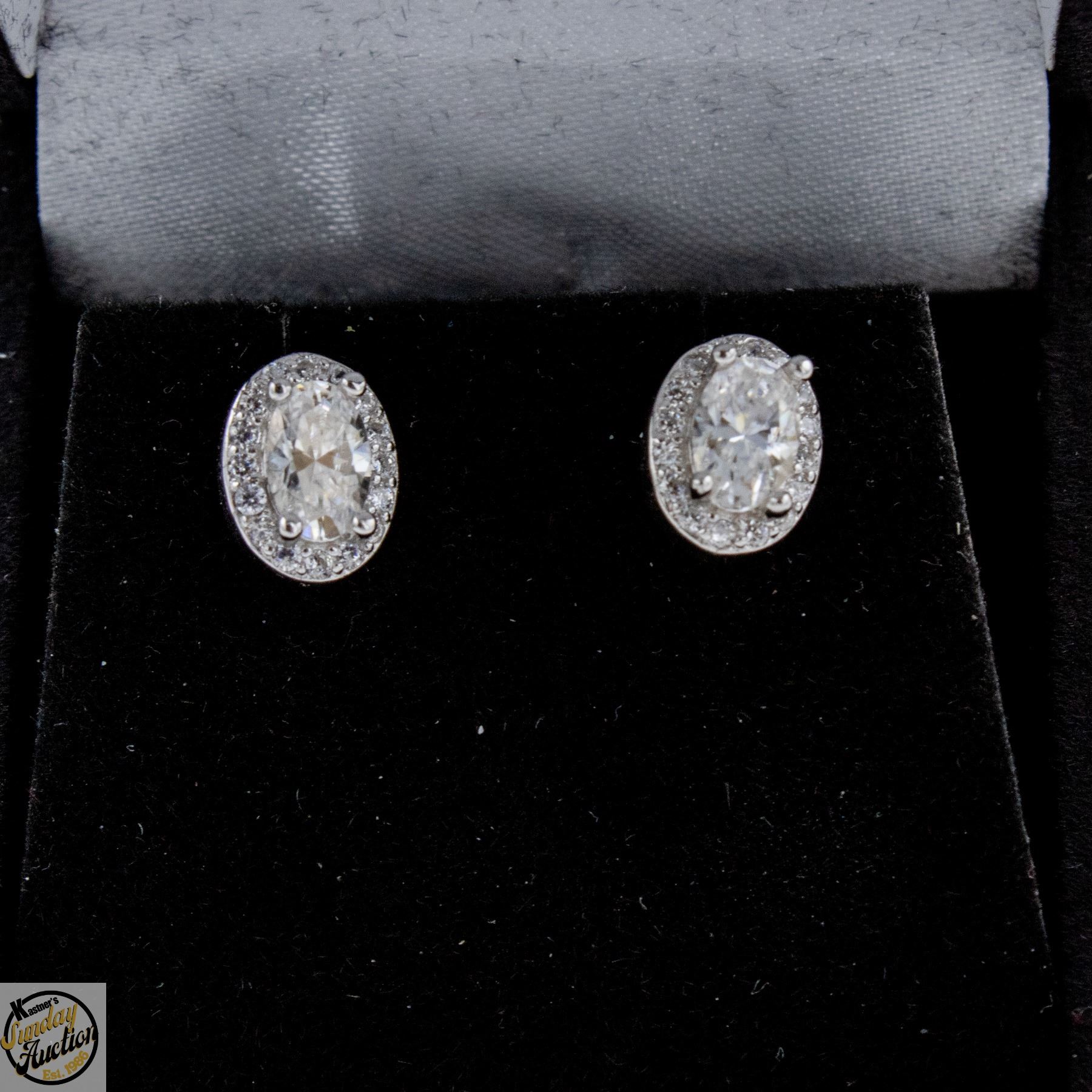 BRILLIANT CUT MOISSANITE STONE VVS D COLOR WITH 16 ROUND BRILLIANT CUT CUBIC ZIRCONIA SET IN OVAL HALO SET IN 925 SILVER EARRINGS RETAIL VALUE $775.00 **ALL ITEMS MUST BE REMOVED BY 5PM SATURDAY, APRIL 25TH 2026. ALL REMAINING ITEMS WILL BE SUBJECT TO A $6.00 PER DAY STORAGE CHARGE. ANY ITEMS REMAINING AFTER MONDAY, MAY 11TH 2026 WILL BE CONSIDERED FORFEITED. NO REFUNDS WILL BE ISSUED FOR FORFEITED ITEMS. TO SCHEDULE A PICK UP APPOINTMENT CLICK HERE