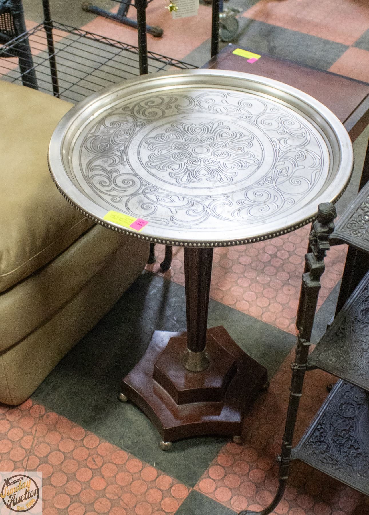 Lot 1285 ORNATE WOOD BASED METAL TOPPED SIDE TABLE H-26.5"